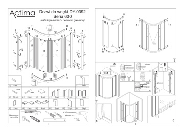 Drzwi do wnêki DY-0392 Seria 600 Instrukcja monta¿u i warunki gwarancji 3 f 6mm f 6mm 6 szt. 2 szt. 14 szt. 6 kpl. 2 szt. 2 szt. 2 szt. 2 szt. 2 kpl. 2 szt. 4 szt. 2 szt. 2 kpl. 2 kpl. f 3,5mm Wymagane narzêdzia f 6mm DY-D0392 f 3,5mm IWI:00053.02 CZYSZCZENIE I KONSERWACJA Aby utrzymaæ powierzchniê szk³a w nienagannym stanie przez wiele miesiêcy warto zastosowaæ siê do poni¿szych wskazówek: üpo ka¿dej k¹pieli nale¿y sp³ukaæ wod¹ oraz gumow¹ œci¹gaczk¹ do szyb lub miêkk¹ tkanin¹ usun¹æ wodê, üco jakiœ czas zalecamy na szyby na³o¿yæ specjaln¹ pow³okê utrudniaj¹c¹ tworzenie siê osadów kamienia np. za pomoc¹ „P³ynu do hydrofobizacji kabin prysznicowych G-600", w celu utrzymania pow³oki Clean Control, üdo codziennej pielêgnacji mo¿na stosowaæ œrodki przeznaczone do czyszczenia kabin i ³azienek np. „P³yn do czyszczenia kabin prysznicowych CH-300", üdo mycia szklanych powierzchni od zewn¹trz mo¿na wykorzystaæ p³yn do szyb lub luster, üszk³o ani elementy kabiny nie powinny byæ czyszczone preparatami szoruj¹cymi takimi jak mleczko, pasta czy proszek do prania, ünie nale¿y do czyszczenia u¿ywaæ œrodków zawieraj¹cych kwasy, aceton, formaldechydy czy benzynê, üdu¿e zanieczyszczenia (¿ó³te zacieki lub rdza) usuwamy za pomoc¹ mocnych koncentratów p³ynnych lub odkamieniacza, który rozpuszcza zanieczyszczone powierzchnie oraz jednoczeœnie je dezynfekuje. WARUNKI GWARANCJI ata 30-841 Kraków, ul. Nad Drwin¹ 10/B3 tel. (012) 657-18-87 fax (012) 657-19-96 l Wyprodukowano dla Excellent S.A. 2 i Producent na produkty Actima udziela 2 lata gwarancji licz¹c od daty zakupu. Gwarancja nie obejmuje: üuszkodzeñ mechanicznych zawinionych przez sprzedawcê, instalatora lub u¿ytkownika koñcowego, üwad i uszkodzeñ powsta³ych na skutek niew³aœciwego stosowania, üwad i uszkodzeñ powsta³ych na skutek wadliwego zainstalowania wyrobu (niezgodnych z powy¿sz¹ instrukcj¹ oraz sztuk¹ budowlan¹), üprzedwczesnego zu¿ycia siê elementów spowodowanych niew³aœciwym monta¿em, üuszkodzeñ powsta³ych na skutek osadzania siê kamienia lub niew³aœciwego czyszczenia. c an j a gw r