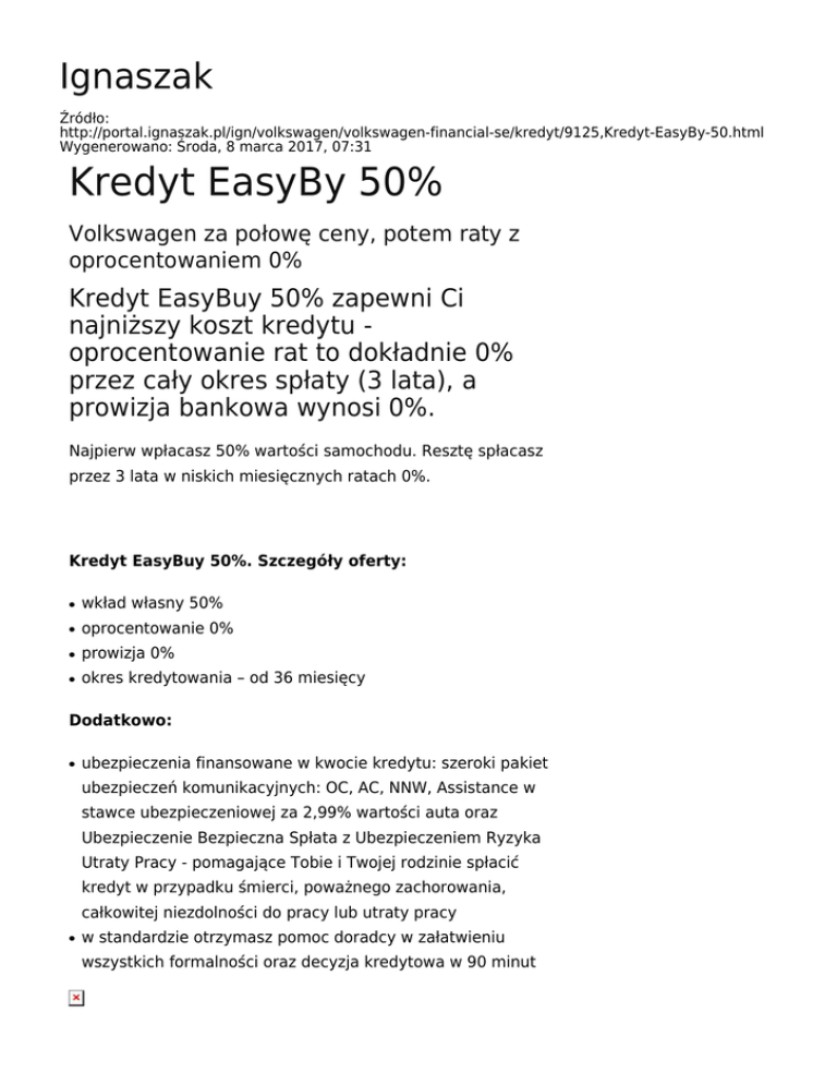 Ignaszak Źródło: http://portal.ignaszak.pl/ign/volkswagen/volkswagen-financial-se/kredyt/9125,Kredyt-EasyBy-50.html Wygenerowano: Środa, 8 marca 2017, 07:31 Kredyt EasyBy 50% Volkswagen za połowę ceny, potem raty z oprocentowaniem 0% Kredyt EasyBuy 50% zapewni Ci najniższy koszt kredytu oprocentowanie rat to dokładnie 0% przez cały okres spłaty (3 lata), a prowizja bankowa wynosi 0%. Najpierw wpłacasz 50% wartości samochodu. Resztę spłacasz przez 3 lata w niskich miesięcznych ratach 0%. Kredyt EasyBuy 50%. Szczegóły oferty: ● wkład własny 50% ● oprocentowanie 0% ● prowizja 0% ● okres kredytowania – od 36 miesięcy Dodatkowo: ● ubezpieczenia finansowane w kwocie kredytu: szeroki pakiet ubezpieczeń komunikacyjnych: OC, AC, NNW, Assistance w stawce ubezpieczeniowej za 2,99% wartości auta oraz Ubezpieczenie Bezpieczna Spłata z Ubezpieczeniem Ryzyka Utraty Pracy - pomagające Tobie i Twojej rodzinie spłacić kredyt w przypadku śmierci, poważnego zachorowania, całkowitej niezdolności do pracy lub utraty pracy ● w standardzie otrzymasz pomoc doradcy w załatwieniu wszystkich formalności oraz decyzja kredytowa w 90 minut Kredyt EasyBuy 50% – reprezentatywny przykład: cena samochodu 77 544 zł; wkład własny: 38 772 zł; całkowita kwota kredytu: 38 772 zł; stopa oprocentowania kredytu: 0%; całkowity koszt kredytu: 4 316 zł obejmuje: prowizję bankową: 0 zł, odsetki: 0 zł, ubezpieczenie komunikacyjne: 2 319 zł, ubezpieczenie spłaty kredytu: 1 997 zł; rzeczywista roczna stopa oprocentowania: 7,21%; czas obowiązywania umowy: 36 miesięcy; całkowita kwota do zapłaty przez konsumenta: 43 088 zł; wysokość raty miesięcznej: 1 197 zł. Oferta na wybrane modele Volkswagen Samochody Osobowe z rocznika 2015 przy skorzystaniu z ubezpieczenia komunikacyjnego i ubezpieczenia spłaty kredytu oferowanych przez Volkswagen Serwis Ubezpieczeniowy Sp. z o.o. Niniejsza informacja nie stanowi oferty w rozumieniu kodeksu cywilnego. Dostępność i warunki produktu mogą ulec zmianie. Warunki produktu określa umowa.