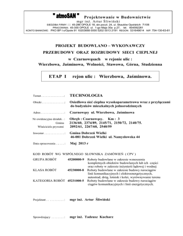 Projektowanie w Budownictwie mgr inŜ. Artur Śliwiński SIEDZIBA FIRMY: 45-286 OPOLE 18, skr.poczt. 24, ul. Skautów Opolskich 7\106 PRACOWNIA: 45-355 OPOLE ul. 1-go Maja 30a p.27, tel. 604592281 KONTO BANKOWE: PKO BP I o/Opole 91 10203668 0000 5202 0013 2191 REGON: 531649614 NIP: 754-130-63-81 PROJEKT BUDOWLANO – WYKONAWCZY PRZEBUDOWY ORAZ ROZBUDOWY SIECI CIEPLNEJ w Czarnowąsach w rejonie ulic : Wierzbowa, Jaśminowa, Wolności, Stawowa, Górna, Studzienna ETAP I rejon ulic : Wierzbowa, Jaśminowa. Temat . . . . . . . . . . . . . . .: TECHNOLOGIA Obiekt . . . . . . . . . . . . . . .: Osiedlowa sieć cieplna wysokoparametrowa wraz z przyłączami do budynków mieszkalnych jednorodzinnych Adres . . . . . . . . . . . . . . . : Czarnowąsy ul. Wierzbowa, Jaśminowa Nr ewidencyjne działek . : Gmina Właściciele prywatni Obręb : Czarnowąsy. Km : 3 2136/60, 2374/89, 2145/71, 2150/72, 2140/75. 2092/61, 2267/60, 2540/59 Inwestor . . . . . . . . . . . . . : Gmina Dobrzeń Wielki 46-081 Dobrzeń Wielki ul. Namysłowska 44 Data opracowania . .. . . . : Maj 2013 r KOD ROBÓT WG WSPÓLNEGO SŁOWNIKA ZAMÓWIEŃ ( CPV ) GRUPA ROBÓT 45200000-9 Roboty budowlane w zakresie wznoszenia kompletnych obiektów budowlanych lub ich części oraz roboty w zakresie inŜynierii lądowej i wodnej KLASA ROBÓT 45230000-8 Roboty budowlane w zakresie budowy rurociągów linii komunikacyjnych i elektroenergetycznych, autostrad, dróg, lotnisk i kolei, wyrównywanie terenu KATEGORIA ROBÓT 45231000-5 Roboty budowlane w zakresie budowy rurociągów ciągów komunikacyjnych i linii energetycznych. Projektant . . . . . . . . . . . : mgr inŜ. Artur Śliwiński Sprawdzający . . . . . . . . : mgr inŜ. Tadeusz Kucharz Opole, 20.05.2013r OŚWIADCZENIE Na podstawie art. 20 ust.4 ustawy z dnia 7 lipca 1994r. – Prawo budowlane (jednolity tekst Dz.U. z 2003 r. Nr 207, poz. 2016 z późniejszymi zmianami) OŚWIADCZAMY Ŝe Projekt budowlano - wykonawczy przebudowy oraz rozbudowy sieci cieplnej w Czarnowąsach w rejonie ulic: Wierzbowa, Jaśminowa Nr ewidencyjne działek . : Gmina Właściciele prywatni Obręb : Czarnowąsy. Km : 3 2136/60, 2374/89, 2145/71, 2150/72, 2140/75. 2092/61, 2267/60, Inwestor . . . . . . . . . . . . . : Gmina Dobrzeń Wielki 46-081 Dobrzeń Wielki ul. Namysłowska 44 Data opracowania . . . . . : Maj 2013 r Projektant . . . . . .. . . . . . : mgr inŜ. Artur Śliwiński Sprawdzający . . .. . . . . . : mgr inŜ. Tadeusz Kucharz został sporządzony zgodnie umową, obowiązującymi przepisami oraz zasadami wiedzy technicznej. Projektant: Sprawdzający: ........................................................................ (podpis i pieczęć) ……................................................................ (podpis i pieczęć)