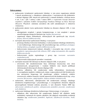 Zakres pomocy • podnoszenie świadomości społeczności lokalnej, w tym przez organizację szkoleń i innych przedsięwzięć o charakterze edukacyjnym i warsztatowym dla podmiotów z obszaru objętego LSR, innych niż realizowane w ramach działania, o którym mowa w art. 5 ust. 1 pkt 1 ustawy z dnia 7 marca 2007r. o wspieraniu rozwoju obszarów wiejskich z udziałem środków Europejskiego Funduszu Rolnego na Rzecz Rozwoju Obszarów Wiejskich: szkolenia zawodowe dla osób zatrudnionych w rolnictwie i leśnictwie; • podnoszenie jakości życia społeczności lokalnej na obszarze objętym LSR, w tym przez: ˗ udostępnianie urządzeń i sprzętu komputerowego, w tym urządzeń i sprzętu umożliwiającego dostęp do Internetu (np. kafejka internetowa), ˗ organizację imprez kulturalnych, rekreacyjnych lub sportowych (np. dożynki, festyny, koncerty folklorystyczne); • rozwijanie aktywności społeczności lokalnej, w tym przez: ˗ promocję lokalnej twórczości kulturalnej z wykorzystaniem lokalnego dziedzictwa, w tym kulturowego, historycznego lub przyrodniczego (np. publikacje promujące lokalną kulturę, przeglądy zespołów folklorystycznych), ˗ kultywowanie miejscowych tradycji, obrzędów i zwyczajów (np. dożynki, zakup mundurów reprezentacyjnych dla orkiestry OSP, zakup instrumentów dla zespołów folklorystycznych), ˗ kultywowanie języka regionalnego i gwary (np. tworzenie warsztatów rzemieślniczych), ˗ kultywowanie tradycyjnych zawodów i rzemiosła; • rozwijanie turystyki lub rekreacji na obszarze objętym LSR, w tym przez: ˗ utworzenie lub zmodernizowanie bazy informacji turystycznej oraz stron internetowych, przygotowanie i wydanie folderów oraz innych publikacji informacyjnych dotyczących obszaru objętego LSR, ˗ budowę, odbudowę lub oznakowanie małej infrastruktury turystycznej, w szczególności punktów widokowych, miejsc wypoczynkowych lub biwakowych, tras narciarstwa biegowego lub zjazdowego, szlaków wodnych, szlaków rowerowych, szlaków konnych, ścieżek spacerowych lub dydaktycznych (np. zakup rowerów dla turystów, zakup kajaków, budowa domków letniskowych); • zachowanie, odtworzenie, zabezpieczenie lub oznakowanie cennego, lokalnego dziedzictwa krajobrazowego i przyrodniczego, w szczególności obszarów objętych poszczególnymi formami ochrony przyrody, w tym obszarów Natura 2000 (np. odtworzenie zabytkowych parków, zabezpieczenie pomników przyrody, oznakowanie tych obiektów); • zachowanie lokalnego dziedzictwa kulturowego i historycznego, w tym przez: ˗ odbudowę albo odnowienie lub oznakowanie budowli lub obiektów małej architektury wpisanych do rejestru zabytków lub objętych wojewódzką ewidencją zabytków (np. oznakowanie pomników, kapliczek, zabytkowych dzwonnic, bram, mostów), ˗ odnowienie dachów lub elewacji zewnętrznych budynków wpisanych do rejestru zabytków lub objętych wojewódzką ewidencją zabytków, ˗ remont lub wyposażenie muzeów, ˗ remont lub wyposażenie świetlic wiejskich; • inicjowanie powstawania, przetwarzania lub wprowadzania na rynek produktów i usług opartych na lokalnych zasobach, tradycyjnych sektorach gospodarki lub lokalnym dziedzictwie, w tym kulturowym, historycznym lub przyrodniczym, albo podnoszenie jakości takich produktów); • wykorzystanie energii pochodzącej ze źródeł odnawialnych w celu poprawienia warunków prowadzenia działalności kulturalnej lub gospodarczej, w tym rolniczej (np. zakup kolektorów słonecznych, elektrownie wiatrowe lub wodne.