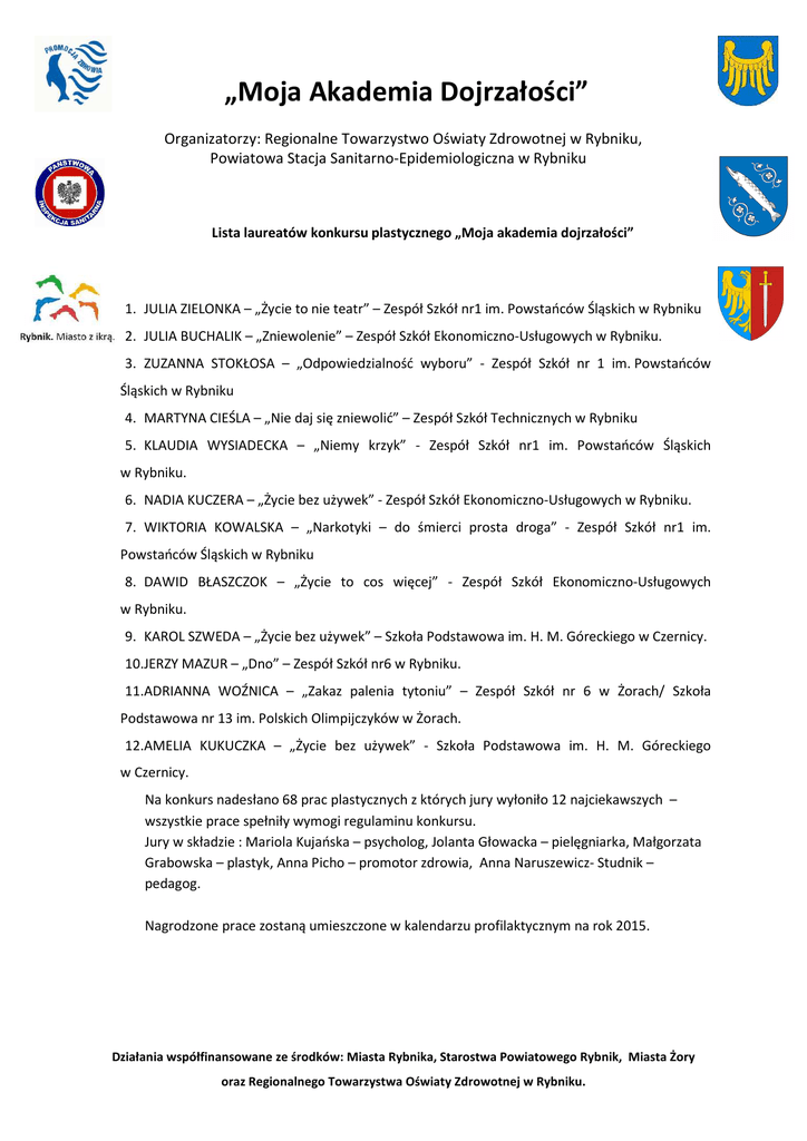 „Moja Akademia Dojrzałości” Organizatorzy: Regionalne Towarzystwo Oświaty Zdrowotnej w Rybniku, Powiatowa Stacja Sanitarno-Epidemiologiczna w Rybniku Lista laureatów konkursu plastycznego „Moja akademia dojrzałości” 1. JULIA ZIELONKA – „Życie to nie teatr” – Zespół Szkół nr1 im. Powstańców Śląskich w Rybniku 2. JULIA BUCHALIK – „Zniewolenie” – Zespół Szkół Ekonomiczno-Usługowych w Rybniku. 3. ZUZANNA STOKŁOSA – „Odpowiedzialność wyboru” - Zespół Szkół nr 1 im. Powstańców Śląskich w Rybniku 4. MARTYNA CIEŚLA – „Nie daj się zniewolić” – Zespół Szkół Technicznych w Rybniku 5. KLAUDIA WYSIADECKA – „Niemy krzyk” - Zespół Szkół nr1 im. Powstańców Śląskich w Rybniku. 6. NADIA KUCZERA – „Życie bez używek” - Zespół Szkół Ekonomiczno-Usługowych w Rybniku. 7. WIKTORIA KOWALSKA – „Narkotyki – do śmierci prosta droga” - Zespół Szkół nr1 im. Powstańców Śląskich w Rybniku 8. DAWID BŁASZCZOK – „Życie to cos więcej” - Zespół Szkół Ekonomiczno-Usługowych w Rybniku. 9. KAROL SZWEDA – „Życie bez używek” – Szkoła Podstawowa im. H. M. Góreckiego w Czernicy. 10.JERZY MAZUR – „Dno” – Zespół Szkół nr6 w Rybniku. 11.ADRIANNA WOŹNICA – „Zakaz palenia tytoniu” – Zespół Szkół nr 6 w Żorach/ Szkoła Podstawowa nr 13 im. Polskich Olimpijczyków w Żorach. 12.AMELIA KUKUCZKA – „Życie bez używek” - Szkoła Podstawowa im. H. M. Góreckiego w Czernicy. Na konkurs nadesłano 68 prac plastycznych z których jury wyłoniło 12 najciekawszych – wszystkie prace spełniły wymogi regulaminu konkursu. Jury w składzie : Mariola Kujańska – psycholog, Jolanta Głowacka – pielęgniarka, Małgorzata Grabowska – plastyk, Anna Picho – promotor zdrowia, Anna Naruszewicz- Studnik – pedagog. Nagrodzone prace zostaną umieszczone w kalendarzu profilaktycznym na rok 2015. Działania współfinansowane ze środków: Miasta Rybnika, Starostwa Powiatowego Rybnik, Miasta Żory oraz Regionalnego Towarzystwa Oświaty Zdrowotnej w Rybniku.