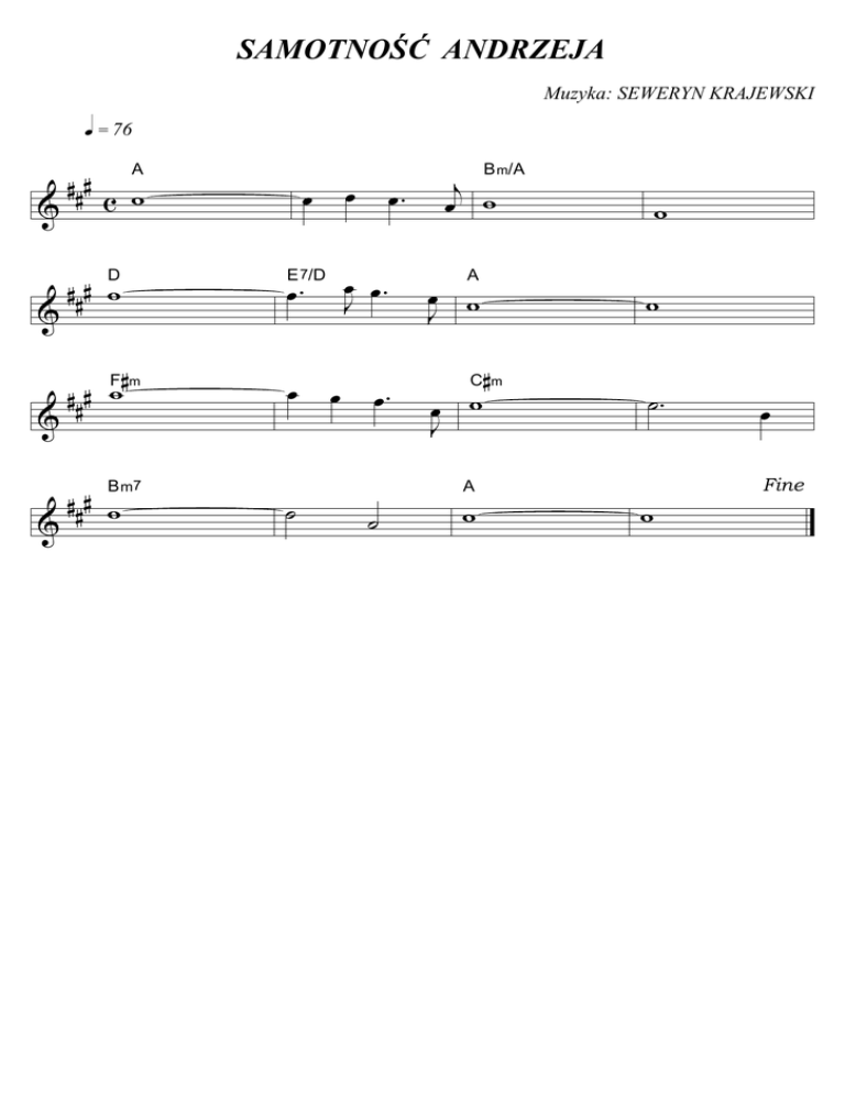 SAMOTNOŚĆ ANDRZEJA Muzyka: SEWERYN KRAJEWSKI q = 76 & ### A c w D ### w & & F #m # ## w ### w & B m7 œ œ œ. E 7/D œ ˙ œ œ. j œ w B m/A œ œ. J œ w J œ. œ w J ˙ A C A w w w #m ˙. w œ Fine