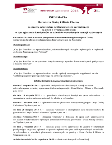 INFORMACJA Burmistrza Gminy i Miasta Chęciny w sprawie referendum ogólnokrajowego zarządzonego na dzień 6 września 2015 roku w tym zgłaszania kandydatów na członków obwodowych komisji wyborczych 6 września 2015 roku zostanie przeprowadzone referendum ogólnokrajowe. Osoby uprawnione do udziału w referendum odpowiedzą w nim na 3 pytania: Pytanie pierwsze: „Czy jest Pani/Pan za wprowadzeniem jednomandatowych okręgów wyborczych w wyborach do Sejmu Rzeczypospolitej Polskiej?” Pytanie drugie: „Czy jest Pani/Pan za utrzymaniem dotychczasowego sposobu finansowania partii politycznych z budżetu państwa?” Pytanie trzecie: „Czy jest Pani/Pan za wprowadzeniem zasady ogólnej rozstrzygania wątpliwości co do wykładni przepisów prawa podatkowego na korzyść podatnika?”. Istotne terminy i miejsce składania wniosków do dnia 7 sierpnia 2015 r. – zgłaszanie kandydatów do obwodowych komisji do spraw referendum przez podmioty uprawnione (informacja poniżej) – Urząd Gminy i Miasta w Chęcinach pok. nr 12 do dnia 16 sierpnia 2015 r. – powołanie obwodowych komisji do spraw referendum; sporządzenie spisów osób uprawnionych do udziału w referendum – do dnia 22 sierpnia 2015 r. – zgłaszanie zamiaru głosowania korespondencyjnego - Urząd Gminy i Miasta w Chęcinach pok. nr 1 do dnia 28 sierpnia 2015 r. – składanie wniosków o sporządzenie aktu pełnomocnictwa do głosowania - Urząd Gminy i Miasta w Chęcinach pok. nr 1 do dnia 1 września 2015 r. – składanie wniosków o dopisanie do spisu osób uprawnionych do udziału w referendum w wybranym przez siebie obwodzie głosowania - Urząd Gminy i Miasta w Chęcinach pok. nr 1 do dnia 3 września 2015 r. – składanie przez osoby uprawnione do udziału w referendum przebywające za granicą zgłoszeń w sprawie wpisania do spisu osób uprawnionych do udziału w referendum w obwodach głosowania utworzonych za granicą - Urząd Gminy i Miasta w Chęcinach pok. nr 1 w dniu 4 września 2015 r. o godzinie 24:00 – zakończenie kampanii referendalnej w dniu 6 września 2015 r. godz. 6:00–22:00 – głosowanie Komisje obwodowe do spraw referendum Burmistrz Gminy i Miasta Chęciny nie prowadzi rekrutacji kandydatów na członków obwodowych komisji do spraw referendum. Aby wziąć udział w pracach obwodowej komisji do spraw referendum, należy zwrócić się bezpośrednio do podmiotów uprawnionych do udziału w kampanii referendalnej w programach radiowych i telewizyjnych, których wykaz oraz ich adresy dostępne są na stronie internetowej Państwowej Komisji Wyborczej http://referendum2015.pkw.gov.pl/328_Podmioty_uprawnione Podmioty uprawnione, o których mowa w art. 48 ustawy z dnia 14 marca 2003r. o referendum ogólnokrajowym (Dz. U. z 2015 poz. 318) albo upoważnione przez nie osoby, mogą zgłosić tylko po jednym kandydacie do każdej obwodowej komisji do spraw referendum. W skład obwodowej komisji powołuje się: 1) od 4 do 8 osób spośród kandydatów zgłoszonych przez podmioty uprawnione 2) jedną osobę wskazaną przez Burmistrza spośród pracowników samorządowych gminy lub gminnych jednostek organizacyjnych. W przypadku zgłoszenia więcej niż 8 kandydatów przez uprawnione podmioty, skład osobowy obwodowej komisji do spraw referendum ustalony zostanie w drodze publicznego losowania. Jeżeli liczba zgłoszonych kandydatów przez podmioty uprawnione będzie mniejsza niż 4 uzupełnienia składu komisji obwodowej do jej minimalnego składu dokona Burmistrz spośród osób stale zamieszkałych na obszarze gminy Chęciny. Zgodnie z kalendarzem wyborczym zgłoszenia kandydatów przyjmowane będą do dnia 7 sierpnia 2015r. w godzinach pracy Urzędu Gminy i Miasta w Chęcinach tj. od godz. 7.30 - 15.15; w pokoju nr 12.Informacje telefonicznie udzielane są pod nr tel. 41 31–53-114. Sposób zgłaszania kandydatów do obwodowych komisji do spraw referendum, w referendum ogólnokrajowym oraz ich powoływania oraz wzór zgłoszenia określa rozporządzenie Ministra Spraw Wewnętrznych i Administracji z dnia 30 kwietnia 2003 r. w sprawie sposobu zgłaszania kandydatów do obwodowych komisji do spraw referendum w referendum ogólnokrajowym oraz powoływania komisji ( Dz. U. Nr 74, poz. 671 ze zm.). Powołanie obwodowych komisji do spraw referendum nastąpi do dnia 16 sierpnia 2015r. Szczegółowe informacje, dokumenty i wzory zgłoszenia udostępnione są na stronie Gminy Chęciny (www.checiny.pl) w zakładce REFERENDUM (u góry, po prawej stronie) lub bezpośrednio pod linkiem http://www.checiny.pl/asp/pl_start.asp?typ=14&menu=551&strona=1 Z up. Burmistrza GiM /-/ Paweł Brola Sekretarz GiM Urzędnik Wybroczy