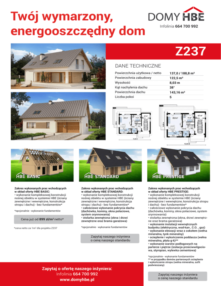 Twój wymarzony, energooszczędny dom Infolinia 664 700 992 Z237 DANE TECHNICZNE Zakres wykonanych prac wchodzących w skład oferty HBE BASIC: • wykonanie kompleksowej konstrukcji nośnej obiektu w systemie HBE (ściany zewnętrzne i wewnętrzne, konstrukcja stropu i dachu) - bez fundamentów* *opcjonalnie - wykonanie fundamentów Cena już od 899 zł/m2 netto* *cena netto za 1m2 dla projektu Z237 Powierzchnia użytkowa / netto 137,0 / 188,8 m² Powierzchnia zabudowy 122,5 m² Wysokość 8,03 m Kąt nachylenia dachu 38° Powierzchnia dachu 143,16 m² Liczba pokoi 5 Zakres wykonanych prac wchodzących w skład oferty HBE STANDARD: • wykonanie kompleksowej konstrukcji nośnej obiektu w systemie HBE (ściany zewnętrzne i wewnętrzne, konstrukcja stropu i dachu) - bez fundamentów* • całościowe wykonanie pokrycia dachu (dachówka, kominy, okna połaciowe, system orynnowania) • stolarka zewnętrzna (okna i drzwi zewnętrzne oraz brama garażowa) *opcjonalnie - wykonanie fundamentów Zapytaj naszego inżyniera o cenę naszego standardu Zapytaj o ofertę naszego inżyniera: Infolinia 664 700 992 www.domyhbe.pl Zakres wykonanych prac wchodzących w skład oferty HBE PRESTIGE: • wykonanie kompleksowej konstrukcji nośnej obiektu w systemie HBE (ściany zewnętrzne i wewnętrzne, konstrukcja stropu i dachu) - bez fundamentów* • całościowe wykonanie pokrycia dachu (dachówka, kominy, okna połaciowe, system orynnowania) • stolarka zewnętrzna (okna, drzwi zewnętrzne oraz brama garażowa) • wykonanie instalacji wewnętrznych budynku (elektryczna, wod-kan , C.O. , gaz) • wykonanie elewacji wraz z cokołem (wełna mineralna, tynk mineralny) • ocieplenie i wykończenie poddasza (wełna mineralna, płyta g-k)** • wykonanie warstw podłogowych na parterze i piętrze (izolacja przeciwwilgociowa, styropian, wylewka cementowa) *opcjonalnie - wykonanie fundamentów ** w przypadku domów parterowych ocieplenie i wykończenie stropu (wełna mineralna, sufit podwieszany) Zapytaj naszego inżyniera o cenę naszego standardu
