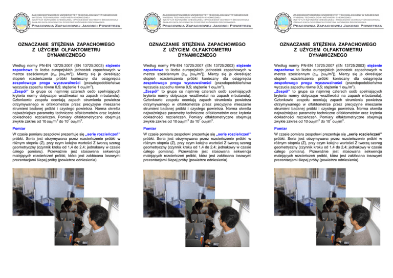 OZNACZANIE STĘśENIA ZAPACHOWEGO Z UśYCIEM OLFAKTOMETRU DYNAMICZNEGO OZNACZANIE STĘśENIA ZAPACHOWEGO Z UśYCIEM OLFAKTOMETRU DYNAMICZNEGO OZNACZANIE STĘśENIA ZAPACHOWEGO Z UśYCIEM OLFAKTOMETRU DYNAMICZNEGO Według normy PN-EN 13725:2007 (EN 13725:2003) stęŜenie zapachowe to liczba europejskich jednostek zapachowych w metrze sześciennym (cod [ouE/m3]). Mierzy się je określając stopień rozcieńczenia próbki konieczny dla osiągnięcia zespołowego progu wyczuwalności (prawdopodobieństwo wyczucia zapachu równe 0,5; stęŜenie 1 ouE/m3). „Zespół” to grupa co najmniej czterech osób spełniających kryteria normy dotyczące wraŜliwości na zapach n-butanolu). Członkowie zespołu oceniają zapach strumienia powietrza otrzymywanego w olfaktometrze przez precyzyjne mieszanie strumieni badanej próbki i czystego powietrza. Norma określa najwaŜniejsze parametry techniczne olfaktometrów oraz kryteria dokładności rozcieńczeń. Pomiary olfaktometryczne obejmują zwykle zakres od 10 ouE/m3 do 107 ouE/m3. Według normy PN-EN 13725:2007 (EN 13725:2003) stęŜenie zapachowe to liczba europejskich jednostek zapachowych w metrze sześciennym (cod [ouE/m3]). Mierzy się je określając stopień rozcieńczenia próbki konieczny dla osiągnięcia zespołowego progu wyczuwalności (prawdopodobieństwo wyczucia zapachu równe 0,5; stęŜenie 1 ouE/m3). „Zespół” to grupa co najmniej czterech osób spełniających kryteria normy dotyczące wraŜliwości na zapach n-butanolu). Członkowie zespołu oceniają zapach strumienia powietrza otrzymywanego w olfaktometrze przez precyzyjne mieszanie strumieni badanej próbki i czystego powietrza. Norma określa najwaŜniejsze parametry techniczne olfaktometrów oraz kryteria dokładności rozcieńczeń. Pomiary olfaktometryczne obejmują zwykle zakres od 10 ouE/m3 do 107 ouE/m3. Według normy PN-EN 13725:2007 (EN 13725:2003) stęŜenie zapachowe to liczba europejskich jednostek zapachowych w metrze sześciennym (cod [ouE/m3]). Mierzy się je określając stopień rozcieńczenia próbki konieczny dla osiągnięcia zespołowego progu wyczuwalności (prawdopodobieństwo wyczucia zapachu równe 0,5; stęŜenie 1 ouE/m3). „Zespół” to grupa co najmniej czterech osób spełniających kryteria normy dotyczące wraŜliwości na zapach n-butanolu). Członkowie zespołu oceniają zapach strumienia powietrza otrzymywanego w olfaktometrze przez precyzyjne mieszanie strumieni badanej próbki i czystego powietrza. Norma określa najwaŜniejsze parametry techniczne olfaktometrów oraz kryteria dokładności rozcieńczeń. Pomiary olfaktometryczne obejmują zwykle zakres od 10 ouE/m3 do 107 ouE/m3. Pomiar Pomiar Pomiar W czasie pomiaru zespołowi prezentuje się „serię rozcieńczeń” próbki. Seria jest otrzymywana przez rozcieńczenie próbki w róŜnym stopniu (Z), przy czym kolejne wartości Z tworzą szereg geometryczny (czynnik kroku od 1,4 do 2,4; jednakowy w czasie całego pomiaru). PrzewaŜnie jest stosowana sekwencja malejących rozcieńczeń próbki, która jest zakłócana losowymi prezentacjami ślepej próby (powietrze odniesienia). W czasie pomiaru zespołowi prezentuje się „serię rozcieńczeń” próbki. Seria jest otrzymywana przez rozcieńczenie próbki w róŜnym stopniu (Z), przy czym kolejne wartości Z tworzą szereg geometryczny (czynnik kroku od 1,4 do 2,4; jednakowy w czasie całego pomiaru). PrzewaŜnie jest stosowana sekwencja malejących rozcieńczeń próbki, która jest zakłócana losowymi prezentacjami ślepej próby (powietrze odniesienia). W czasie pomiaru zespołowi prezentuje się „serię rozcieńczeń” próbki. Seria jest otrzymywana przez rozcieńczenie próbki w róŜnym stopniu (Z), przy czym kolejne wartości Z tworzą szereg geometryczny (czynnik kroku od 1,4 do 2,4; jednakowy w czasie całego pomiaru). PrzewaŜnie jest stosowana sekwencja malejących rozcieńczeń próbki, która jest zakłócana losowymi prezentacjami ślepej próby (powietrze odniesienia). Prezentacja całej „serii rozcieńczeń” wszystkim oceniającym jest określana jako „cykl”. Jeden „pomiar” składa się z co najmniej trzech cykli Prezentacja całej „serii rozcieńczeń” wszystkim oceniającym jest określana jako „cykl”. Jeden „pomiar” składa się z co najmniej trzech cykli Prezentacja całej „serii rozcieńczeń” wszystkim oceniającym jest określana jako „cykl”. Jeden „pomiar” składa się z co najmniej trzech cykli Wynikiem serii jest wartość ZITE, czyli średnia geometryczna między ostatnim ZNIE (nie czuję) i pierwszym z co najmniej dwóch kolejnych ZTAK (czuję). Po zakończeniu pomiaru oblicza się średnią geometryczną z wartości ZITE zgromadzonych we wszystkich cyklach (lub z pominięciem pierwszego) oraz wartości ∆Z, czyli ilorazy: Wynikiem serii jest wartość ZITE, czyli średnia geometryczna między ostatnim ZNIE (nie czuję) i pierwszym z co najmniej dwóch kolejnych ZTAK (czuję). Po zakończeniu pomiaru oblicza się średnią geometryczną z wartości ZITE zgromadzonych we wszystkich cyklach (lub z pominięciem pierwszego) oraz wartości ∆Z, czyli ilorazy: Wynikiem serii jest wartość ZITE, czyli średnia geometryczna między ostatnim ZNIE (nie czuję) i pierwszym z co najmniej dwóch kolejnych ZTAK (czuję). Po zakończeniu pomiaru oblicza się średnią geometryczną z wartości ZITE zgromadzonych we wszystkich cyklach (lub z pominięciem pierwszego) oraz wartości ∆Z, czyli ilorazy: Z ITE /ZITE lub –ZITE / Z ITE . Z ITE /ZITE lub –ZITE / Z ITE . Z ITE /ZITE lub –ZITE / Z ITE . Odrzuca się wyniki osób, których wyniki nie spełniają kryterium: – 5 ≤ ∆Z ≤ 5. Pomiar jest waŜny, jeŜeli po weryfikacji pozostaje nie mniej niŜ czterech członków zespołu,. Odrzuca się wyniki osób, których wyniki nie spełniają kryterium: – 5 ≤ ∆Z ≤ 5. Pomiar jest waŜny, jeŜeli po weryfikacji pozostaje nie mniej niŜ czterech członków z