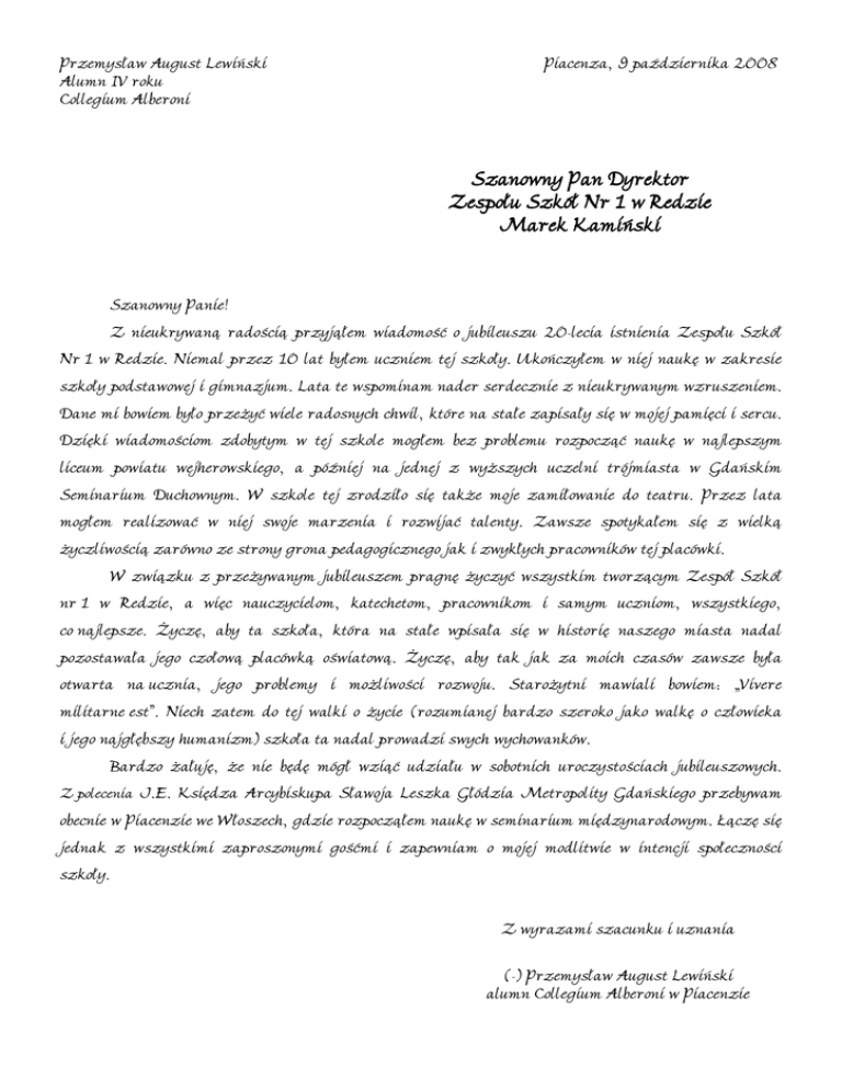 Przemysław August Lewiński Alumn IV roku Collegium Alberoni Piacenza, 9 października 2008 Szanowny Pan Dyrektor Zespołu Szkół Nr 1 w Redzie Marek Kamiński Szanowny Panie! Z nieukrywaną radością przyjąłem wiadomość o jubileuszu 20-lecia istnienia Zespołu Szkół Nr 1 w Redzie. Niemal przez 10 lat byłem uczniem tej szkoły. Ukończyłem w niej naukę w zakresie szkoły podstawowej i gimnazjum. Lata te wspominam nader serdecznie z nieukrywanym wzruszeniem. Dane mi bowiem było przeŜyć wiele radosnych chwil, które na stałe zapisały się w mojej pamięci i sercu. Dzięki wiadomościom zdobytym w tej szkole mogłem bez problemu rozpocząć naukę w najlepszym liceum powiatu wejherowskiego, a później na jednej z wyŜszych uczelni trójmiasta w Gdańskim Seminarium Duchownym. W szkole tej zrodziło się takŜe moje zamiłowanie do teatru. Przez lata mogłem realizować w niej swoje marzenia i rozwijać talenty. Zawsze spotykałem się z wielką Ŝyczliwością zarówno ze strony grona pedagogicznego jak i zwykłych pracowników tej placówki. W związku z przeŜywanym jubileuszem pragnę Ŝyczyć wszystkim tworzącym Zespół Szkół nr 1 w Redzie, a więc nauczycielom, katechetom, pracownikom i samym uczniom, wszystkiego, co najlepsze. śyczę, aby ta szkoła, która na stałe wpisała się w historię naszego miasta nadal pozostawała jego czołową placówką oświatową. śyczę, aby tak jak za moich czasów zawsze była otwarta na ucznia, jego problemy i moŜliwości rozwoju. StaroŜytni mawiali bowiem: „Vivere militarne est”. Niech zatem do tej walki o Ŝycie (rozumianej bardzo szeroko jako walkę o człowieka i jego najgłębszy humanizm) szkoła ta nadal prowadzi swych wychowanków. Bardzo Ŝałuję, Ŝe nie będę mógł wziąć udziału w sobotnich uroczystościach jubileuszowych. Z polecenia J.E. Księdza Arcybiskupa Sławoja Leszka Głódzia Metropolity Gdańskiego przebywam obecnie w Piacenzie we Włoszech, gdzie rozpocząłem naukę w seminarium międzynarodowym. Łączę się jednak z wszystkimi zaproszonymi gośćmi i zapewniam o mojej modlitwie w intencji społeczności szkoły. Z wyrazami szacunku i uznania (-) Przemysław August Lewiński alumn Collegium Alberoni w Piacenzie