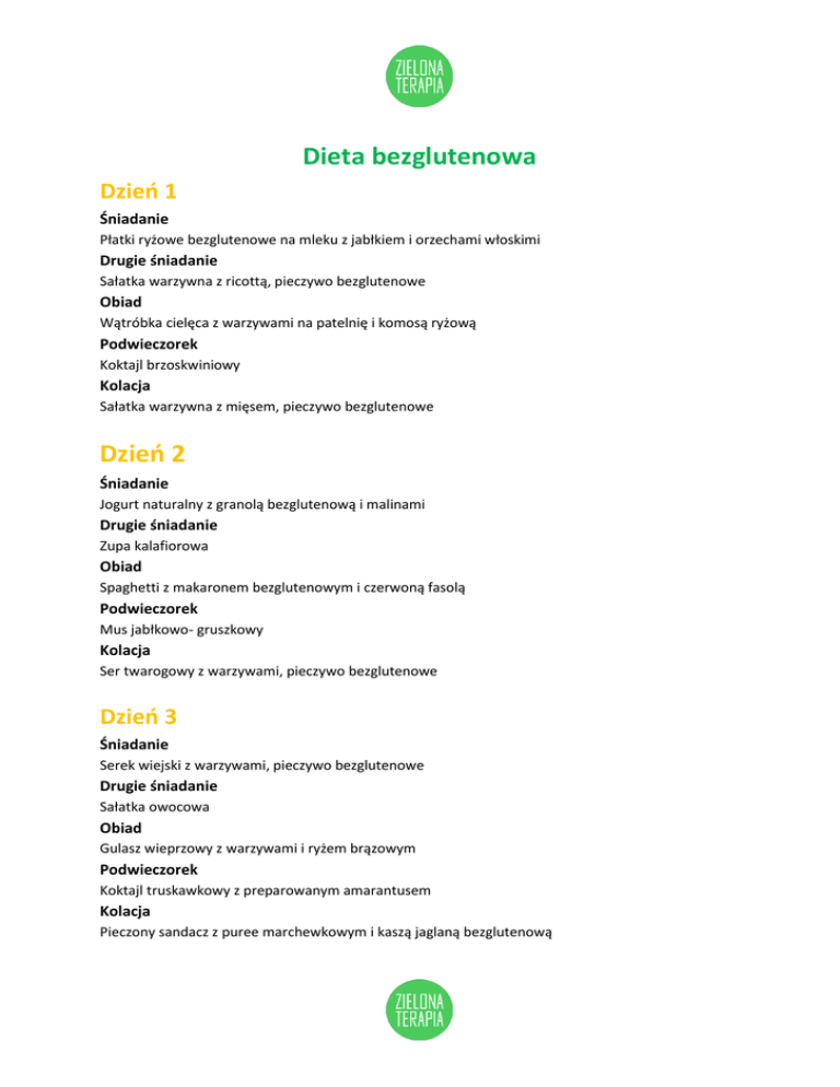 Dieta bezglutenowa Dzień 1 Śniadanie Płatki ryżowe bezglutenowe na mleku z jabłkiem i orzechami włoskimi Drugie śniadanie Sałatka warzywna z ricottą, pieczywo bezglutenowe Obiad Wątróbka cielęca z warzywami na patelnię i komosą ryżową Podwieczorek Koktajl brzoskwiniowy Kolacja Sałatka warzywna z mięsem, pieczywo bezglutenowe Dzień 2 Śniadanie Jogurt naturalny z granolą bezglutenową i malinami Drugie śniadanie Zupa kalafiorowa Obiad Spaghetti z makaronem bezglutenowym i czerwoną fasolą Podwieczorek Mus jabłkowo- gruszkowy Kolacja Ser twarogowy z warzywami, pieczywo bezglutenowe Dzień 3 Śniadanie Serek wiejski z warzywami, pieczywo bezglutenowe Drugie śniadanie Sałatka owocowa Obiad Gulasz wieprzowy z warzywami i ryżem brązowym Podwieczorek Koktajl truskawkowy z preparowanym amarantusem Kolacja Pieczony sandacz z puree marchewkowym i kaszą jaglaną bezglutenową Dzień 4 Śniadanie Jogurt naturalny z crunchy bezglutenowym i owocami Drugie śniadanie Sałatka warzywna z łososiem, pieczywo bezglutenowe Obiad Stek wołowy z pieczonymi ziemniakami, starte buraki Podwieczorek Gotowany por z orzechami pistacjowymi Kolacja Kanapki bezglutenowe z serem i warzywami Dzień 5 Śniadanie Płatki amarantusowe na mleku z ananasem i melonem Drugie śniadanie Zupa ogórkowa na wywarze warzywnym Obiad Pieczony okoń z puree ziemniaczanowo- selerowym z koperkiem oraz surówką Podwieczorek Smoothie pomarańczowo- grejpfrutowe, baton bezglutenowy Kolacja Sałatka warzywna z mozzarellą, pieczywo
