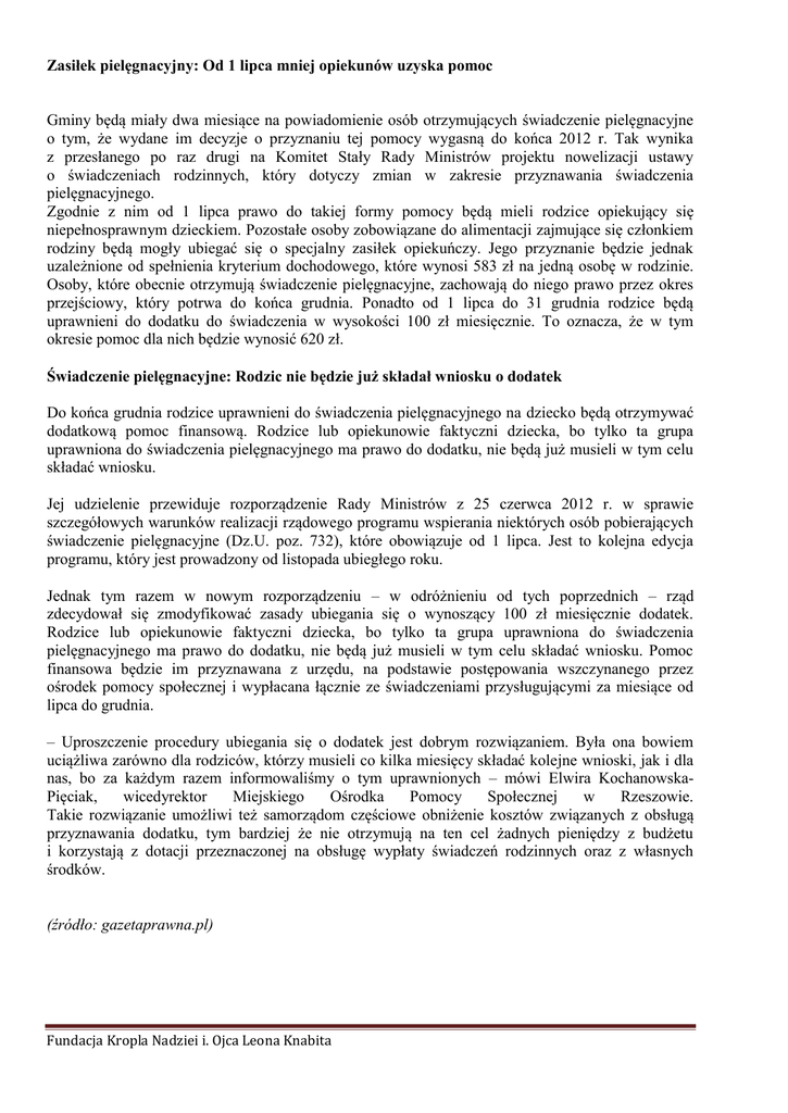 Zasiłek pielęgnacyjny: Od 1 lipca mniej opiekunów uzyska pomoc Gminy będą miały dwa miesiące na powiadomienie osób otrzymujących świadczenie pielęgnacyjne o tym, że wydane im decyzje o przyznaniu tej pomocy wygasną do końca 2012 r. Tak wynika z przesłanego po raz drugi na Komitet Stały Rady Ministrów projektu nowelizacji ustawy o świadczeniach rodzinnych, który dotyczy zmian w zakresie przyznawania świadczenia pielęgnacyjnego. Zgodnie z nim od 1 lipca prawo do takiej formy pomocy będą mieli rodzice opiekujący się niepełnosprawnym dzieckiem. Pozostałe osoby zobowiązane do alimentacji zajmujące się członkiem rodziny będą mogły ubiegać się o specjalny zasiłek opiekuńczy. Jego przyznanie będzie jednak uzależnione od spełnienia kryterium dochodowego, które wynosi 583 zł na jedną osobę w rodzinie. Osoby, które obecnie otrzymują świadczenie pielęgnacyjne, zachowają do niego prawo przez okres przejściowy, który potrwa do końca grudnia. Ponadto od 1 lipca do 31 grudnia rodzice będą uprawnieni do dodatku do świadczenia w wysokości 100 zł miesięcznie. To oznacza, że w tym okresie pomoc dla nich będzie wynosić 620 zł. Świadczenie pielęgnacyjne: Rodzic nie będzie już składał wniosku o dodatek Do końca grudnia rodzice uprawnieni do świadczenia pielęgnacyjnego na dziecko będą otrzymywać dodatkową pomoc finansową. Rodzice lub opiekunowie faktyczni dziecka, bo tylko ta grupa uprawniona do świadczenia pielęgnacyjnego ma prawo do dodatku, nie będą już musieli w tym celu składać wniosku. Jej udzielenie przewiduje rozporządzenie Rady Ministrów z 25 czerwca 2012 r. w sprawie szczegółowych warunków realizacji rządowego programu wspierania niektórych osób pobierających świadczenie pielęgnacyjne (Dz.U. poz. 732), które obowiązuje od 1 lipca. Jest to kolejna edycja programu, który jest prowadzony od listopada ubiegłego roku. Jednak tym razem w nowym rozporządzeniu – w odróżnieniu od tych poprzednich – rząd zdecydował się zmodyfikować zasady ubiegania się o wynoszący 100 zł miesięcznie dodatek. Rodzice lub opiekunowie faktyczni dziecka, bo tylko ta grupa uprawniona do świadczenia pielęgnacyjnego ma prawo do dodatku, nie będą już musieli w tym celu składać wniosku. Pomoc finansowa będzie im przyznawana z urzędu, na podstawie postępowania wszczynanego przez ośrodek pomocy społecznej i wypłacana łącznie ze świadczeniami przysługującymi za miesiące od lipca do grudnia. – Uproszczenie procedury ubiegania się o dodatek jest dobrym rozwiązaniem. Była ona bowiem uciążliwa zarówno dla rodziców, którzy musieli co kilka miesięcy składać kolejne wnioski, jak i dla nas, bo za każdym razem informowaliśmy o tym uprawnionych – mówi Elwira KochanowskaPięciak, wicedyrektor Miejskiego Ośrodka Pomocy Społecznej w Rzeszowie. Takie rozwiązanie umożliwi też samorządom częściowe obniżenie kosztów związanych z obsługą przyznawania dodatku, tym bardziej że nie otrzymują na ten cel żadnych pieniędzy z budżetu i korzystają z dotacji przeznaczonej na obsługę wypłaty świadczeń rodzinnych oraz z własnych środków. (źródło: gazetaprawna.pl) Fundacja Kropla Nadziei i. Ojca Leona Knabita