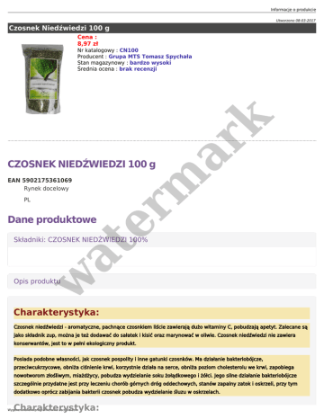 Informacje o produkcie Utworzono 08-03-2017 Czosnek Niedźwiedzi 100 g Cena : 8,97 zł er m ar k Nr katalogowy : CN100 Producent : Grupa MTS Tomasz Spychała Stan magazynowy : bardzo wysoki Średnia ocena : brak recenzji CZOSNEK NIEDŹWIEDZI 100 g EAN 5902175361069 Rynek docelowy PL Dane produktowe w at Składniki: CZOSNEK NIEDŹWIEDZI 100% Opis produktu Charakterystyka: Czosnek niedźwiedzi - aromatyczne, pachnące czosnkiem liście zawierają dużo witaminy C, pobudzają apetyt. Zalecane są jako składnik zup, można je też dodawać do sałatek i kisić oraz marynować w oliwie. Czosnek niedźwiedzi nie zawiera konserwantów, jest to w pełni ekologiczny produkt. Posiada podobne własności, jak czosnek pospolity i inne gatunki czosnków. Ma działanie bakteriobójcze, przeciwcukrzycowe, obniża ciśnienie krwi, korzystnie działa na serce, obniża poziom cholesterolu we krwi, zapobiega nowotworom złośliwym, miażdżycy, pobudza wydzielanie soku żołądkowego i żółci. Jego silne działanie bakteriobójcze szczególnie przydatne jest przy leczeniu chorób górnych dróg oddechowych, stanów zapalny zatok i oskrzeli, przy tym dodatkowo oprócz zabijania bakterii czosnek pobudza wydzielanie śluzu w oskrzelach. Charakterystyka: Wygenerowano w programie www.oscGold.com W naszej ofercie znajdziesz również czosnek suszony: granulowany, mielony oraz płatek. Zastosowanie: Do zup, sosów, potraw z mięs, warzyw, ryb, wędlin, sałatek, jaj, kotletów, serów (szczególnie sera białego), mięsa mielonego, gołąbków, ryżu, grzanek z masełkiem i pomidorem. Marka Marketing Zastosowanie: Opis produktu Kraj pochodzenia: Polska Zdrowie i styl życia er m ar k CZOSNEK NIEDŹWIEDZI Produkt może zawierać śladowe ilości orzechów ziemnych, gorczycy glutenu i soi. at Przechowywanie i stosowanie T y p w Rodzaj przechowywania w P sr .z ce zc h e lo Opakowanie w n iy Rozmiar opakowania w e za 100 ć g a w m Wymiar liczbowy t k e n Wymiar liczbowy - 100 im p ę te W ry y m ca 2 7 a tg h 3 4 0 a u o 8 0 n Informacje o produkcie Rodzaj opakowania Typ - Zgrzewane Waga Waga brutto - 115 g Sprzedaż jednostkowa Obsługa klienta er m ar k Adres producenta GRUPA MTS TOMASZ SPYCHAŁA. ul. Fabryczna 13 31-53 Kraków tel. 535 989 820 Adres zwrotny GRUPA MTS TOMASZ SPYCHAŁA. ul. Fabryczna 13 31-53 Kraków tel. 535 989 820 Rozszerzone dane Język produktu Główny język opisu - polski at Język danych - polski Języki na opakowaniu polski w ● Wygenerowano w programie www.oscGold.com