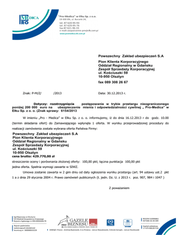Powszechny Zakład ubezpieczeń S.A Pion Klienta Korporacyjnego Oddział Regionalny w Gdańsku Zespół Sprzedaży Korporacyjnej ul. Kościuszki 59 10-950 Olsztyn fax 089 308 26 67 Znak: P-M/Z/ /2013 Data: 30.12.2013 r. Dotyczy: rozstrzygnięcia postępowania w trybie przetargu nieograniczonego poniżej 200 000 euro na ubezpieczenie mienia i odpowiedzialności cywilnej „ Pro-Medica” w Ełku Sp. z o. o. (Znak sprawy: 6154/2013 W imieniu „Pro - Medica” w Ełku Sp. z o. o. informujemy, iż do dnia 16.12.2013 r do godz. 10.00 (termin składania ofert) do Zamawiającego wpłynęła 1 oferta. W wyniku przeprowadzonej procedury do realizacji zamówienia została wybrana oferta Państwa Firmy: Powszechny Zakład ubezpieczeń S.A Pion Klienta Korporacyjnego Oddział Regionalny w Gdańsku Zespół Sprzedaży Korporacyjnej ul. Kościuszki 59 10-950 Olsztyn cena brutto: 429.770,00 zł streszczenie oceny i porównania złożonej oferty: 100,00 pkt; łączna punktacja 100,00 pkt jedna oferta. Spełnia wymogi zawarte w SIWZ. Umowa zostanie zawarta w 2 gim dniu od daty ogłoszenia wyniku przetargu (art. 94 ustawy ust.2 pkt 1 a z dnia 29 stycznia 2004 r. Prawo zamówień publicznych (t. jedn. Dz. U. z 2013 r. poz. 907, 984 i 1047 ) Z poważaniem