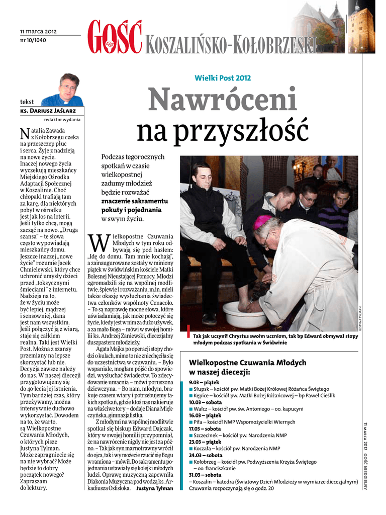 11 marca 2012 nr 10/1040 Wielki Post 2012 Nawróceni na przyszłość tekst ks. Dariusz Jaślarz redaktor wydania N Podczas tegorocznych spotkań w czasie wielkopostnej zadumy młodzież będzie rozważać znaczenie sakramentu pokuty i pojednania w swym życiu. Justyna Tylman W ielkopostne Czuwania Młodych w tym roku odbywają się pod hasłem: „Idę do domu. Tam mnie kochają”, a zainaugurowane zostały w miniony piątek w świdwińskim kościele Matki Bolesnej Nieustającej Pomocy. Młodzi zgromadzili się na wspólnej modlitwie, śpiewie i rozważaniu, m.in. mieli także okazję wysłuchania świadectwa członków wspólnoty Cenacolo. – To są naprawdę mocne słowa, które uświadamiają, jak może potoczyć się życie, kiedy jest w nim za dużo używek, a za mało Boga – mówi w swojej homilii ks. Andrzej Zaniewski, diecezjalny duszpasterz młodzieży. Agata Majka po operacji stopy chodzi o kulach, mimo to nie zniechęciła się do uczestnictwa w czuwaniu. – Było wspaniale, mogłam pójść do spowiedzi, wysłuchać świadectw. To zdecydowanie umacnia – mówi poruszona dziewczyna. – Bo nam, młodym, brakuje czasem wiary i potrzebujemy takich spotkań, gdzie ktoś nas nakieruje na właściwe tory – dodaje Diana Miękczyńska, gimnazjalistka. Z młodymi na wspólnej modlitwie spotkał się biskup Edward Dajczak, który w swojej homilii przypomniał, że na nawrócenie nigdy nie jest za późno. – Tak jak syn marnotrawny wrócił do ojca, tak i wy możecie rzucić się Bogu w ramiona – mówił. Do sakramentu pojednania ustawiały się kolejki młodych ludzi. Oprawę muzyczną zapewniła Diakonia Muzyczna pod wodzą ks. Arkadiusza Oslisloka. Justyna Tylman Tak jak uczynił Chrystus swoim uczniom, tak bp Edward obmywał stopy młodym podczas spotkania w Świdwinie Wielkopostne Czuwania Młodych w naszej diecezji: 9.03 – piątek • Słupsk – kościół pw. Matki Bożej Królowej Różańca Świętego • Kępice – kościół pw. Matki Bożej Różańcowej – bp Paweł Cieślik 10.03 – sobota • Wałcz – kościół pw. św. Antoniego – oo. kapucyni 16.03 – piątek • Piła – kościół NMP Wspomożycielki Wiernych 17.03 – sobota • Szczecinek – kościół pw. Narodzenia NMP 23.03 – piątek • Koczała – kościół pw. Narodzenia NMP 24.03 – sobota • Kołobrzeg – kościół pw. Podwyższenia Krzyża Świętego – oo. franciszkanie 31.03 – sobota – Koszalin – katedra (Światowy Dzień Młodzieży w wymiarze diecezjalnym) Czuwania rozpoczynają się o godz. 20 11 marca 2012 Gość Niedzielny atalia Zawada z Kołobrzegu czeka na przeszczep płuc i serca. Żyje z nadzieją na nowe życie. Inaczej nowego życia wyczekują mieszkańcy Miejskiego Ośrodka Adaptacji Społecznej w Koszalinie. Choć chłopaki trafiają tam za karę, dla niektórych pobyt w ośrodku jest jak los na loterii. Jeśli tylko chcą, mogą zacząć na nowo. „Druga szansa” – te słowa często wypowiadają mieszkańcy domu. Jeszcze inaczej „nowe życie” rozumie Jacek Chmielewski, który chce uchronić umysły dzieci przed „toksycznymi śmieciami” z internetu. Nadzieja na to, że w życiu może być lepiej, mądrzej i sensowniej, dana jest nam wszystkim. Jeśli połączyć ją z wiarą, staje się całkiem realna. Taki jest Wielki Post. Można z szansy przemiany na lepsze skorzystać lub nie. Decyzja zawsze należy do nas. W naszej diecezji przygotowujemy się do 40-lecia jej istnienia. Tym bardziej czas, który przeżywamy, można intensywnie duchowo wykorzystać. Dowodem na to, że warto, są Wielkopostne Czuwania Młodych, o których pisze Justyna Tylman. Może zapragniecie się na nie wybrać? Może będzie to dobry początek nowego? Zapraszam do lektury. gość koszalińsko-kołobrzeski II Ostateczna lista produktów w programie PEAD 2012 będzie znana ok. 15 marca i zostanie opublikowana na stronie Caritas Diecezji Koszalińsko-Kołobrzeskiej Koszalin. W związku z przygotowaniami do kolejnej edycji programu PEAD koordynator projektu Agnieszka Kukiełka przypomina, że aby pomoc otrzymać, trzeba się zgłosić. Ostateczny termin upływa 15 marca 2012 roku. – Bardzo proszę o nadsyłanie zapotrzebowania, czyli szacunkowej liczby osób, którą parafialne zespoły Caritas obejmą wsparciem z programu PEAD 2012 – wyjaśnia koordynatorka. Formularz zgłoszenia został rozesłany do wszystkich parafii. Jeśli ktoś go nie dostał, może go znaleźć na stronie internetowej: www.koszalin.caritas.pl w zakładce do pobrania/PEAD – zgłoszenia 2012. O terminach podpisania umów Caritas naszej diecezji poinformuje zespoły osobnym pismem. Jakich produktów można spodziewać się w programie PEAD 2012? – Planowane są dostawy m.in. mąki, ryżu, kaszy gryczanej z warzywami, makaronu, herbatników, chleba chrupkiego, cukru, dżemu, konserw mięsnych i rybnych, oleju oraz mleka – informuje Agnieszka Kukiełka. jt Magdalena Marzec Policja ostrzega przed fałszywymi wnukami Gość Niedzielny 11 marca 2012 Funkcjonariusze apelują do seniorów o szczególną ostrożność w kontaktach telefonicznych z nieznanymi osobami, zwłaszcza, gdy proszą o pieniądze Wałcz. Niestety, okazuje się, że hasła „wnuczek”, „syn” nadal otwierają serca i… portfele. Policjanci Komendy Powiatowej Policji w Wałczu zanotowali dwa kolejne zgłoszenia oszustwa tą metodą. 72-letni wałczanin odebrał telefon od mężczyzny podającego się za jego syna. Połączenie było niezbyt dobrze słyszalne, ale prośba o pieniądze została wyraźnie wyartykułowana – z powodu wypadku „syn” pilnie potrzebował większej gotówki. Łatwowierny mężczyzna własnoręcznie przekazał oszustom 21 tys. zł. W podobny sposób 86-letnia kobieta straciła 30 tys. zł. Tym razem sprawca podał się za jej wnuczka. – Oszuści rozmowę prowadzą w taki sposób, aby wzbudzić zaufanie. Najczęściej podszywają się pod krewnego, który znalazł się w ciężkiej sytu