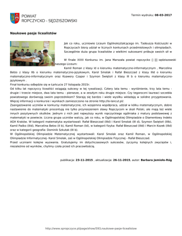 Termin wydruku: 08-03-2017 Naukowe pasje licealistów Jak co roku, uczniowie Liceum Ogólnokształcącego im. Tadeusza Kościuszki w Ropczycach biorą udział w licznych konkursach przedmiotowych i olimpiadach. Szczególnie duża grupa licealistów z wielkimi sukcesami próbuje swoich sił w konkursach matematycznych. W finale XXXI Konkursu im. Jana Marszała powiat ropczycko ጀ sędziszowski reprezentować będzie 6 uczniów naszego Liceum: Kamil Roman z klasy Id o kierunku matematyczno-informatycznym , Marcelina Bełzo z klasy IIb o kierunku matematyczno-językowym, Karol Smolak i Rafał Bieszczad z klasy IIId o kierunku matematyczno-informatycznym oraz Ksawery Czapor i Szymon Świętoń z klasy III b o kierunku matematycznojęzykowym . Finał konkursu odbędzie się w Łańcucie 27 listopada 2015r. Od kilku lat ropczyccy licealiści osiągają sukcesy w tej rywalizacji. Cztery lata temu - wyróżnienie, trzy lata temu drugie i trzecie miejsce, dwa lata temu - pierwsze, a w zeszłym roku drugie miejsce. Czy tegoroczni laureaci szczebla powiatowego dorównają swoim poprzednikom? Starają się bardzo i wiele wysiłku wkładają w solidne przygotowania. Więcej informacji o konkursie i wynikach zamieszczono na stronie http://lo-lancut.pl/. Zaangażowanie uczniów w konkursy matematyczne, ich wzajemna współpraca, udział w kółku matematycznym, dobre nastawienie do matematyki procentują nie tylko przynoszeniem sławy Ropczycom w skali Polski, ale mają też wiele innych pozytywnych skutków. Jednym z nich jest najwyższy wynik ropczyckiego ogólniaka z matury podstawowej z matematyki w powiecie. Liczna grupa uczniów walczy, jak co roku, w Ogólnopolskiej Olimpiadzie o Diamentowy Indeks AGH Kraków. W kategorii matematyka wystartowali: Rafał Bieszczad (IIId) i Karol Smolak (III d), Szymon Świętoń (IIIb), Kamil Paśko (IIId), Marcelina Bełzo (II b), Kamil Roman (Id), w kategorii fizyka: Rafał Bieszczad (IIId) i Marcin Kozek (IIId) oraz w kategorii geografia: Dominik Szkutak (III b). W Ogólnopolskiej Olimpiadzie Matematycznej wystartowali: Karol Smolak oraz Kamil Roman, w Ogólnopolskiej Olimpiadzie Informatycznej- Karol Smolak, zaś w Ogólnopolskiej Olimpiadzie Fizycznej - Rafał Bieszczad. Przed uczniami kolejne wyzwania. Gratulujemy im dotychczasowych sukcesów, życzymy kolejnych zwycięstw i, niezależnie od wyników, chylimy czoła przed ich pracowitością. publikacja: 23-11-2015 , aktualizacja: 26-11-2015, autor: Barbara Jemioło-Róg http://www.spropczyce.pl/page/show/593,naukowe-pasje-licealistow