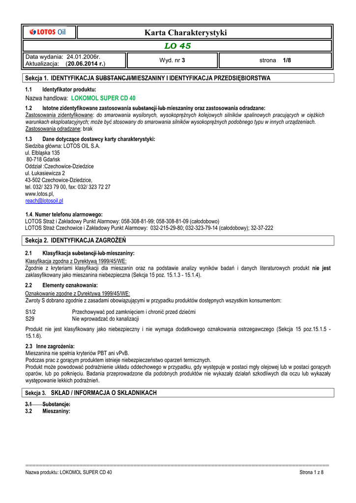 Karta Charakterystyki LO 45 Data wydania: 24.01.2006r. Aktualizacja: (20.06.2014 r.) Wyd. nr 3 strona 1/8 Sekcja 1. IDENTYFIKACJA SUBSTANCJI/MIESZANINY I IDENTYFIKACJA PRZEDSIĘBIORSTWA 1.1 Identyfikator produktu: Nazwa handlowa: LOKOMOL SUPER CD 40 1.2 Istotne zidentyfikowane zastosowania substancji lub mieszaniny oraz zastosowania odradzane: Zastosowania zidentyfikowane: do smarowania wysilonych, wysokoprężnych kolejowych silników spalinowych pracujących w ciężkich warunkach eksploatacyjnych; może być stosowany do smarowania silników wysokoprężnych podobnego typu w innych urządzeniach. Zastosowania odradzane: brak 1.3 Dane dotyczące dostawcy karty charakterystyki: Siedziba główna: LOTOS OIL S.A. ul. Elbląska 135 80-718 Gdańsk Oddział :Czechowice-Dziedzice ul. Łukasiewicza 2 43-502 Czechowice-Dziedzice, tel. 032/ 323 79 00, fax: 032/ 323 72 27 www.lotos.pl, [email protected] 1.4. Numer telefonu alarmowego: LOTOS Straż i Zakładowy Punkt Alarmowy: 058-308-81-99; 058-308-81-09 (całodobowo) LOTOS Straż Czechowice i Zakładowy Punkt Alarmowy: 032-215-29-80; 032-323-79-14 (całodobowy); 32-37-222 Sekcja 2. IDENTYFIKACJA ZAGROŻEŃ 2.1 Klasyfikacja substancji lub mieszaniny: Klasyfikacja zgodna z Dyrektywą 1999/45/WE: Zgodnie z kryteriami klasyfikacji dla mieszanin oraz na podstawie analizy wyników badań i danych literaturowych produkt nie jest zaklasyfikowany jako mieszanina niebezpieczna (Sekcja 15 poz. 15.1.3 - 15.1.4). 2.2 Elementy oznakowania: Oznakowanie zgodne z Dyrektywą 1999/45/WE: Zwroty S dobrano zgodnie z zasadami obowiązującymi w przypadku produktów dostępnych wszystkim konsumentom: S1/2 S29 Przechowywać pod zamknięciem i chronić przed dziećmi Nie wprowadzać do kanalizacji Produkt nie jest klasyfikowany jako niebezpieczny i nie wymaga dodatkowego oznakowania ostrzegawczego (Sekcja 15 poz.15.1.5 15.1.6). 2.3 Inne zagrożenia: Mieszanina nie spełnia kryteriów PBT ani vPvB. Podczas prac z gorącym produktem istnieje niebezpieczeństwo oparzeń termicznych. Produkt może powodować podrażnienie układu oddechowego w przypadku, gdy występuje w postaci mgły olejowej lub w postaci gorących oparów, lub po połknięciu. Badania przeprowadzone dla podobnych produktów nie wykazały działań szkodliwych dla oczu lub wykazały występowanie lekkich podrażnień. Sekcja 3. SKŁAD / INFORMACJA O SKŁADNIKACH 3.1 3.2 Substancje: Mieszaniny: ========================================================================================== Nazwa produktu: LOKOMOL SUPER CD 40 Strona 1 z 8 Karta Charakterystyki LO 45 Data wydania: 24.01.2006r. Aktualizacja: (20.06.2014 r.) Wyd. nr 3 Numer rejestracji 01-2119493628-22 Stężenie [% m/m] CAS 68457-79-4 strona Nazwa substancji Klasyfikacja substancji wg dyrektywy 67/548/EWG Klasyfikacja substancji wg Rozporządzenia WE 1207/2008 (CLP) Phosphorodithioic acid, mixed O,Obis(iso-Bu and pentyl) esters, zinc salts Xi R38 R41 N R51/53 Skin Irrit.2, H315 Eye Dam.1; H318 Aquatic Chronic 2; H411 WE 270-608-0 1,3 2/8 Uwaga! Wykaz symboli i zwrotów R ,H wskazujących kategorię niebezpieczeństwa i rodzaj zagrożenia wraz z pełnym ich brzmieniem wyszczególniono w pkt. 16. Produkt nie zawiera związków chlorowcoorganicznych. Sekcja 4. ŚRODKI PIERWSZEJ POMOCY 4.1 Opis środków pierwszej pomocy: Przez drogi oddechowe: Jeśli obserwuje się szkodliwy wpływ oparów na poszkodowanego, należy wyprowadzić lub wynieść go z zagrożonego miejsca na świeże powietrze. Zdjąć zanieczyszczoną odzież. Zapewnić poszkodowanemu spokój i ciepło (okryć kocami). Kontrolować jego oddech i tętno. Przy występowaniu zaburzeń w oddychaniu podawać tlen. W przypadku zatrzymania oddechu stosować sztuczne oddychanie za pomocą aparatu AMBU, po uprzednim oczyszczeniu jamy ustnej z ciał obcych i śluzu. Jeżeli stanie się to konieczne, wykonać masaż serca. W przypadku kontaktu ze skórą: Zdjąć zanieczyszczoną odzież. Miejsce kontaktu, a w razie potrzeby całe ciało, należy dokładnie umyć wodą z mydłem, o ile nie ma oparzeń gorącym produktem. Do mycia nie wolno używać rozpuszczalników organicznych takich jak: nafta, lekkie destylaty czy benzyna. W przypadku kontaktu gorącego produktu ze skórą oparzone miejsce należy natychmiast zanurzyć w zimnej wodzie lub poddawać działaniu strumienia bieżącej zimnej wody przez co najmniej 10 minut. Jeśli produkt wniknął pod ciśnieniem do tkanek podskórnych, należy natychmiast udzielić poszkodowanemu pomocy medycznej. Po dostaniu się do oczu: Zdjąć szkła kontaktowe i przemywać oczy dużą ilością wody przez co najmniej 15 min. (przy odwiniętych powiekach). W przypadku zanieczyszczenia tylko jednego oka - drugie chronić przed zanieczyszczeniem w trakcie przemywania. Unikać silnego strumienia wody ze względu na ryzyko uszkodzenia rogówki. Uwaga! Osoby narażone na skażenie oczu powinny być pouczone o konieczności i sposobie ich natychmiastowego płukania. Spożycie / aspiracja: Nie należy wywoływać wymiotów, gdyż istnieje możliwość przedostania się produktu do dróg oddechowych, co może powodować zachłystowe zapalenie płuc, a to wymaga natychmiastowego leczenia. W przypadku zanieczyszczenia jamy ustnej wypłukać ją dokładnie wodą, aż zniknie smak produktu. W przypadku wystąpienia wymiotów położyć poszkodowanego twarzą do ziemi w celu zmniejszenia ryzyka przedostania się substancji do oskrzeli i płuc. Jak najszybciej wezwać lekarza lub odwieźć poszkodowanego do szpitala, pokazać opakowanie produktu lub etykietę. Wskazówka dla lekarza: U pacjenta nieprzytomnego płukanie żołądka należy przeprowadzić przez zgłębnik po uprzednim wykonaniu intubacji dotchawicznej. Kontrolować rytm pracy serca. Leczyć objawowo. 4.2 Najważniejsze ostre i opóźnione objawy oraz skutki narażenia: Krótkie podsumowanie informacji dotyczących ostrych i opóźnionych objawów oraz skutków narażenia: nie określono. 4.3 Wskazania dotycz