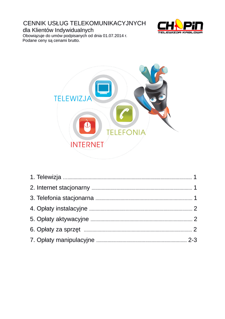 CENNIK USŁUG TELEKOMUNIKACYJNYCH dla Klientów Indywidualnych Obowiązuje do umów podpisanych od dnia 01.07.2014 r. Podane ceny są cenami brutto. 1. Telewizja …................................................................................................... 1 2. Internet stacjonarny ................................................................................ 1 3. Telefonia stacjonarna ............................................................................. 1 4. Opłaty instalacyjne .................................................................................. 2 5. Opłaty aktywacyjne ................................................................................. 2 6. Opłaty za sprzęt ...................................................................................... 2 7. Opłaty manipulacyjne ........................................................................ 2-3 1. TELEWIZJA OPŁATY ABONAMENTOWE Dostęp do pakietów telewizyjnych OPŁATA MIESIĘCZNA 1 16,20 zł Pakiety telewizyjne: Pakiet cyfrowy Stalowy 2 3,24 zł Pakiet cyfrowy Brązowy 19,44 zł Pakiet cyfrowy Srebrny 37,80 zł Pakiet cyfrowy Złoty 58,32 zł Pakiet cyfrowy Platynowy 82,08 zł Telewizja na życzenie 3 MULTIROOM 9,84 zł 4 14,90 zł PAKIETY CYFROWE PREMIUM 3 OPŁATA MIESIĘCZNA Pakiet Canal+ Silver HD 37,80 zł Pakiet Canal+ Gold HD 48,60 zł Pakiet Canal+ Platinum HD 59,40 zł Pakiet HBO HD 37,80 zł Pakiet HBO GO 39,98 zł TV Republika 5,40 zł 1. Usługa wymagana do wszystkich pakietów telewizyjnych. 2. Programy dostępne z pakietem Stalowym są również dostępne nieodpłatnie drogą rozsiewczą naziemną. 3. Usługa wymaga aktywnego pakietu cyfrowego za wyjątkiem Stalowego. 4. Usługa umożliwia (za pomocą drugiego dekodera) dostęp do takiego samego pakietu programów jaki jest dostarczony Abonentowi na podstawie Umowy Abonenckiej. Usługa nie dotyczy dodatkowych pakietów Premium. Usługa dostępna w zależności od możliwości technicznych od pakietu cyfrowego „Srebrnego”. Możliwość uruchomienia usługi tylko na jednym dodatkowym odbiorniku TV. 2. INTERNET STACJONARNY OPŁATY ABONAMENTOWE Pakiet internetowy Prędkość pobierania / wysyłania Opłata miesięczna. Umowa na 12 m-cy Opłata miesięczna. Umowa na 23 m-ce Chopin Net Senior ¹ do 8 / 0,8 Mbs 33,21 zł - Chopin Net 20 do 20 / 2,0 Mbs 73,80 zł 61,50 zł Chopin Net 60 do 60 / 6,0 Mbs 86,10 zł 73,80 zł Chopin Net 120 do 120 / 6,0 Mbs 98,40 zł 86,10 zł Chopin Net 250 2 do 250 / 10,0 Mbs 135,30 zł 123,00 zł 1. Chopin Net Senior dostępny dla Klientów posiadających legitymację emeryta/rencisty. 2. Usługa ograniczona terytorialnie. 3. TELEFONIA STACJONARNA Chopin Tel Senior 1 Opłaty abonamentowe Chopin Tel 150 Chopin Tel 500 Chopin Tel 2000 10,09 zł 24,60 zł 49,40 zł 85,69 zł Połączenia do TK Chopin 0 zł 0 zł 0 zł 0 zł Ilość minut bezpłatnych 0 min 150 min 500 min 2000 min Stawka poza pakietem minut poł. krajowe stacjonarne lokalne 0,10 zł/min 0,08/min 0,06/min 0,06/min Stawka poza pakietem minut poł. krajowe stacjonarne międzymiastowe 0,12 zł/min 0,10/min 0,08/min 0,08/min Stawka poza pakietem minut poł. międzynarodowe - 1 strefa 0,49 zł/min 0,49 zł/min 0,49 zł/min 0,49 zł/min Stawka na połączenia krajowe komórkowe 0,40 zł/min 0,35 zł/min 0,20 zł/min 0,20 zł/min 2 Infolinia: 58 738 97 01, www.tkchopin.pl 1 Druga linia telefoniczna 3 (do każdego Pakietu) 4,94 zł 1. Pakiet telefoniczny Senior dostępny dla Klientów posiadających legitymację emeryta/rencisty. 2. Liczba darmowych minut miesięcznie w ramach abonamentu do wszystkich operatorów stacjonarnych w Polsce i w pierwszej strefie międzynarodowej (m.in. Kraje Unii Europejskiej, Kanada, USA, Australia). 3. Opłata abonamentowa za aktywną drugą linię telefoniczną dla tego samego numeru. Ceny za połączenia dostępne są w „Cenniku Rozmów Pozostałych” na stronie www.tkchopin.pl w zakładce „Cennik rozmów” lub bezpośrednio w Biurze Obsługi Klienta. 4. OPŁATY INSTALACYJNE OPŁATY INSTALACYJNE OPŁATA JEDNORAZOWA Podłączenie do Sieci (zabudowa wielorodzinna) 252,34 zł Podłączenie do Sieci (zabudowa jednorodzinna) 555,14 zł W przypadku braku Sieci wycena indywidualna Przeniesienie usług do innego lokalu 151,23 zł 5. OPŁATY AKTYWACYJNE OPŁATY AKTYWACYJNE OPŁATA JEDNORAZOWA Aktywacja pakietu cyfrowego 49,20 zł Aktywacja pakietu cyfrowego Premium 24,60 zł Aktywacja pakietu cyfrowego MULTIROOM 49,20 zł Aktywacja pakietu internetowego 98,40 zł Aktywacja pakietu telefonicznego 49,20 zł 6. OPŁATY ZA SPRZĘT OPŁATY ZA ZAKUP OPŁATA JEDNORAZOWA Zakup dekodera (STB) 250,00 zł Zakup modułu dostępu warunkowego CAM 123,00 zł Zakup OL Terminal 699,99 zł OPŁATY ZA UTRATĘ LUB USZKODZENIE SPRZĘTU OPERATORA OL Terminal OPŁATA JEDNORAZOWA 699,99 zł Pilot do dekodera (STB) 50,41 zł Karta dekodująca 61,50 zł Dekoder (STB) 250,00 zł Zasilacz do dekodera (STB) / modemu kablowego 30,75 zł Okablowanie (Scart lub HDMI lub kabel antenowy lub zasilający) 20,16 zł Gniazdo multimedialne 50,41 zł Modem kablowy 150,00 zł Modem kablowy telefoniczny 200,00 zł Modem kablowy telefoniczny Wi-Fi 300,00 zł Kabel USB / LAN 10,09 zł Sterowniki (płyta CD) 4,92 zł OPŁATY ZA DZIERŻAWĘ OPŁATA MIESIĘCZNA Dzierżawa dekodera (STB) 9,98 zł Dzierżawa modemu Wi-Fi 9,84 zł Dzierżawa modemu 4,92 zł 7. OPŁATY MANIPULACYJNE OPŁATY MANIPULACYJNE OPŁATA JEDNORAZOWA Zawieszenie świadczenia usług na życzenie Klienta do 3 miesięcy 25,20 zł Opłata za wydanie zaświadczenia 30,00 zł Infolinia: 58 738 97 01, www.tkchopin.pl 2 Opłata za wystawienie faktury/ duplikatu faktury w formie papierowej 3,69 zł Opłata za zwłokę zwrotu dekodera (STB)/modemu wraz z osprzętem powyżej 7 dni za każdy dzień opóźnienia 3,69 zł Wymiana kabla lub przedłużenie kabla wg kosztów rzeczywistych Montaż dodatkowego gniazda multimedialnego wg kosztów rzeczywistych Wezwanie konserwatora na życzenie Klienta 35,