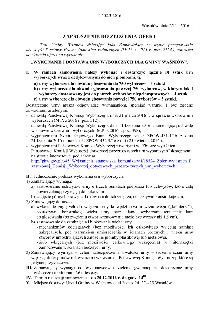 T.502.3.2016 Waśniów, dnia 25.11.2016 r. ZAPROSZENIE DO ZŁOŻENIA OFERT Wójt Gminy Waśniów działając jako Zamawiający w trybie postępowania art. 4 pkt 8 ustawy Prawo Zamówień Publicznych (Dz.U. z 2015 r. poz. 2164.), zaprasza do złożenia oferty na wykonanie: „WYKONANIE I DOSTAWA URN WYBORCZYCH DLA GMINY WAŚNIÓW”. I. W ramach zamówienia należy wykonać i dostarczyć łącznie 10 sztuk urn wyborczych wraz z dedykowanymi do nich plombami, tj.: a) urny wyborcze dla obwodu głosowania do 750 wyborców – 3 sztuki b) urny wyborcze dla obwodu głosowania powyżej 750 wyborców, w którym lokal wyborczy dostosowany jest do potrzeb wyborców niepełnosprawnych – 4 sztuki c) urny wyborcze dla obwodu głosowania powyżej 750 wyborców – 3 sztuki. Dostarczone urny muszą odpowiadać wymaganiom, spełniać warunki i być zgodne ze wzorami ustalonymi: - uchwałą Państwowej Komisji Wyborczej z dnia 21 marca 2016 r. w sprawie wzorów urn wyborczych (M.P. z 2016 r. poz. 312), - uchwałą Państwowej Komisji Wyborczej z dnia 11 kwietnia 2016 r. zmieniającą uchwałę w sprawie wzorów urn wyborczych (M.P. z 2016 r. poz. 398), - wyjaśnieniami Szefa Krajowego Biura Wyborczego znak: ZPOW-431-1/16 z dnia 21 kwietnia 2016 r. oraz znak: ZPOW-432-9/16 z dnia 25 kwietnia 2016 r., - wyjaśnieniami Państwowej Komisji Wyborczej zawartymi w „Zbiorze wyjaśnień Państwowej Komisji Wyborczej dotyczącej przezroczystych urn wyborczych” dostępnymi na stronie internetowej pod adresem: http://pkw.gov.pl/345_Wyjasnienia_stanowiska_komunikaty/1/18524_Zbior_wyjasnien_P anstwowej_Komisji_Wyborczej_dotyczacych_przezroczystych_urn_wyborczych II. Jednocześnie podczas wykonania urn wyborczych: 1) Zamawiający wymaga: a) zastosowanie uchwytów urny o trzech punktach podparcia lub uchwytów, które całą powierzchnią przylegają do boków urn, b) zagięcie górnych krawędzi boków urn do ich wnętrza, co usztywni konstrukcję urn; 2) Zamawiający dopuszcza: a) wykonanie zagiętych do wnętrza urny krawędzi otworu wrzutowego („kołnierza”), co usztywni konstrukcję wieka urny oraz ułatwi wyborcom wrzucenie kart do głosowania (po zwężeniu otwór wrzutowy nie może być węższy niż 1,5 cm), b) zastosowanie do zamknięcia i blokowania wieka urny: - mechanizmów odciąganych (bez możliwości ich całkowitego wyjęcia) zamiast zakręcanych, pod warunkiem umieszczenia w ścianach bocznych i wieku urny otworów umożliwiających założenie plomby plastikowej lub metalowej, - śrub wkręcanych (bez możliwości całkowitego wykręcenia) w nitonakrętki zamocowane w ścianach bocznych urny, 3) Zamawiający wymaga – celem zabezpieczenia trwałości urny – łączenia ścian urny większą ilością nitów niż wskazana we wzorach Państwowej Komisji Wyborczej, które są jedynie przykładowe. III. Zamawiający wymaga od Wykonawców udzielenia gwarancji na dostarczone urny wyborcze na minimum 36 miesięcy. IV. Termin realizacji zamówienia – do 20.12.2016 r. do godz. 1400 V. Miejsce dostawy: Urząd Gminy w Waśniowie, ul Rynek 24, 27-425 Waśniów. T.502.3.2016 VI. Sposób przygotowania oferty oraz miejsce składania ofert: 1) Oferta powinna być sporządzona w języku polskim, na formularzu stanowiącym załącznik nr 1 do niniejszego zapytania ofertowego i podpisana przez osobę uprawnioną do składania oświadczeń woli. 2) Ofertę należy złożyć w zamkniętej kopercie opatrzonej napisem „Wykonanie i dostawa urn wyborczych dla Gminy Waśniów” – pocztą lub osobiście w siedzibie Zamawiającego tj. Urząd Gminy w Waśniowie, ul. Rynek 24, 27-425 Waśniów, sekretariat, w nieprzekraczalnym terminie do dnia 01 grudnia 2016 r. do godz. 10:00. 3) Cena za dostawę urn wyborczych musi zawierać wszystkie koszty związane z realizacją zamówienia opisanego w zapytaniu niezbędne do jego wykonania, z uwzględnieniem wszystkich opłat i podatków, jak również kosztów dostawy. 4) Nie dopuszcza się składania ofert częściowych lub wariantowych. 5) Wykonawca ponosi wszelkie koszty związane z przygotowaniem i złożeniem oferty. VII. Otwarcie ofert: Otwarcie ofert nastąpi w dniu 01 grudnia 2016 r. o godz. 10:30 w Urzędzie Gminy w Waśniowie pok. 15. VIII. Sposób oceny i dokonania wyboru najkorzystniejszej oferty: Kryteria wyboru ofert – najniższa cena brutto. Z Wykonawcą, który przedstawi najkorzystniejszą ofertę zostanie podpisana umowa na zasadach określonych w formularzu stanowiącym załącznik nr 2 do niniejszego zapytania. IX. Informacje dodatkowe: 1) Osobą upoważnioną do kontaktu z oferentami jest Jolanta Mierzejewska – inspektor w Urzędzie Gminy w Waśniowie, Referat Techniczny pokój nr 15, tel. (41) 2646026 w. 40 lub 2646008. 2) Zamawiający zastrzega sobie prawo odwołania postępowania w każdej chwili do dnia zawarcia umowy, bez podania przyczyny. 3) Zamawiający zastrzega sobie prawo do nie dokonania wyboru Wykonawcy, bez podawania przyczyny. 4) Z wybranym Wykonawcą zostanie podpisana umowa w terminie i miejscu wskazanym przez Zamawiającego. Wójt Gminy Krzysztof Gajewski