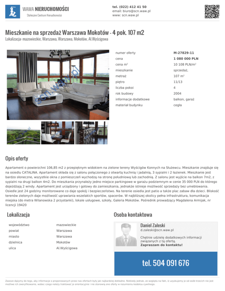 tel. (022) 412 41 50 email: [email protected] www: scn.waw.pl Mieszkanie na sprzedaż Warszawa Mokotów - 4 pok. 107 m2 Lokalizacja: mazowieckie, Warszawa, Warszawa, Mokotów, Al.Wyścigowa numer oferty M-27829-11 cena 1 080 000 PLN cena m 10 108 PLN/m2 mieszkanie sprzedaż, metraż 107 m2 piętro 11/13 liczba pokoi 4 rok budowy 2004 informacje dodatkowe balkon, garaż materiał budynku cegła 2 Opis oferty Apartament o powierzchni 106,85 m2 z przepięknym widokiem na zielone tereny Wyścigów Konnych na Służewcu. Mieszkanie znajduje się na osiedlu CATALINA. Apartament składa się z salonu połączonego z otwartą kuchnią i jadalnią, 3 sypialni i 2 łazienek. Mieszkanie jest bardzo słoneczne, wszystkie okna z pomieszczeń wychodzą na stronę południową lub zachodnią. Z salonu jest wyjście na balkon 7m2, z sypialni na drugi balkon 4m2. Do mieszkania przynależy jedno miejsce parkingowe w garażu podziemnym w cenie 35 000 PLN do którego dojeżdżają 2 windy. Apartament jest urządzony i gotowy do zamieszkania, jednakże istnieje możliwość sprzedaży bez umeblowania. Osiedle jest 24 godziny monitorowane co daje spokój i bezpieczeństwo. Na terenie osiedla jest patio a także plac zabaw dla dzieci. Bliskość terenów zielonych daje możliwość uprawiania wszelakich sportów, spacerów. W najbliższej okolicy pełna infrastruktura, komunikacja miejska (do metra Wilanowska 2 przystanki), lokale usługowe, szkoły, Galeria Mokotów. Pośrednik prowadzący Magdalena Armijak, nr licencji 19420 Lokalizacja Osoba kontaktowa Daniel Zaleski województwo mazowieckie powiat Warszawa [email protected] miasto Warszawa dzielnica Mokotów ulica Al.Wyścigowa Chętnie udzielę dodatkowych informacji związanych z tą ofertą. Zapraszam do kontaktu! tel. 504 091 676 Zawsze dążymy do tego, aby informacje o proponowanych przez nas ofertach były jak najbardziej dokładne. Niekiedy jednak, ze względu na fakt, iż uzyskujemy je od osób trzecich nie jest możliwe ich zweryfikowanie, wobec czego należy traktować je orientacyjnie i nie stanowią one oferty w rozumieniu kodeksu cywilnego.