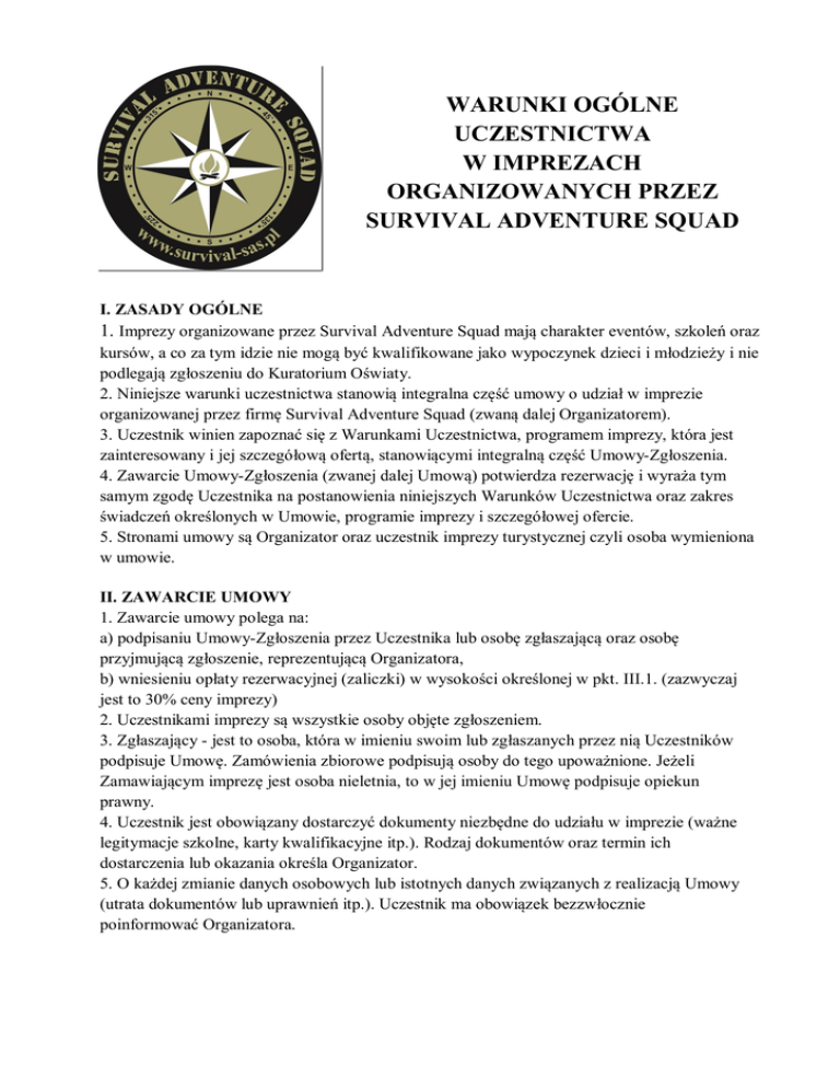 WARUNKI OGÓLNE UCZESTNICTWA W IMPREZACH ORGANIZOWANYCH PRZEZ SURVIVAL ADVENTURE SQUAD I. ZASADY OGÓLNE 1. Imprezy organizowane przez Survival Adventure Squad mają charakter eventów, szkoleń oraz kursów, a co za tym idzie nie mogą być kwalifikowane jako wypoczynek dzieci i młodzieży i nie podlegają zgłoszeniu do Kuratorium Oświaty. 2. Niniejsze warunki uczestnictwa stanowią integralna część umowy o udział w imprezie organizowanej przez firmę Survival Adventure Squad (zwaną dalej Organizatorem). 3. Uczestnik winien zapoznać się z Warunkami Uczestnictwa, programem imprezy, która jest zainteresowany i jej szczegółową ofertą, stanowiącymi integralną część Umowy-Zgłoszenia. 4. Zawarcie Umowy-Zgłoszenia (zwanej dalej Umową) potwierdza rezerwację i wyraża tym samym zgodę Uczestnika na postanowienia niniejszych Warunków Uczestnictwa oraz zakres świadczeń określonych w Umowie, programie imprezy i szczegółowej ofercie. 5. Stronami umowy są Organizator oraz uczestnik imprezy turystycznej czyli osoba wymieniona w umowie. II. ZAWARCIE UMOWY 1. Zawarcie umowy polega na: a) podpisaniu Umowy-Zgłoszenia przez Uczestnika lub osobę zgłaszającą oraz osobę przyjmującą zgłoszenie, reprezentującą Organizatora, b) wniesieniu opłaty rezerwacyjnej (zaliczki) w wysokości określonej w pkt. III.1. (zazwyczaj jest to 30% ceny imprezy) 2. Uczestnikami imprezy są wszystkie osoby objęte zgłoszeniem. 3. Zgłaszający - jest to osoba, która w imieniu swoim lub zgłaszanych przez nią Uczestników podpisuje Umowę. Zamówienia zbiorowe podpisują osoby do tego upoważnione. Jeżeli Zamawiającym imprezę jest osoba nieletnia, to w jej imieniu Umowę podpisuje opiekun prawny. 4. Uczestnik jest obowiązany dostarczyć dokumenty niezbędne do udziału w imprezie (ważne legitymacje szkolne, karty kwalifikacyjne itp.). Rodzaj dokumentów oraz termin ich dostarczenia lub okazania określa Organizator. 5. O każdej zmianie danych osobowych lub istotnych danych związanych z realizacją Umowy (utrata dokumentów lub uprawnień itp.). Uczestnik ma obowiązek bezzwłocznie poinformować Organizatora. III.WARUNKI PŁATNOŚCI 1. Umowa o udział w imprezie zostaje zawarta w momencie podpisania przez Uczestnika i przedstawiciela Survival Adventure Squad formularza zgłoszeniowego. Dodatkowo Uczestnik zobowiązany jest do dokonania przedpłaty w wysokości wcześniej ustalonej przez Organizatora. (nie mniej niż 30% ceny) 2. Pozostała część należności za imprezę winna być uiszczona nie później niż 21 dni przed rozpoczęciem imprezy lub w terminie określonym w Umowie. 3. Jeżeli umowa zostanie zawarta później niż 21 dni przed rozpoczęciem imprezy, uczestnik jest zobowiązany zapłacić całą kwotę w dniu zgłoszenia lub w terminie określonym przez organizatora. 4. Brak zapłaty lub niedostarczenie na żądanie Organizatora potwierdzenia dokonania płatności w terminie określonym w ust. 2 oznacza odstąpienie od umowy przez Uczestnika i rodzi skutki zgodnie z pkt IX ust.2 niniejszych Warunków Uczestnictwa. 5. Za datę dokonania płatności przyjmuje się dzień wpływu należności na konto bankowe Organizatora lub dzień wpłaty gotówkowej w siedzibie Organizatora IV. REALIZACJA 1. Organizator imprezy zobowiązuje się do świadczenia usług w sposób zgodny z warunkami określonymi w ofercie, programie imprezy lub Umowie. 2. W czasie trwania imprezy Uczestnik ma prawo do wszystkich świadczeń określonych w programie imprezy lub Umowie. 3. Przedstawiciel Organizatora (np. kierownik imprezy, instruktorzy) obecny na imprezie zapewnia Uczestnikom przebieg imprezy zgodnie z programem lub Umową, dba o jakość świadczonych usług, przyjmuje od uczestników reklamacje i podejmuje działania zmierzające do ich wyjaśnienia. 4. Na życzenie grupy i za zgodą przedstawiciela Organizatora program imprezy może ulec zmianie, o ile nie powoduje ona zwiększenia kosztów lub nie utrudnia realizacji pozostałej części programu. 5. Jeżeli Uczestnik będzie chciał zrezygnować z imprezy i na swoje miejsce zgłosi innego uczestnika, który będzie spełniał konieczne warunki do udziału w danej imprezie i dodatkowo przejmie obowiązki wynikające z umowy musi powiadomić Organizatora w terminie określonym w umowie. Za nie zapłaconą część ceny imprezy oraz koszty, które Organizator poniósł w wyniku zmiany uczestnika imprezy, Uczestnik i osoba, która przejmuje jego uprawnienia odpowiadają wspólnie. 6. Jeżeli w czasie trwania imprezy Organizator nie może z przyczyn od siebie niezależnych wykonać przewidzianych w Umowie usług stanowiących istotną część programu, to jest obowiązany zapewnić świadczenia zastępcze. Jeśli nie ma możliwości zapewnienia świadczeń zastępczych, Uczestnikowi przysługuje możliwość żądania obniżenia ceny albo odstąpienia od Umowy i zwrot wartości niezrealizowanych świadczeń. V. UDZIAŁ W IMPREZACH PRZEZNACZONYCH DLA OSÓB NIEPEŁNOLETNICH 1. Osoby niepełnoletnie biorą udział w imprezie za zgodą i na wniosek rodziców (opiekunów prawnych). Rodzice (opiekunowie) są odpowiedzialni materialnie za szkody wyrządzone przez dziecko i z tego tytułu przyjmują na siebie pełną odpowiedzialność cywilnoprawną. Organizatorzy nie ponoszą odpowiedzialności za pieniądze, przedmioty wartościowe oraz rzeczy pozostawione przez uczestników podczas pobytu na obozie i w środkach transportu. 2. Osoby niepełnoletnie biorące udział w imprezach turystycznych, są bezwzględnie obowiązane dostarczyć Organizatorowi najpóźniej w dniu wyjazdu poprawnie wypełniony dokument "Karta kwalifikacyjna uczestnika ", który jest najważniejszą informacją o stanie zdrowia Uczestnika. 3. Niedostarczenie tego dokumentu może być powodem odmowy przyjęcia Uczestnika na obóz. Przyjęcie na obóz może nastąpić dopiero w momencie dostarczenia prawidłowej karty kwalifikacyjnej. W przypadku nie przyjęcia Uczestnik