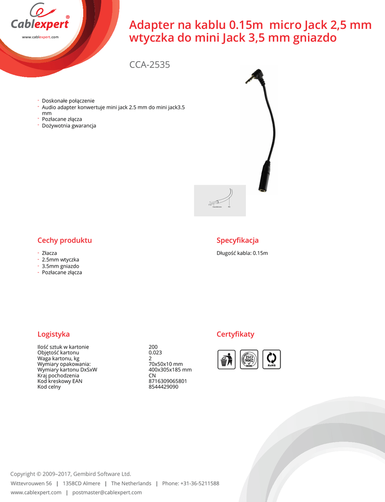 www.cablexpert.com Adapter na kablu 0.15m micro Jack 2,5 mm wtyczka do mini Jack 3,5 mm gniazdo CCA-2535 - Doskonałe połączenie - Audio adapter konwertuje mini jack 2.5 mm do mini jack3.5 mm - Pozłacane złącza - Dożywotnia gwarancja Cechy produktu Specyfikacja - Długość kabla: 0.15m Złacza 2.5mm wtyczka 3.5mm gniazdo Pozłacane złącza Logistyka Ilość sztuk w kartonie Objętość kartonu Waga kartonu, kg Wymiary opakowania: Wymiary kartonu DxSxW Kraj pochodzenia Kod kreskowy EAN Kod celny Certyfikaty 200 0.023 2 70x50x10 mm 400x305x185 mm CN 8716309065801 8544429090 Copyright © 2009–2017, Gembird Software Ltd. Wittevrouwen 56 | 1358CD Almere | The Netherlands | Phone: +31-36-5211588 www.cablexpert.com | [email protected]
