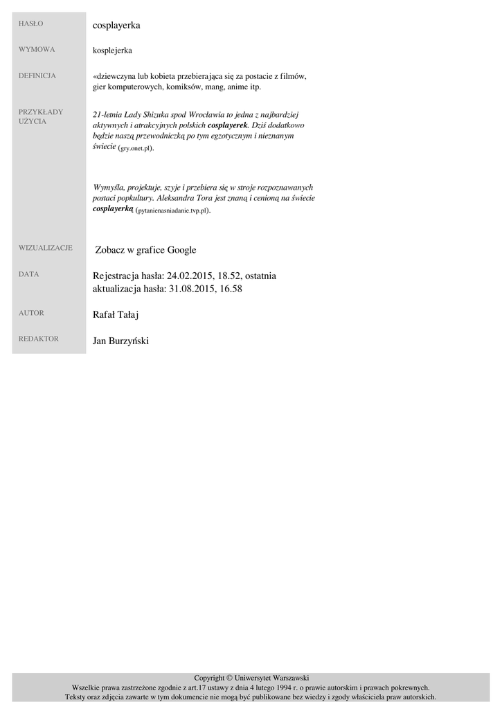 HASŁO cosplayerka WYMOWA kosplejerka DEFINICJA «dziewczyna lub kobieta przebierająca się za postacie z filmów, gier komputerowych, komiksów, mang, anime itp.» PRZYKŁADY UŻYCIA 21-letnia Lady Shizuka spod Wrocławia to jedna z najbardziej aktywnych i atrakcyjnych polskich cosplayerek. Dziś dodatkowo będzie naszą przewodniczką po tym egzotycznym i nieznanym świecie (gry.onet.pl). Wymyśla, projektuje, szyje i przebiera się w stroje rozpoznawanych postaci popkultury. Aleksandra Tora jest znaną i cenioną na świecie cosplayerką (pytanienasniadanie.tvp.pl). WIZUALIZACJE Zobacz w grafice Google DATA Rejestracja hasła: 24.02.2015, 18.52, ostatnia aktualizacja hasła: 31.08.2015, 16.58 AUTOR Rafał Tałaj REDAKTOR Jan Burzyński Copyright © Uniwersytet Warszawski Wszelkie prawa zastrzeżone zgodnie z art.17 ustawy z dnia 4 lutego 1994 r. o prawie autorskim i prawach pokrewnych. Teksty oraz zdjęcia zawarte w tym dokumencie nie mogą być publikowane bez wiedzy i zgody właściciela praw autorskich. Powered by TCPDF (www.tcpdf.org)