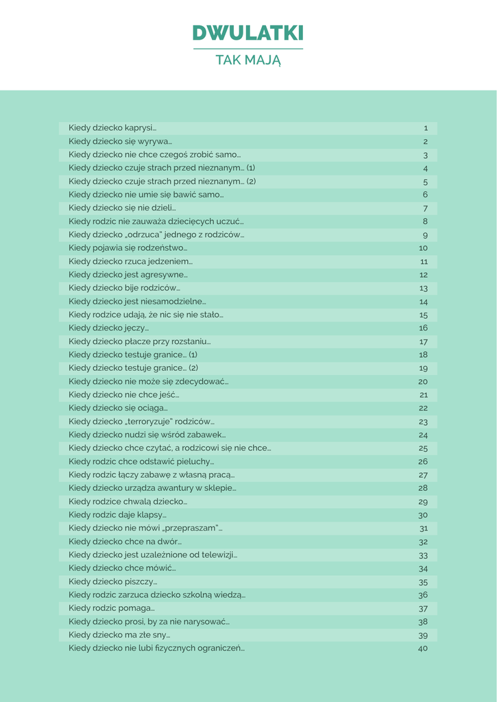 DWULATKI TAK MAJĄ Kiedy dziecko kaprysi… 1 Kiedy dziecko się wyrywa… 2 Kiedy dziecko nie chce czegoś zrobić samo… 3 Kiedy dziecko czuje strach przed nieznanym… (1) 4 Kiedy dziecko czuje strach przed nieznanym… (2) 5 Kiedy dziecko nie umie się bawić samo… 6 Kiedy dziecko się nie dzieli… 7 Kiedy rodzic nie zauważa dziecięcych uczuć… 8 Kiedy dziecko „odrzuca” jednego z rodziców… 9 Kiedy pojawia się rodzeństwo… 10 Kiedy dziecko rzuca jedzeniem… 11 Kiedy dziecko jest agresywne… 12 Kiedy dziecko bije rodziców… 13 Kiedy dziecko jest niesamodzielne… 14 Kiedy rodzice udają, że nic się nie stało… 15 Kiedy dziecko jęczy… 16 Kiedy dziecko płacze przy rozstaniu… 17 Kiedy dziecko testuje granice… (1) 18 Kiedy dziecko testuje granice… (2) 19 Kiedy dziecko nie może się zdecydować… 20 Kiedy dziecko nie chce jeść… 21 Kiedy dziecko się ociąga… 22 Kiedy dziecko „terroryzuje” rodziców… 23 Kiedy dziecko nudzi się wśród zabawek… 24 Kiedy dziecko chce czytać, a rodzicowi się nie chce… 25 Kiedy rodzic chce odstawić pieluchy… 26 Kiedy rodzic łączy zabawę z własną pracą… 27 Kiedy dziecko urządza awantury w sklepie… 28 Kiedy rodzice chwalą dziecko… 29 Kiedy rodzic daje klapsy… 30 Kiedy dziecko nie mówi „przepraszam”… 31 Kiedy dziecko chce na dwór… 32 Kiedy dziecko jest uzależnione od telewizji… 33 Kiedy dziecko chce mówić… 34 Kiedy dziecko piszczy… 35 Kiedy rodzic zarzuca dziecko szkolną wiedzą… 36 Kiedy rodzic pomaga… 37 Kiedy dziecko prosi, by za nie narysować… 38 Kiedy dziecko ma złe sny… 39 Kiedy dziecko nie lubi fizycznych ograniczeń… 40