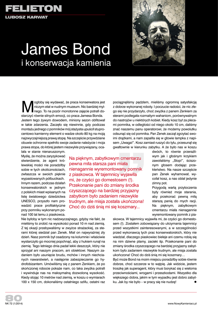 FELIETON LUBOSZ KARWAT James Bond i konserwacja kamienia M ogłoby się wydawać, że praca konserwatora jest pociągnęliśmy pędzlem, mieliśmy ogromną satysfakcję niczym etat w nudnym muzeum. Nic bardziej mylz dobrze wykonanej roboty. I poczucie radości, że nic złenego. To na pozór monotonne zajęcie potrafi dogo się nie przydarzyło, choć zwyżka z panem Zenkiem za starczyć równie silnych emocji, co praca Jamesa Bonda. sterami podlegała rozmaitym wahaniom, porównywalnym Jestem tego żywym dowodem, miniony sezon obfitował do nastrojów u niektórych kobiet. Kiedy kosz był za plecaw takie zdarzenia. Zaczęło się niewinnie, gdy podczas mi pomnika, w odległości od niego około 10 cm, daliśmy montażu jednego z pomników mój stażysta upuścił stuproznać naszemu panu operatorowi, że możemy powolutku centowo kamienny element o wadze około 80 kg na moją odsunąć się od pomnika. Pan Zenek zaczął zgrzytać swonajzwyczajniejszą prawą stopę. Na szczęście przywdziane imi drążkami, a nam zapaliła się w głowie lampka z napiobuwie ochronne spełniło swoje zadanie należycie i moja sem „Uwaga!”. Kosz zamiast ruszyć do tyłu, przesunął się prawa stopa, do której jestem niezwykle przywiązany, ocagwałtownie w kierunku zabytku. A że było nas w koszu lała w stanie nienaruszonym. dwóch, to równie przeraźliMyślę, że można zaryzykować wym jak i głośnym krzykiem Na pięknym, zabytkowym cmentarzu stwierdzenie, że agent krózawołaliśmy „Stop!”, ściszolewskiej mości nie poradziłby pewna miła starsza pani miała nym głosem dodając przesobie w tych okolicznościach, nienagannie wyremontowany pomnik kleństwo. Na nasze szczęście zwłaszcza w swoich pięknie z piaskowca. W tajemnicy wyjawiła pan Zenek wyhamował, wywypastowanych półbucikach. cofał kosz, a nas oblał jedynie mi, że czyści go domestosem (!). Innym razem, podczas działań zimny pot. Przekonanie pani do zmiany środka konserwatorskich w jednym Przygodą wartą przytoczenia z polskich miast wpisanych na czyszczącego na bardziej przyjazny były również moje starania, listę światowego dziedzictwa zabytkom było zadaniem niezwykle aby przekonać pewną miłą UNESCO, przyszło nam pro- trudnym, ale misja została ukończona! starszą panią do mych racji. wadzić prace profilaktyczne Na pięknym, zabytkowym Choć do dziś śnią mi się koszmary... przy pomniku wykonanym pocmentarzu miała nienagannie nad 100 lat temu z piaskowca. wyremontowany pomnik z piaNie byłoby w tym nic nadzwyczajnego, gdyby nie fakt, że skowca. W tajemnicy wyjawiła mi, że czyści go domestomieliśmy to zrobić na wysokości ponad 10 m nad ziemią. sem (!). Zostałem zobowiązany do utrzymania tajemnicy Z tej okazji przebywaliśmy w zwyżce strażackiej, za steprzed wszystkimi zainteresowanymi, a w szczególności rami której siedział pan Zenek. Miał on najwyraźniej zły przed wykonawcą tych prac konserwatorskich, który nie dzień. Nasz pomnik był osadzony na kolumnie i właściwie wiedział, dlaczego piaskowiec bieleje ani czemu robią się wystarczyło go mocniej popchnąć, aby z hukiem runął na na nim dziwne plamy, zacieki itp. Przekonanie pani do ziemię. Tego letniego dnia padał lekki deszczyk, który nie zmiany środka czyszczącego na bardziej przyjazny zabytsprzyjał ani naszym pracom, ani obiektowi. Naszym zakom było zadaniem niezwykle trudnym, ale misja została daniem było usunięcie brudu, mchów i innych niechciaukończona! Choć do dziś śnią mi się koszmary… nych nawarstwień, a następnie zabezpieczenie go hyByć może Bond na moim miejscu poradziłby sobie równie drofobizantem. Umówiliśmy się z panem Zenkiem, że po dobrze, choć szczerze w to wątpię. Jak widzicie, jestem skończonej robocie pokaże nam, co taka zwyżka potrafi troszkę jak superagent, który musi borykać się z wieloma i wywinduje nas na maksymalną dozwoloną wysokość. przeciwnościami, wrogami i przeszkodami. Wszystko dla Kiedy stojąc 10 metrów nad ziemią, w koszu o wymiarach większego dobra, jakim w tym wypadku jest dobro zabyt100 x 150 cm, dokonaliśmy ostatniego szlifu, ostatni raz ku. Jak by nie było – w pracy się nie nudzę! ” 80 NK 72 (1/2014) www.NowyKamieniarz.pl