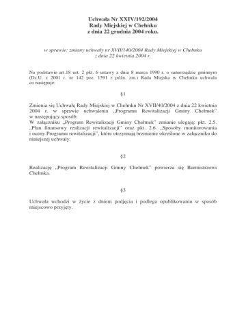 Uchwała Nr XXIV/192/2004 Rady Miejskiej w Chełmku z dnia 22 grudnia 2004 roku. w sprawie: zmiany uchwały nr XVII/140/2004 Rady Miejskiej w Chełmku z dnia 22 kwietnia 2004 r. Na podstawie art.18 ust. 2 pkt. 6 ustawy z dnia 8 marca 1990 r. o samorz dzie gminnym (Dz.U. z 2001 r. nr 142 poz. 1591 z pó n. zm.) Rada Miejska w Chełmku uchwala co nast puje: §1 Zmienia si Uchwał Rady Miejskiej w Chełmku Nr XVII/40/2004 z dnia 22 kwietnia 2004 r. w sprawie uchwalenia „Programu Rewitalizacji Gminy Chełmek” w nast puj cy sposób: W zał czniku „Program Rewitalizacji Gminy Chełmek” zmianie ulegaj : pkt. 2.5. „Plan finansowy realizacji rewitalizacji” oraz pkt. 2.6. „Sposoby monitorowania i oceny Programu rewitalizacji”, które otrzymuj brzmienie okre lone w zał czniku do niniejszej uchwały. §2 Realizacj „Program Rewitalizacji Gminy Chełmek” powierza si Chełmka. Burmistrzowi §3 Uchwała wchodzi w ycie z dniem podj cia i podlega opublikowaniu w sposób miejscowo przyj ty. Zał cznik do Uchwały nr XXIV/192/2004 Rady Miejskiej w Chełmku Chełmek, dnia 22 grudnia 2004 r. 2.5. PLAN FINANSOWY REALIZACJI REWITALIZACJI. ródła finansowania zada obj tych Programem Rewitalizacji Gminy Chełmek: rodki własne bud etu Gminy, rodki strukturalne Unii Europejskiej (Europejski Fundusz Rozwoju Regionalnego), bud et pa stwa (Ministerstwo Gospodarki i Pracy). Funduszem strukturalnym, którego rodki planuje si wykorzysta na zadania z zakresu rewitalizacji, jest Europejski Fundusz Rozwoju Regionalnego w ramach Zintegrowanego Programu Operacyjnego Rozwoju Regionalnego (ZPORR), Priorytet 3: Rozwój lokalny, 3.3.2.: „Rewitalizacja obszarów poprzemysłowych i powojskowych”. Tabela 8. Finansowanie Programu Rewitalizacji Gminy Chełmek. Termin realizacji Zadanie Zadanie I Utworzenie Regionalnego O rodka Szkoleniowego dla Osób Zagro onych Bezrobociem Zadanie II Przebudowa Placu Kili skiego Zadanie III Budowa Domu Pami ci Baty Zadanie IV Przebudowa ul. Baty od 2004 r. do 2004 r. Warto kosztorysowa Ogółem rodki rodki krajowe w zł. strukturalne zadania bud et bud et UE w zł. (brutto) gminy pa stwa w zł. 400 000 60 000 40 000 300 000 2005 r. 2005 r. 1 924 753 288 718 192 475 1 443 560 2004 r. 2004 r. 50 000 7 500 5 000 37 500 2005 r. 2005 r. 336 209 50 438 33 621 252 150 2004 r. 2004 r. 50 000 7 500 5 000 37 500 2005 r. 2005 r. 1 820 389 273 059 182 039 1 365 291 2005 r. 2005 r. 41 745 6 262 4 175 31 308 2006 r. 2006 r. 236 508 35 477 23 650 177 381 Zadanie V Przebudowa drogi na przedpolu Strefy 2005 r. 2005 r. 176 910 26 537 17 691 132 682 2006 r. 2006 r. 1 002 436 150 366 100 243 751 827 Zadanie VI Przebudowa ul. Kochanowskiego 2005 r. 2005 r. 79 625 11 945 7 962 59 718 2006 r. 2006 r. 451 138 67 672 45 113 338 353 2005 r. 2005 r. 273 790 41 069 27 379 205 342 2006 r. 2006 r. 1 550 357 232 555 155 035 1 162 767 8 393 860 1 259 098 839 383 6 295 379 100% 15% 10% 75% Zadanie VII Budowa parkingu RAZEM % 2.6. SPOSOBY MONITOROWANIA I OCENY PROGRAMU REWITALIZACJI Projekt Rozwoju Miejskiej Strefy Aktywno ci Gospodarczej w Chełmku, zawarty w niniejszym Programie Rewitalizacji, b dzie po jego zako czeniu zarz dzany i finansowany przez Gmin Chełmek oraz zachowa zało one cele przynajmniej przez okres 5 lat od daty jego zako czenia. Przewiduje si nast puj ce produkty realizacji Programu Rewitalizacji: powierzchni przebudowanych dróg dojazdowych i dróg wokół strefy – 7465,8 m2, powierzchni chodników przy powy szych drogach – 1150,8 m2, powierzchni parkingów dla samochodów ci arowych i osobowych - 3191,7 m2, powierzchni pomieszcze przeznaczonych na Regionalny O rodek Szkoleniowy dla Osób Zagro onych Bezrobociem – 424,1 m2, powierzchni ogółem Domu Pami ci Baty - 850 m2. Realizacja zało onego Programu Rewitalizacji przyczyni si do: udost pnienia 27 ha terenów inwestycyjnych, powstania nowych przedsi biorstw na terenie strefy – szacowana liczba to ok. 15 w ci gu 5 lat, powstania miejsc pracy w trakcie realizacji programu – szacowana liczba to ok. 40 stanowisk w ci gu 3 lat, zorganizowania szkole w Regionalnym O rodku w okresie 5 lat – ok. 26, powstania nowych miejsc pracy w strefie w okresie 5 lat – ok.300, powstania miejsc pracy w otoczeniu inwestycji – ok. 50, uruchomienia ok. 15 nowych podmiotów gospodarczych w s siedztwie strefy. Tabela 9. Planowane produkty realizacji Programu Rewitalizacji Gminy Chełmek. Wska niki planowanych produktów Powierzchnia przebudowanych dróg dojazdowych i dróg wokół strefy (ogółem 7465,8 m2) Powierzchnia chodników przy drogach dojazdowych do strefy (ogółem 1150,8 m2) Powierzchnia ogółem parkingów strefy (ogółem 3191,7 m2) Powierzchnia pomieszcze przeznaczonych na Regionalny O rodek (ogółem 424,1 m2) Powierzchnia ogółem Domu Pami ci Baty (850,7 m2) ródło Jednostka pozyskania miary informacji 2004 r. 2005 r. 2006 r. 2007 r. 2008 r. Protokół odbioru m2 0 0 7465,8 7465,8 7465,8 Protokół odbioru m2 0 0 1150,8 1150,8 1150,8 Protokół odbioru m2 0 0 3191,7 3191,7 3191,7 Protokół odbioru m2 0 424,1 424,1 424,1 424,1 Protokół odbioru m2 0 850,7 850,7 850,7 850,7 Tabela 10. Wska niki planowanych rezultatów w ramach Programu Rewitalizacji. Wska niki ródło planowanych pozyskania oddziaływa informacji Powierzchnia udost pnionych terenów inwestycyjnych (ogółem 27 ha) Liczba nowych przedsi biorstw powstałych na terenie strefy (w ci gu 5 lat – 15 podmiotów gosp.) Liczba miejsc pracy w trakcie realizacji projektu (ogółem 40 osób) Jedn. miary 2004 r. 2005 r. 2006 r. 2007 r. 2008 r. Dokumentacja Urz d Miejski w Chełmku – Wydział AGK ha 0 0 27 27 27 Ewidencja działalno ci gospodarczej Roczniki statystyczne liczba 1 2 7 10 15 Dokumentacja wykonawcy liczba 15 30 40 0 0 Liczba szkole w Regionalnym O rodku (ogółem liczba szkole przez 5 lat – 26) Liczba osób korzystaj cych z usług Regionalnego O rodka (ogółem 6600 osób przez 5 lat) Liczba odwiedzaj cych Dom Pami ci Baty (ogółem 3000 osób przez 5 la