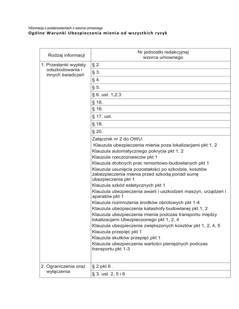 Informacja o postanowieniach z wzorca umownego Ogólne Warunki Ubezpieczenia mienia od wszystkich ryzyk Nr jednostki redakcyjnej wzorca umownego Rodzaj informacji 1. Przesłanki wypłaty odszkodowania i innych świadczeń § 2. § 3. § 4. § 5. § 6. ust. 1,2,3 § 18. § 16. § 17. ust. § 18. § 20. Załącznik nr 2 do OWU: Klauzula ubezpieczenia mienia poza lokalizacjami pkt 1, 2 Klauzula automatycznego pokrycia pkt 1, 2 Klauzula rzeczoznawców pkt 1 Klauzula drobnych prac remontowo-budowlanych pkt 1 Klauzula usunięcia pozostałości po szkodzie, kosztów zabezpieczenia mienia przed szkodą ponad sumę ubezpieczenia pkt 1 Klauzula szkód estetycznych pkt 1 Klauzula ubezpieczenia awarii i uszkodzeń maszyn, urządzeń i aparatów pkt 1 Klauzula rozmrożenia środków obrotowych pkt 1-4 Klauzula ubezpieczenia katastrofy budowlanej pkt 1, 2 Klauzula ubezpieczenia mienia podczas transportu między lokalizacjami Ubezpieczonego pkt 1, 2, 4 Klauzula ubezpieczenia zwiększonych kosztów pkt 1, 2, 4, 5 Klauzula przepięć pkt 1 Klauzula skutków przepięć pkt 1 Klauzula ubezpieczenia wartości pieniężnych podczas transportu pkt 1-3 2. Ograniczenia oraz wyłączenia § 2 pkt 6 . § 3. ust. 2, 5 i 6 odpowiedzialności zakładu ubezpieczeń uprawniające do odmowy wypłaty odszkodowania i innych świadczeń lub ich obniżenia § 4. ust. 4 i 5 §5 § 6 ust. 1, 2 i 3 § 16. ust. 2 i 4 § 17. ust 2, 4, 7, 8 § 16. § 17. ust. 2, 4, 7, 8 § 18. Załącznik nr 1 do OWU § 4. ust.4, 7 Załącznik nr 1 do OWU § 5. ust. 3 Załącznik nr 2 do OWU: Klauzula ubezpieczenia mienia poza lokalizacjami pkt 2 ppkt a, pkt 4, 5 Klauzula automatycznego pokrycia pkt 3, 4 Klauzula rzeczoznawców pkt 3 Klauzula drobnych prac remontowo-budowlanych pkt 2, 3 Klauzula usunięcia pozostałości po szkodzie, kosztów zabezpieczenia mienia przed szkodą ponad sumę ubezpieczenia pkt 1 ppkt b, pkt 3 Klauzula szkód estetycznych pkt 2 Klauzula ubezpieczenia awarii i uszkodzeń maszyn, urządzeń i aparatów pkt 4-6 Klauzula rozmrożenia środków obrotowych pkt 2-4 Klauzula ubezpieczenia katastrofy budowlanej pkt 3-5 Klauzula ubezpieczenia mienia podczas transportu między lokalizacjami Ubezpieczonego pkt 5-8 Klauzula ubezpieczenia zwiększonych kosztów pkt 3, 6, 7 Klauzula przepięć pkt 1, 3, 4, 6, 7 Klauzula skutków przepięć pkt 2, 3,4, 5 Klauzula ubezpieczenia wartości pieniężnych podczas transportu pkt 11, 12 2 OGÓLNE WARUNKI UBEZPIECZENIA MIENIA OD WSZYSTKICH RYZYK § 1 (postanowienia ogólne) 1. Na podstawie niniejszych ogólnych warunków ubezpieczenia (OWU), Towarzystwo Ubezpieczeń Wzajemnych MEDICUM (zwane dalej Ubezpieczycielem), w zakresie działalności swojego przedsiębiorstwa zawiera umowy ubezpieczenia z osobami fizycznymi prowadzącymi działalność gospodarczą, osobami prawnymi lub jednostkami organizacyjnymi nieposiadającymi osobowości prawnej (zwanymi dalej Ubezpieczającymi). 2. Ubezpieczającym może być każdy podmiot prowadzący ewidencję mienia w formie przewidzianej w ustawie o rachunkowości. 3. Ubezpieczający może zawrzeć umowę ubezpieczenia na cudzy rachunek (Ubezpieczonego). Postanowienia niniejszych OWU stosuje się odpowiednio również do Ubezpieczonego, z zastrzeżeniem, że roszczenie o zapłatę składki przysługuje wyłącznie przeciwko Ubezpieczającemu. 4. Za porozumieniem stron, do umowy ubezpieczenia mogą być wprowadzone postanowienia dodatkowe lub odmienne od ustalonych w niniejszych OWU, w szczególności zakres ubezpieczenia przewidziany postanowieniami OWU może zostać zmodyfikowany na podstawie odpowiednich klauzul dodatkowych. Postanowienia te powinny być sporządzone na piśmie. § 2 (definicje) W rozumieniu niniejszych OWU, wymienione niżej określenia oznaczają: 1) akty terroryzmu - działania z użyciem przemocy lub próby zastraszenia społeczeństwa albo jego części, organizowane z pobudek politycznych, religijnych, ideologicznych, ekonomicznych lub społecznych, 2) budowle - trwale związane z gruntem obiekty budowlane niebędące budynkami, stanowiące wraz z wbudowanymi instalacjami i urządzeniami technicznymi całość techniczną i użytkową, takie jak: wiaty, wieże, kominy, maszty antenowe oraz wolnostojące trwale związane z gruntem urządzenia reklamowe, z zastrzeżeniem, że budowli nie stanowią obiekty liniowe, których charakterystycznym parametrem jest długość (drogi, linie kolejowe, sieci przesyłowe, kanalizacja kablowa wraz z kablami, wały przeciwpowodziowe), 3) budynki - trwale związane z gruntem obiekty budowlane jedno- lub wielokondygnacyjne, wydzielone z przestrzeni za pomocą przegród budowlanych, posiadające fundamenty i dach, wraz z wbudowanymi instalacjami i urządzeniami technicznymi oraz zainstalowanymi na stałe elementami wykończenia wnętrz, stanowiącymi całość techniczną i użytkową, 4) franszyza redukcyjna - określona w niniejszych OWU lub ustalona w umowie ubezpieczenia kwota lub procent wartości odszkodowania, pomniejszająca łączne odszkodowanie za jedną i wszystkie szkody wynikłe z jednego zdarzenia, 5) kradzież z włamaniem - dokonanie albo usiłowanie zaboru mienia z pomieszczeń lub schowków w pomieszczeniach: a) po uprzednim usunięciu siłą zabezpieczenia lub otwarciu wejścia przy użyciu narzędzi, podrobionego lub dopasowanego klucza, klucza oryginalnego bądź karty magnetycznej, w których posiadanie sprawca wszedł wskutek włamania do innego pomieszczenia lub rabunku, b) przez sprawcę, który ukrył się w pomieszczeniu przed jego zamknięciem, jeśli pozostawił ślady mogące służyć jako dowód jego potajemnego ukrycia, 6) lokal - przestrzeń wydzielona trwałymi ścianami, stanowiąca funkcjonalną lub gospodarczą całość, służąca zaspokojeniu potrzeb Ubezpieczonego, związanych z prowadzoną przez niego działalnością, użytkowana na mocy posiadanego przez niego tytułu prawnego, składająca się z jednego lub większej liczby pomieszczeń, 7) maszyny, 