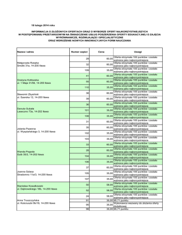 18 lutego 2014 roku INFORMACJA O ZŁOŻONYCH OFERTACH ORAZ O WYBORZE OFERT NAJKORZYSTNIEJSZYCH W POSTĘPOWANIU PRZETARGOWYM NA ŚWIADCZENIE USŁUG POSZERZENIA OFERTY EDUKACYJNEJ O ZAJĘCIA WYRÓWNAWCZE, ROZWIJAJĄCE I SPECJALISTYCZNE ORAZ WDROŻENIE NOWYCH INNOWACYJNYCH FORM NAUCZANIA Nazwa i adres Małgorzata Rzepka Smolki 31a, 14-200 Iława Grażyna Kotłowska ul. 1 Maja 31/56, 14-200 Iława Sławomir Zbysiński ul. Szeroka 12, 14-200 Iława Danuta Gubała Laseczno 73a, 14-202 Iława Jolanta Pszenna ul. Wyspiańskiego 3, 14-200 Iława Wanda Pogoda Gulb 35/2, 14-202 Iława Joanna Szlasa Stradomno 11a/3, 14-200 Iława Stanisław Kowalkowski ul. Dąbrowskiego 18b, 14-200 Iława Anna Truszczyńska ul. Kościuszki 9b/18, 14-200 Iława Numer części Cena Uwagi 29 60,00 32 60,00 109 35,00 41 60,00 55 60,00 110 35,00 38 60,00 39 60,00 36 60,00 101 35,00 108 35,00 31 60,00 35 60,00 102 35,00 103 35,00 33 60,00 28 60,00 104 35,00 106 35,00 37 60,00 105 35,00 107 35,00 50 58,00 52 58,00 24 58,00 91 35,00 95 35,00 98 35,00 Oferta otrzymała 100 punktów i została wybrana jako najkorzystniejsza Oferta otrzymała 100 punktów i została wybrana jako najkorzystniejsza Oferta otrzymała 100 punktów i została wybrana jako najkorzystniejsza Oferta otrzymała 100 punktów i została wybrana jako najkorzystniejsza Oferta otrzymała 100 punktów i została wybrana jako najkorzystniejsza Oferta otrzymała 100 punktów i została wybrana jako najkorzystniejsza Oferta otrzymała 100 punktów i została wybrana jako najkorzystniejsza Oferta otrzymała 100 punktów i została wybrana jako najkorzystniejsza Oferta otrzymała 100 punktów i została wybrana jako najkorzystniejsza Oferta otrzymała 100 punktów i została wybrana jako najkorzystniejsza Oferta otrzymała 100 punktów i została wybrana jako najkorzystniejsza Oferta otrzymała 100 punktów i została wybrana jako najkorzystniejsza Oferta otrzymała 100 punktów i została wybrana jako najkorzystniejsza Oferta otrzymała 100 punktów i została wybrana jako najkorzystniejsza Oferta otrzymała 100 punktów i została wybrana jako najkorzystniejsza Oferta otrzymała 100 punktów i została wybrana jako najkorzystniejsza Oferta otrzymała 100 punktów i została wybrana jako najkorzystniejsza Oferta otrzymała 100 punktów i została wybrana jako najkorzystniejsza Oferta otrzymała 100 punktów i została wybrana jako najkorzystniejsza Oferta otrzymała 100 punktów i została wybrana jako najkorzystniejsza Oferta otrzymała 100 punktów i została wybrana jako najkorzystniejsza Oferta otrzymała 100 punktów i została wybrana jako najkorzystniejsza Oferta otrzymała 100 punktów i została wybrana jako najkorzystniejsza Oferta otrzymała 100 punktów i została wybrana jako najkorzystniejsza Oferta otrzymała 100 punktów i została wybrana jako najkorzystniejsza 85,71 punktu Wykonawca wezwany do złożenia oferty dodatkowej 85,71 punktu Bogdan Pawłowski ul. 1 Maja 20a/53, 14-200 Iława Maria Fron-Zakrzewska Gaudowo 25/5, 14-241 Ząbrowo Grzegorz Zakrzewski ul. Gdańska 24, 14-240 Susz Karolina Kubicka ul. Sienkiewicza 7/1, 14-200 Iława Joanna Ewa Drozdowska ul. Smolki 6/41, 14-200 Iława Ewa Jadwiga Bogdańska ul. Kościuszki 35a/17, 14-200 Iława Czesława Grochowiecka ul. Jana III Sobieskiego 47a/3 14-200 Iława 67 60,00 154 30,00 159 30,00 2 60,00 5 60,00 77 35,00 82 35,00 87 35,00 9 60,00 1 60,00 6 60,00 44 58,00 48 58,00 118 35,00 124 35,00 129 35,00 136 35,00 42 58,00 47 58,00 122 35,00 127 35,00 134 35,00 43 58,00 46 58,00 115 35,00 121 35,00 126 35,00 133 35,00 51 58,00 114 35,00 120 35,00 130 35,00 132 35,00 Oferta otrzymała 100 punktów i została wybrana jako najkorzystniejsza Oferta otrzymała 100 punktów i została wybrana jako najkorzystniejsza Oferta otrzymała 100 punktów i została wybrana jako najkorzystniejsza Oferta otrzymała 100 punktów i została wybrana jako najkorzystniejsza Oferta otrzymała 100 punktów i została wybrana jako najkorzystniejsza Oferta otrzymała 100 punktów i została wybrana jako najkorzystniejsza Oferta otrzymała 100 punktów i została wybrana jako najkorzystniejsza Oferta otrzymała 100 punktów i została wybrana jako najkorzystniejsza Oferta otrzymała 100 punktów i została wybrana jako najkorzystniejsza Oferta otrzymała 100 punktów i została wybrana jako najkorzystniejsza Oferta otrzymała 100 punktów i została wybrana jako najkorzystniejsza Oferta otrzymała 100 punktów i została wybrana jako najkorzystniejsza Oferta otrzymała 100 punktów i została wybrana jako najkorzystniejsza Oferta otrzymała 100 punktów i została wybrana jako najkorzystniejsza Oferta otrzymała 100 punktów i została wybrana jako najkorzystniejsza Oferta otrzymała 100 punktów i została wybrana jako najkorzystniejsza Oferta otrzymała 100 punktów i została wybrana jako najkorzystniejsza Oferta otrzymała 100 punktów i została wybrana jako najkorzystniejsza Oferta otrzymała 100 punktów i została wybrana jako najkorzystniejsza Oferta otrzymała 100 punktów i została wybrana jako najkorzystniejsza Oferta otrzymała 100 punktów i została wybrana jako najkorzystniejsza Oferta otrzymała 100 punktów i została wybrana jako najkorzystniejsza Oferta otrzymała 100 punktów i została wybrana jako najkorzystniejsza Oferta otrzymała 100 punktów i została wybrana jako najkorzystniejsza Oferta otrzymała 100 punktów i została wybrana jako najkorzystniejsza Oferta otrzymała 100 punktów i została wybrana jako najkorzystniejsza Oferta otrzymała 100 punktów i została wybrana jako najkorzystniejsza Oferta otrzymała 100 punktów i została wybrana jako najkorzystniejsza Oferta otrzymała 100 punktów i została wybrana jako najkorzystniejsza Oferta otrzymała 100 punktów i została wybrana jako najkorzystniejsza Oferta otrzymała 100 punktów i została wybrana jako najkorzystniejsza Oferta otrzymała 100 punktów i została wybrana jako najkorzystniejsza Oferta otrzymała 100 punktów i zost