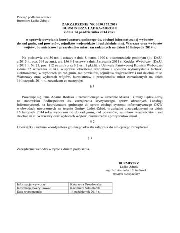 Pieczęć podłuŜna o treści Burmistrz Lądka Zdroju ZARZĄDZENIE NR 0050.175.2014 BURMISTRZA LĄDKA-ZDROJU z dnia 14 października 2014 roku w sprawie powołania koordynatora gminnego ds. obsługi informatycznej wyborów do rad gmin, rad powiatów, sejmików województw i rad dzielnic m.st. Warszay oraz wyborów wójtów, burmistrzów i prezydentów miast zarzadzonych na dzień 16 listopada 2014 r. Na podstawie art. 30 ust. 1 ustawy z dnia 8 marca 1990 r. o samorządzie gminnym (j.t. Dz.U. z 2013 r., poz. 594 ze zm.), art. 156 § 1 ustawy z dnia 5 stycznia 2011 r. Kodeks Wyborczy (Dz.U. z 2011 r. Nr 21, poz. 112 ze zm.) oraz § 2 ust. 1 pkt.lit. a Uchwały Państwowej Komisji Wyborczej z dnia 22 wtrześnia 2014 r. w sprawie określenia warunków i sposobu wykorzystania techniki elektronicznej w wyborach do rad gmin, rad powiatów, sejmików wojewódźtw i rad dzielnic m.st. Warszawy oraz wyborach wójtów, burmistrzów i prezydentów miast zarzadzonych na dzień 16 listopada 2014 r., zarządzam co następuje: §1 Powołuje się Pana Adama Rodaka – zatrudnionego w Urzedzie Miasta i Gminy Lądek-Zdrój na stanowisku Podinspektora ds. zarządzania kryzysowego, spraw obronnych i obsługi informatycznej, na koordynatora gminnego do spraw obsługi systemu informatycznego OKW w obwodach utworzonych na terenie Gminy Lądek-Zdrój, w związku z zarządzonymi na dzień 16 listopada 2014 roku wyborami do do rad gmin, rad powiatów, sejmików wojewódźtw i rad dzielnic m.st. Warszawy oraz wyborach wójtów, burmistrzów i prezydentów miast. §2 Obowiązki i zadania koordynatora gminnego określa załącznik do niniejszego zarządzenia. §3 Zarządzenie wchodzi w Ŝycie z dniem podpisania. BURMISTRZ Lądka-Zdroju mgr inŜ. Kazimierz Szkudlarek (podpis nieczytelny) Informację wytworzył: Informację zweryfikował: Data wytworzenia: Katarzyna Drozdowska Kazimierz Szkudlarek 14 październik 2014 r. Załącznik do Zarządzenia Burmistrza Lądka-Zdroju Nr 0050.175.2014 z dnia 14 października 2014 r. Zadania koordynatora gminnego Do zadań koordynatora gminnego naleŜy: 1) udział w szkoleniach organizowanych przez koordynatora właściwego dla obszaru komisarza wyborczego; 2) wsparcie wprowadzania i aktualizacji w systemie informatycznym przez właściwe komórki organizacyjne urzędu gminy danych dotyczących obwodów głosowania i ich granic, liczby uprawnionych do głosowania na obszarze gminy oraz danych o liczbie udzielonych pełnomocnictw i liczbie wysłanych pakietów wyborczych, 3) nadzór nad wprowadzeniem do systemu danych członków (kandydatów na członków) obwodowych komisji wyborczych i aktualizacją składów przez właściwe komórki organizacyjne urzędu gminy; 4) prowadzenie ewidencji informacji operatorów obsługi informatycznej OKW zawierającej dane kontaktowe i ustalony sposób przekazywania haseł, oprogramowania oraz danych definiujących obwody głosowania, okręgi wyborcze i listy kandydatów; 5) przeprowadzenie szkolenia dla operatorów OKW na obszarze gminy w zakresie obsługi informatycznej wyborów samorządowych w obwodzie głosowania; 6) prowadzenie ewidencji wersji zainstalowanego oprogramowania i wersji danych definiujących wykaz obwodów, list i kandydatów, 7) przekazanie przewodniczącym OKW oraz operatorom obsługi informatycznej OKW loginów i haseł do pobrania licencji, a w sytuacji szczególnej przekazanie loginu i hasła dla pobrania licencji zastępcy przewodniczącego; 8) dystrybucja oprogramowania oraz danych definicyjnych dla kaŜdego obwodu głosowania bez dostępu do sieci Internet (poprzez pobranie ze stron internetowych i utworzenie nośników), takŜe w przypadku testów, o którym mowa w punkcie 13; 9) dystrybucja aktualizowanych plików definicyjnych uwzględniających uzyskane od koordynatora komisarza wyborczego zmiany danych o kandydatach do rad oraz kandydatów na wójta (burmistrza, prezydenta miasta) dla obwodów nieposiadających dostępu do sieci Internet; 10) przyjmowanie uwag dotyczących działania programu oraz udzielanie wsparcia technicznego operatorom obsługi informatycznej OKW; 11) zgłaszanie uwag dotyczących działania programu koordynatorowi komisarza; 12) w przypadkach awaryjnych nawiązanie kontaktu i przekazanie informacji koordynatorowi komisarza; 13) udział w przygotowaniu i przeprowadzeniu testów ogólnokrajowych przekazywania danych testowych o wynikach głosowania ze wszystkich komisji obwodowych korzystających ze wsparcia informatycznego oraz organizacja wprowadzania i przekazywania danych testowych z obwodów nieposiadających obsługi informatycznej; 14) przekazanie do koordynatora komisarza wniosków i spostrzeŜeń w formie raportu podsumowującego przebieg testów ogólnokrajowych; 15) przygotowanie wydruków formularzy protokołów wyników głosowania w obwodzie (dla ewentualnego ręcznego sporządzenia protokołów); 16) w dniu głosowania – dwukrotne przekazanie danych o liczbie osób ujętych w spisie wyborców oraz o liczbie wydanych kart do głosowania (tzw. frekwencji) w sytuacji, o której mowa w pkt. 15 załącznika uchwały Państwowej Komisji Wyborczej z dnia … września 2014 r. w sprawie trybu i sposobu przekazywania przez komisarzy wyborczych obwodowe komisje wyborcze Państwowej Komisji Wyborczej w trakcie głosowania danych o liczbie osób uprawnionych do głosowania oraz o liczbie wyborców, którym wydano karty do głosowania w stałych obwodach głosowania w wyborach do rad gmin, rad powiatów, sejmików województw i rad dzielnic m. st. Warszawy oraz wyborów wójtów, burmistrzów i prezydentów miast w 2014 r.; 17) prowadzenie dziennika zdarzeń, w którym są odnotowywane wykonane czynności: a) przeprowadzenie szkolenia operatorów OKW z potwierdzeniem uczestnictwa, b) zgłaszanie z poziomu gminy uwag do działania programu do koordynatora komisarza wyborczego właściwego dla gminy, c) przygotowanie i otrzymanie potwierdzenia przekazania haseł przewodniczącym OKW i operat