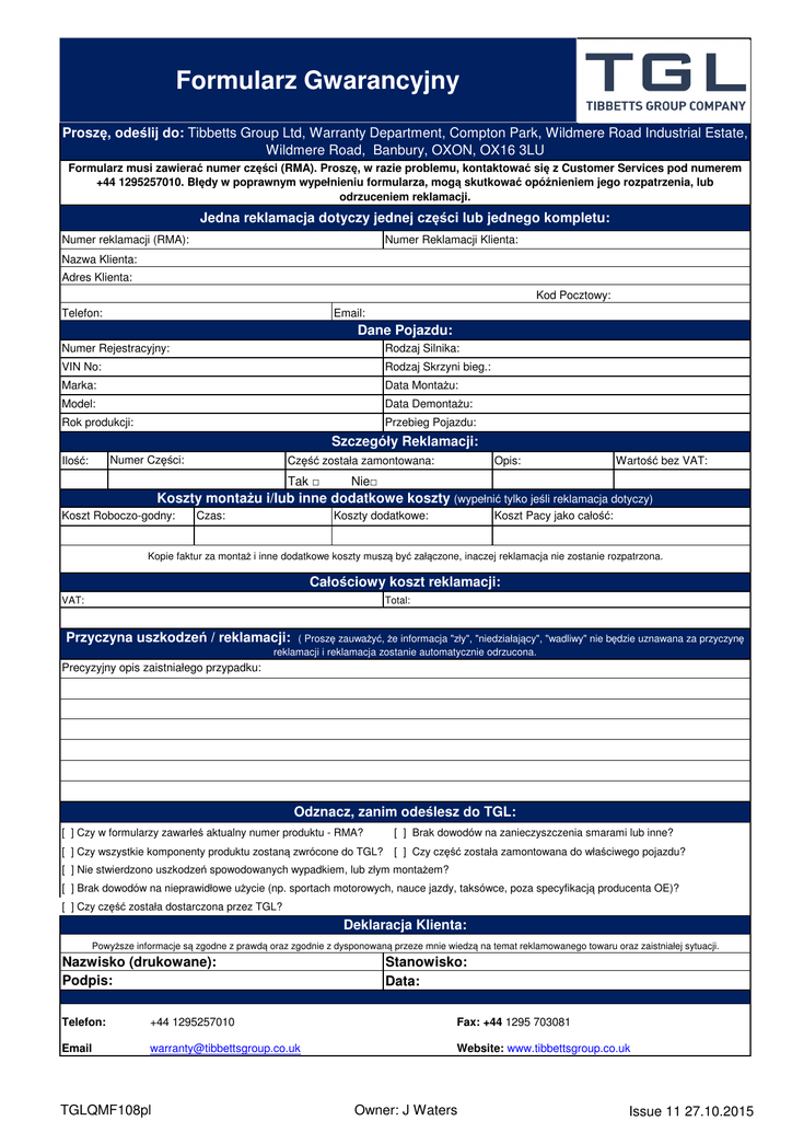 Formularz Gwarancyjny Proszę, odeślij do: Tibbetts Group Ltd, Warranty Department, Compton Park, Wildmere Road Industrial Estate, Wildmere Road, Banbury, OXON, OX16 3LU Formularz musi zawierać numer części (RMA). Proszę, w razie problemu, kontaktować się z Customer Services pod numerem +44 1295257010. Błędy w poprawnym wypełnieniu formularza, mogą skutkować opóźnieniem jego rozpatrzenia, lub odrzuceniem reklamacji. Jedna reklamacja dotyczy jednej części lub jednego kompletu: Numer reklamacji (RMA): Numer Reklamacji Klienta: Nazwa Klienta: Adres Klienta: Kod Pocztowy: Telefon: Email: Dane Pojazdu: Numer Rejestracyjny: Rodzaj Silnika: VIN No: Rodzaj Skrzyni bieg.: Marka: Data Montażu: Model: Data Demontażu: Przebieg Pojazdu: Rok produkcji: Szczegóły Reklamacji: Numer Części: Ilość: Część została zamontowana: Tak □ Opis: Wartość bez VAT: Nie□ Koszty montażu i/lub inne dodatkowe koszty (wypełnić tylko jeśli reklamacja dotyczy) Koszt Roboczo-godny: Czas: Koszty dodatkowe: Koszt Pacy jako całość: Kopie faktur za montaż i inne dodatkowe koszty muszą być załączone, inaczej reklamacja nie zostanie rozpatrzona. Całościowy koszt reklamacji: VAT: Total: Przyczyna uszkodzeń / reklamacji: ( Proszę zauważyć, że informacja "zły", "niedziałający", "wadliwy" nie będzie uznawana za przyczynę reklamacji i reklamacja zostanie automatycznie odrzucona. Precyzyjny opis zaistniałego przypadku: Odznacz, zanim odeślesz do TGL: [ ] Czy w formularzy zawarłeś aktualny numer produktu - RMA? [ ] Brak dowodów na zanieczyszczenia smarami lub inne? [ ] Czy wszystkie komponenty produktu zostaną zwrócone do TGL? [ ] Czy część została zamontowana do właściwego pojazdu? [ ] Nie stwierdzono uszkodzeń spowodowanych wypadkiem, lub złym montażem? [ ] Brak dowodów na nieprawidłowe użycie (np. sportach motorowych, nauce jazdy, taksówce, poza specyfikacją producenta OE)? [ ] Czy część została dostarczona przez TGL? Deklaracja Klienta: Powyższe informacje są zgodne z prawdą oraz zgodnie z dysponowaną przeze mnie wiedzą na temat reklamowanego towaru oraz zaistniałej sytuacji. Nazwisko (drukowane): Podpis: Stanowisko: Data: Telefon: +44 1295257010 Fax: +44 1295 703081 Email [email protected] Website: www.tibbettsgroup.co.uk TGLQMF108pl Owner: J Waters Issue 11 27.10.2015 Warunki Gwarancji na produkty TGL Okres Gwarancji. Samochody Osobowe oraz małe samochody dostawcze – 3 lata lub 48 000 km, w zależności, co nastąpi wcześniej. Samochody Ciężarowe – 3 lata lub 480 000 km, w zależności, co nastąpi wcześniej. Rodzaj Gwarancji: Bezsporna – gwarancja rozpatrzona jest, jako zwrot kosztów zakupu tylko na części dostarczone przez TGL. Oferta „bezsporna” odnosi się tylko do przypadków, z którymi nie są związane dodatkowe koszty dołączone do wniosków. Gwarancja nie zostanie uznana, jeśli części noszą ślady: 1. 2. 3. 4. Nieprawidłowego montażu; Złego dobrania części; Niewłaściwego posługiwania się pojazdem; Zanieczyszczenia smarami / olejami lub dowody na użycie smaru miedzianego; 5. Uszkodzeń, podczas transport, montażu; 6. Brakujących części; Wnioski gwarancyjne, które nadejdą do firmy TGL, bez zawartego w nim numeru reklamacji (RMA), nie zostaną rozparzone, a towar może zostać odesłany na koszt składającego wniosek. Sporna – Sytuacja, kiedy oprócz wadliwej części, występują roszczenia dodatkowe, np. dotyczące kosztów robocizny. W tym wypadku, wszystkie reklamowane części przechodzą indywidualne testy i analizy w laboratorium dostawcy. Jeśli okaże się, że część odpowiada specyfikacji producenta, gwarancja zostanie odrzucona. W przypadku stwierdzenia wady produkcyjnej, roszczenie staje się zasadne i gwarancja zostanie rozpatrzona pozytywnie. Zwrot kosztów za holowanie pojazdu, garażowanie / parkowanie, wynajmu samochodu zastępczego, nie są objęte ofertą gwarancyjną firmy TGL. Wszystkie stawki za roboczogodziny są porównywane z oficjalnymi stawkami w danym regionie, a czas napraw zestawiany ze statystykami ICME. Wnioski gwarancyjne, które nadejdą do firmy TGL, bez zawartego w nim numeru reklamacji (RMA), nie zostaną rozparzone, a towar może zostać odesłany na koszt składającego wniosek. TGLQMF108pl Owner: J Waters Issue 11 27.10.15 Każdy zwrot należności z tytułu gwarancji, wypłacany jest, jako pełny i ostateczny. TGL nie akceptuje roszczeń regresowych, po wcześniejszym pozytywnym rozpatrzeniu reklamacji. Wyłączenia z oferty gwarancyjnej firmy TGL: Jeśli części zostały zamontowane w pojeździe jeżdżącym jako nauka jazdy; Jeśli części zostały zamontowane w pojeździe jeżdżącym Taksówka, lub profesjonalny przewóz osób; Jeśli części zostały zamontowane w pojeździe biorącym udział w wyścigach, sportach motorowych; Wszystkie odrzucone wnioski reklamacyjne wraz z reklamowaną częścią, będą przechowywane przez firmę TGL przez 30 dni od daty odrzucenia wniosku. Jeśli klient życzy sobie odesłania reklamowanej części, proszę o kontakt z naszym Customer Service. Procedura zwrotów Gwarancyjnych: 1. Zidentyfikuj, czy część została dostarczona przez TGL; 2. Upewnij się, czy zestaw zawiera wszystkie komponenty danej części np., łożysko, docisk, tarczę sprzęgła, siłownik koncentryczny; 3. Wypełnij wszystkie rubryki w formularzu reklamacji z uwzględnieniem opisu powodu reklamacji części; 4. W przypadku wystąpienia jakichkolwiek dodatkowych kosztów związanych z reklamacją, dołącz kopię dokumentacji do wniosku reklamacyjnego (wszystkie faktury, itp.); 5. Zadzwoń lub napisz do TGL Customer Service (+44 1295257010, [email protected]). Otrzymasz swój indywidualny numer reklamacji RMA (Return of Materials Authorisation), który musisz wpisać w formularz gwarancyjny, bez numeru RMA reklamacja nie zostanie rozpatrzona. Prosimy o zachowanie numeru RMA, numer pozwoli Ci śledzić postępy w procesie reklamacyjnym. 6