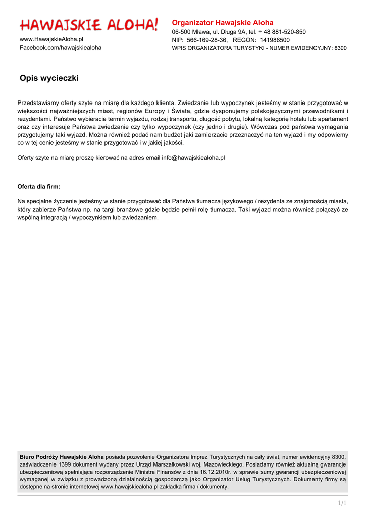 Organizator Hawajskie Aloha www.HawajskieAloha.pl Facebook.com/hawajskiealoha 06-500 Mława, ul. Długa 9A, tel. + 48 881-520-850 NIP: 566-169-28-36, REGON: 141986500 WPIS ORGANIZATORA TURYSTYKI - NUMER EWIDENCYJNY: 8300 Opis wycieczki Przedstawiamy oferty szyte na miarę dla każdego klienta. Zwiedzanie lub wypoczynek jesteśmy w stanie przygotować w większości najważniejszych miast, regionów Europy i Świata, gdzie dysponujemy polskojęzycznymi przewodnikami i rezydentami. Państwo wybieracie termin wyjazdu, rodzaj transportu, długość pobytu, lokalną kategorię hotelu lub apartament oraz czy interesuje Państwa zwiedzanie czy tylko wypoczynek (czy jedno i drugie). Wówczas pod państwa wymagania przygotujemy taki wyjazd. Można również podać nam budżet jaki zamierzacie przeznaczyć na ten wyjazd i my odpowiemy co w tej cenie jesteśmy w stanie przygotować i w jakiej jakości. Oferty szyte na miarę proszę kierować na adres email [email protected] Oferta dla firm: Na specjalne życzenie jesteśmy w stanie przygotować dla Państwa tłumacza językowego / rezydenta ze znajomością miasta, który zabierze Państwa np. na targi branżowe gdzie będzie pełnił rolę tłumacza. Taki wyjazd można również połączyć ze wspólną integracją / wypoczynkiem lub zwiedzaniem. Biuro Podróży Hawajskie Aloha posiada pozwolenie Organizatora Imprez Turystycznych na cały świat, numer ewidencyjny 8300, zaświadczenie 1399 dokument wydany przez Urząd Marszałkowski woj. Mazowieckiego. Posiadamy również aktualną gwarancje ubezpieczeniową spełniająca rozporządzenie Ministra Finansów z dnia 16.12.2010r. w sprawie sumy gwarancji ubezpieczeniowej wymaganej w związku z prowadzoną działalnością gospodarczą jako Organizator Usług Turystycznych. Dokumenty firmy są dostępne na stronie internetowej www.hawajskiealoha.pl zakładka firma / dokumenty. 1/1
