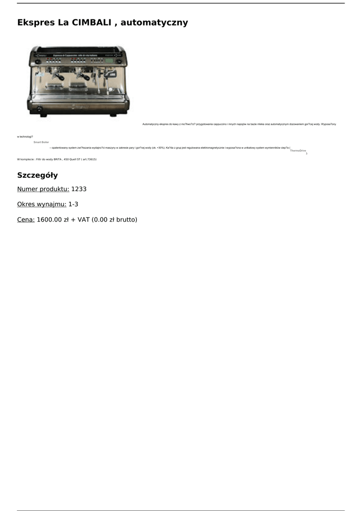 Ekspres La CIMBALI , automatyczny Automatyczny ekspres do kawy z mo?liwo?ci? przygotowania cappuccino i innych napojów na bazie mleka oraz automatycznym dozowaniem gor?cej wody. Wyposa?ony w technologi? Smart Boiler – opatentowany system zwi?kszania wydajno?ci maszyny w zakresie pary i gor?cej wody (ok. +30%). Ka?da z grup jest regulowana elektromagnetycznie i wyposa?ona w unikatowy system wymienników ciep?a ( ThermoDrive ). W komplecie : Filtr do wody BRITA , 450 Quell ST ( art.73615) Szczegóły Numer produktu: 1233 Okres wynajmu: 1-3 Cena: 1600.00 zł + VAT (0.00 zł brutto) Powered by TCPDF (www.tcpdf.org)