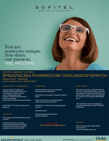 SOFITEL WARSAW VICTORIA SPRZĄTACZKA POWIERZCHNI OGÓLNODOSTĘPNYCH Miejsce pracy: Warszawa Numer referencyjny: S/SWV/0816 UMIEJĘTNOŚCI I OSOBOWOŚĆ: WYMAGANIA: TWOJA MISJA: czujesz się kimś wyjątkowym dzielisz naszą pasję gościnności nie ustajesz w swoim rozwoju masz odwagę pójść dalej czujesz w sobie ducha zdobywcy jesteś innowacyjny szacunek i zaufanie są Twoją podstawą doświadczenie w pracy na podobnym stanowisku (mile widziane), Sprzątaczka będzie odpowiedzialna za pomoc w zapewnieniu higieny, czystości i porządku w przestrzeni publicznej, czyli lobby, restauracjach, barze, korytarzach itp., zgodnie z wymogami i standardami sieci. Jeżeli TAK, to TY jesteś osobą, której szukamy. dokładność, sumienność i zaangażowanie w pracę, dyscyplina w zachowaniu czystości i higieny pracy, dobry stan zdrowia i predyspozycje do wykonywania prac fizycznych, Jeśli spełniasz nasze wymagania, to z radością powitsamy Cię W NASZYM ZESPOLE! dyspozycyjność, OFERUJEMY: aktualna książeczka sanitarnoepidemiologiczna. interesującą, dynamiczną pracę, pełną wyzwań, możliwości rozwoju w ramach funkcjonującego systemu szkoleń i konkursów w ramach sieci hoteli należących do marek ACCOR. NASZE MOTTO: HAPPY GUESTS COME BACKA! KONTAKT: Numer referencyjny: S/SWV/0816 www.orbis.pl www.accorhotels-group.com