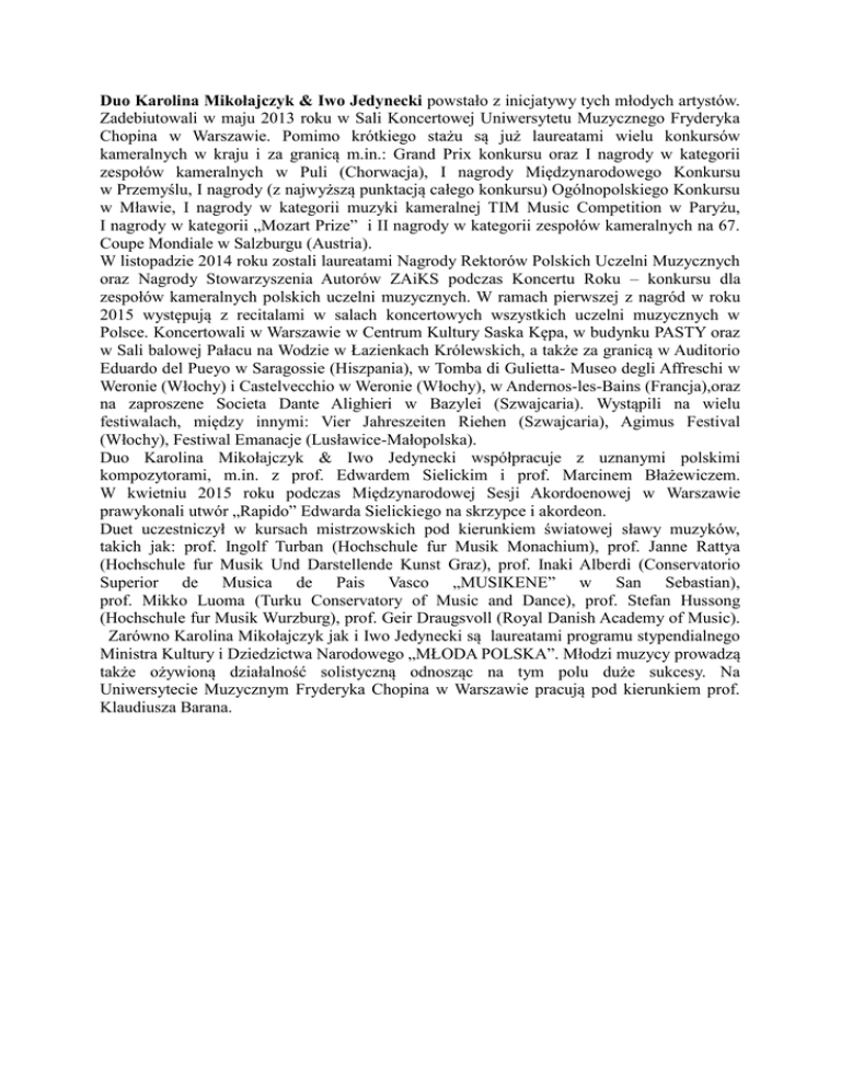 Duo Karolina Mikołajczyk & Iwo Jedynecki powstało z inicjatywy tych młodych artystów. Zadebiutowali w maju 2013 roku w Sali Koncertowej Uniwersytetu Muzycznego Fryderyka Chopina w Warszawie. Pomimo krótkiego stażu są już laureatami wielu konkursów kameralnych w kraju i za granicą m.in.: Grand Prix konkursu oraz I nagrody w kategorii zespołów kameralnych w Puli (Chorwacja), I nagrody Międzynarodowego Konkursu w Przemyślu, I nagrody (z najwyższą punktacją całego konkursu) Ogólnopolskiego Konkursu w Mławie, I nagrody w kategorii muzyki kameralnej TIM Music Competition w Paryżu, I nagrody w kategorii „Mozart Prize” i II nagrody w kategorii zespołów kameralnych na 67. Coupe Mondiale w Salzburgu (Austria). W listopadzie 2014 roku zostali laureatami Nagrody Rektorów Polskich Uczelni Muzycznych oraz Nagrody Stowarzyszenia Autorów ZAiKS podczas Koncertu Roku – konkursu dla zespołów kameralnych polskich uczelni muzycznych. W ramach pierwszej z nagród w roku 2015 występują z recitalami w salach koncertowych wszystkich uczelni muzycznych w Polsce. Koncertowali w Warszawie w Centrum Kultury Saska Kępa, w budynku PASTY oraz w Sali balowej Pałacu na Wodzie w Łazienkach Królewskich, a także za granicą w Auditorio Eduardo del Pueyo w Saragossie (Hiszpania), w Tomba di Gulietta- Museo degli Affreschi w Weronie (Włochy) i Castelvecchio w Weronie (Włochy), w Andernos-les-Bains (Francja),oraz na zaproszene Societa Dante Alighieri w Bazylei (Szwajcaria). Wystąpili na wielu festiwalach, między innymi: Vier Jahreszeiten Riehen (Szwajcaria), Agimus Festival (Włochy), Festiwal Emanacje (Lusławice-Małopolska). Duo Karolina Mikołajczyk & Iwo Jedynecki współpracuje z uznanymi polskimi kompozytorami, m.in. z prof. Edwardem Sielickim i prof. Marcinem Błażewiczem. W kwietniu 2015 roku podczas Międzynarodowej Sesji Akordoenowej w Warszawie prawykonali utwór „Rapido” Edwarda Sielickiego na skrzypce i akordeon. Duet uczestniczył w kursach mistrzowskich pod kierunkiem światowej sławy muzyków, takich jak: prof. Ingolf Turban (Hochschule fur Musik Monachium), prof. Janne Rattya (Hochschule fur Musik Und Darstellende Kunst Graz), prof. Inaki Alberdi (Conservatorio Superior de Musica de Pais Vasco „MUSIKENE” w San Sebastian), prof. Mikko Luoma (Turku Conservatory of Music and Dance), prof. Stefan Hussong (Hochschule fur Musik Wurzburg), prof. Geir Draugsvoll (Royal Danish Academy of Music). Zarówno Karolina Mikołajczyk jak i Iwo Jedynecki są laureatami programu stypendialnego Ministra Kultury i Dziedzictwa Narodowego „MŁODA POLSKA”. Młodzi muzycy prowadzą także ożywioną działalność solistyczną odnosząc na tym polu duże sukcesy. Na Uniwersytecie Muzycznym Fryderyka Chopina w Warszawie pracują pod kierunkiem prof. Klaudiusza Barana.