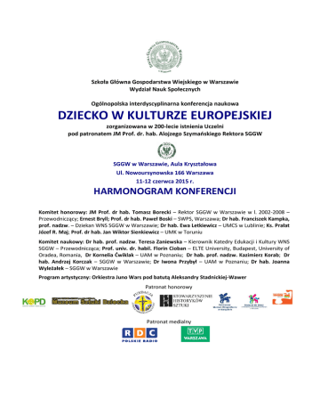 Szkoła Główna Gospodarstwa Wiejskiego w Warszawie Wydział Nauk Społecznych Ogólnopolska interdyscyplinarna konferencja naukowa DZIECKO W KULTURZE EUROPEJSKIEJ zorganizowana w 200-lecie istnienia Uczelni pod patronatem JM Prof. dr. hab. Alojzego Szymańskiego Rektora SGGW SGGW w Warszawie, Aula Kryształowa Ul. Nowoursynowska 166 Warszawa 11-12 czerwca 2015 r. HARMONOGRAM KONFERENCJI Komitet honorowy: JM Prof. dr hab. Tomasz Borecki – Rektor SGGW w Warszawie w l. 2002-2008 – Przewodniczący; Ernest Bryll; Prof. dr hab. Paweł Boski – SWPS, Warszawa; Dr hab. Franciszek Kampka, prof. nadzw. – Dziekan WNS SGGW w Warszawie; Dr hab. Ewa Letkiewicz – UMCS w Lublinie; Ks. Prałat Józef R. Maj; Prof. dr hab. Jan Wiktor Sienkiewicz – UMK w Toruniu Komitet naukowy: Dr hab. prof. nadzw. Teresa Zaniewska – Kierownik Katedry Edukacji i Kultury WNS SGGW – Przewodnicząca; Prof. univ. dr. habil. Florin Cioban – ELTE University, Budapest, University of Oradea, Romania, Dr Kornelia Ćwiklak – UAM w Poznaniu; Dr hab. prof. nadzw. Kazimierz Korab; Dr hab. Andrzej Korczak – SGGW w Warszawie; Dr Iwona Przybył – UAM w Poznaniu; Dr hab. Joanna Wyleżałek – SGGW w Warszawie Program artystyczny: Orkiestra Juno Wars pod batutą Aleksandry Stadnickiej-Wawer Patronat honorowy Patronat medialny CZWARTEK 11 CZERWCA AULA KRYSZTAŁOWA 9.00 Rejestracja uczestników 9.30 INAUGURACJA KONFERENCJI 10.30 Przerwa kawowa 10.40 SESJA I DZIECIŃSTW0 – IDEA, TRADYCJA, RZECZYWISTOŚĆ 11.55 DYSKUSJA PANELOWA 12.30 Przerwa obiadowa 14.00 KONCERT w wykonaniu dziecięcej Orkiestry Mandolinowej Juno Wars pod batutą Aleksandry Stadnickiej-Wawer 15.00 SESJA II KONCEPCJE NATURY DZIECKA. SYMBOLIKA DZIECIŃSTWA 16.40 SESJA III DZIECKO W LITERATURZE. DZIECKO – UCZESTNIK I TWÓRCA KULTURY 19.00 UROCZYSTA KOLACJA PIĄTEK 12 CZERWCA Budynek 8, sala 112 9.00 SESJA IV WYCHOWANIE I EDUKACJA – MIĘDZY TEORIĄ A PRAKTYKĄ 11.00 Przerwa kawowa 11.10 SESJA V DZIECKO XX I XXI WIEKU. DZIECKO „INNE”. DZIECKO WOBEC PATOLOGII 12.40 Przerwa kawowa 12.50 OBRADY W SEKCJACH SEKCJA I. DZIECKO W LITERATURZE I SZTUCE Budynek 8, sala 112 SEKCJA II. DZIECKO XX I XXI WIEKU Budynek 6, sala A43 14.15-14.45 PODSUMOWANIE KONFERENCJI Budynek 8, sala 112. Komitet organizacyjny Dr Katarzyna Bogacka – Przewodnicząca Dr Marta Cywińska Dr Małgorzata Herudzińska Dr Jadwiga Kościanek-Kukacka Mgr Aleksandra Chojnowska – Sekretariat 22 5934722 [email protected]