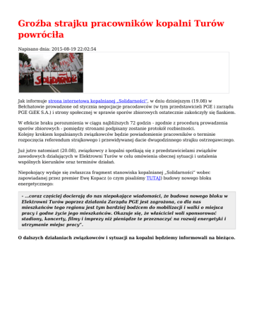 Groźba strajku pracowników kopalni Turów powróciła Napisano dnia: 2015-08-19 22:02:54 Jak informuje strona internetowa kopalnianej „Solidarności”, w dniu dzisiejszym (19.08) w Bełchatowie prowadzone od stycznia negocjacje pracodawców (w tym przedstawicieli PGE i zarządu PGE GiEK S.A.) i strony społecznej w sprawie sporów zbiorowych ostatecznie zakończyły się fiaskiem. W efekcie braku porozumienia w ciągu najbliższych 72 godzin - zgodnie z procedurą prowadzenia sporów zbiorowych - pomiędzy stronami podpisany zostanie protokół rozbieżności. Kolejny krokiem kopalnianych związkowców będzie powiadomienie pracowników o terminie rozpoczęcia referendum strajkowego i przewidywanej dacie dwugodzinnego strajku ostrzegawczego. Już jutro natomiast (20.08), związkowcy z kopalni spotkają się z przedstawicielami związków zawodowych działających w Elektrowni Turów w celu omówienia obecnej sytuacji i ustalenia wspólnych kierunków oraz terminów działań. Niepokojący wydaje się zwłaszcza fragment stanowiska kopalnianej „Solidarności” wobec zapowiadanej przez premier Ewę Kopacz (o czym pisaliśmy TUTAJ) budowy nowego bloku energetycznego: - …coraz częściej docierają do nas niepokojące wiadomości, że budowa nowego bloku w Elektrowni Turów poprzez działania Zarządu PGE jest zagrożona, co dla nas mieszkańców tego regionu jest tym bardziej bodźcem do mobilizacji i walki o miejsca pracy i godne życie jego mieszkańców. Okazuje się, że właściciel woli sponsorować stadiony, koncerty, filmy i imprezy niż pieniądze te przeznaczyć na rozwój energetyki i utrzymanie miejsc pracy”. O dalszych działaniach związkowców i sytuacji na kopalni będziemy informowali na bieżąco.