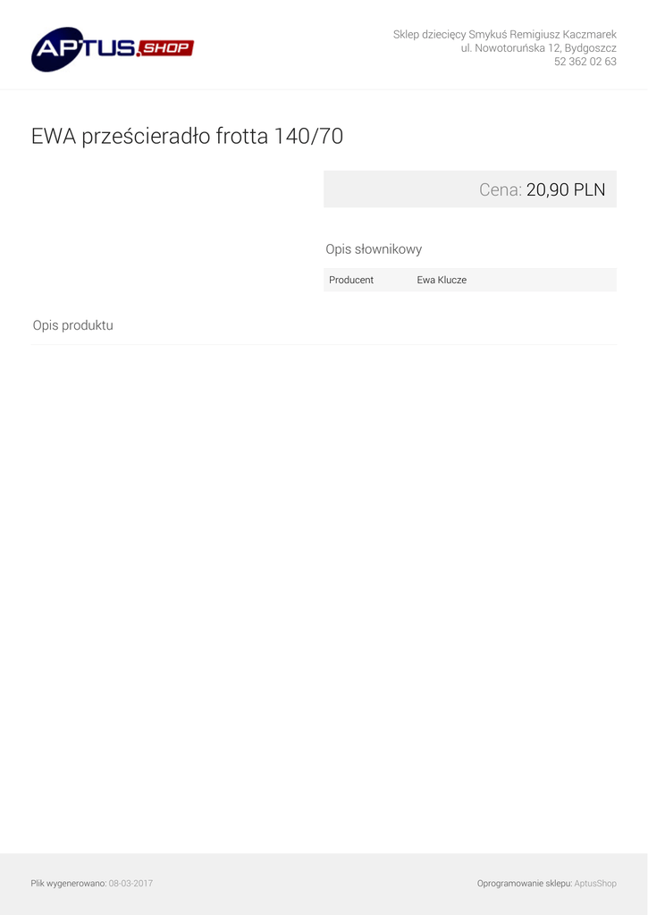 Sklep dziecięcy Smykuś Remigiusz Kaczmarek ul. Nowotoruńska 12, Bydgoszcz 52 362 02 63 EWA prześcieradło frotta 140/70 Cena: 20,90 PLN Opis słownikowy Producent Ewa Klucze Opis produktu Plik wygenerowano: 08-03-2017 Powered by TCPDF (www.tcpdf.org) Oprogramowanie sklepu: AptusShop