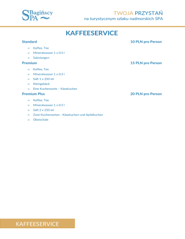 TWOJA PRZYSTAŃ na turystycznym szlaku nadmorskich SPA KAFFEESERVICE Standard • Kaffee, Tee • Mineralwasser 1 x 0.5 l • Salzstangen Premium • Kaffee, Tee • Mineralwasser 1 x 0.5 l • Saft 1 x 250 ml • Kleingebäck • Eine Kuchensorte – Käsekuchen Premium Plus • Kaffee, Tee • Mineralwasser 1 x 0.5 l • Saft 2 x 250 ml • Zwei Kuchensorten - Käsekuchen und Apfelkuchen • Obstschale KAFFEESERVICE 10 PLN pro Person 15 PLN pro Person 20 PLN pro Person