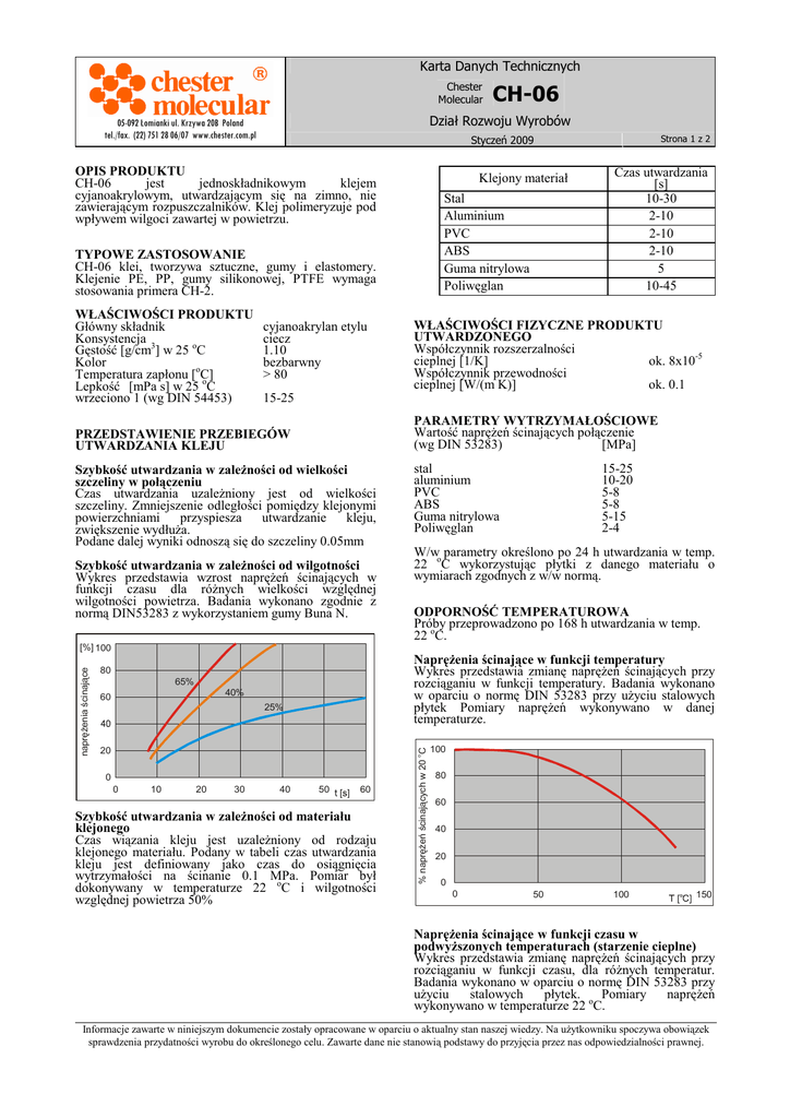 Karta Danych Technicznych Chester Molecular Dział Rozwoju Wyrobów 05-092 Łomianki ul. Krzywa 20B Poland tel./fax. (22) 751 28 06/07 www.chester.com.pl Strona 1 z 2 Styczeń 2009 OPIS PRODUKTU CH-06 jest jednoskładnikowym klejem cyjanoakrylowym, utwardzającym się na zimno, nie zawierającym rozpuszczalników. Klej polimeryzuje pod wpływem wilgoci zawartej w powietrzu. Klejony materiał Stal Aluminium PVC ABS Guma nitrylowa Poliwęglan TYPOWE ZASTOSOWANIE CH-06 klei, tworzywa sztuczne, gumy i elastomery. Klejenie PE, PP, gumy silikonowej, PTFE wymaga stosowania primera CH-2. WŁAŚCIWOŚCI PRODUKTU Główny składnik Konsystencja 3 Gęstość [g/cm ] w 25 oC Kolor Temperatura zapłonu [oC] Lepkość [mPa s] w 25 oC wrzeciono 1 (wg DIN 54453) CH-06 cyjanoakrylan etylu ciecz 1.10 bezbarwny > 80 Czas utwardzania [s] 10-30 2-10 2-10 2-10 5 10-45 WŁAŚCIWOŚCI FIZYCZNE PRODUKTU UTWARDZONEGO Współczynnik rozszerzalności cieplnej [1/K] ok. 8x10-5 Współczynnik przewodności cieplnej [W/(m K)] ok. 0.1 15-25 PARAMETRY WYTRZYMAŁOŚCIOWE Wartość napręŜeń ścinających połączenie (wg DIN 53283) [MPa] PRZEDSTAWIENIE PRZEBIEGÓW UTWARDZANIA KLEJU Szybkość utwardzania w zaleŜności od wielkości szczeliny w połączeniu Czas utwardzania uzaleŜniony jest od wielkości szczeliny. Zmniejszenie odległości pomiędzy klejonymi powierzchniami przyspiesza utwardzanie kleju, zwiększenie wydłuŜa. Podane dalej wyniki odnoszą się do szczeliny 0.05mm Szybkość utwardzania w zaleŜności od wilgotności Wykres przedstawia wzrost napręŜeń ścinających w funkcji czasu dla róŜnych wielkości względnej wilgotności powietrza. Badania wykonano zgodnie z normą DIN53283 z wykorzystaniem gumy Buna N. stal aluminium PVC ABS Guma nitrylowa Poliwęglan 15-25 10-20 5-8 5-8 5-15 2-4 W/w parametry określono po 24 h utwardzania w temp. 22 oC wykorzystując płytki z danego materiału o wymiarach zgodnych z w/w normą. ODPORNOŚĆ TEMPERATUROWA Próby przeprowadzono po 168 h utwardzania w temp. 22 oC. NapręŜenia ścinające w funkcji temperatury Wykres przedstawia zmianę napręŜeń ścinających przy rozciąganiu w funkcji temperatury. Badania wykonano w oparciu o normę DIN 53283 przy uŜyciu stalowych płytek Pomiary napręŜeń wykonywano w danej temperaturze. 80 65% 40% 60 25% 100 o 20 % napręŜeń ścinających w 20 C napręŜenia ścinające [%] 100 0 0 10 20 30 40 50 60 Szybkość utwardzania w zaleŜności od materiału klejonego Czas wiązania kleju jest uzaleŜniony od rodzaju klejonego materiału. Podany w tabeli czas utwardzania kleju jest definiowany jako czas do osiągnięcia wytrzymałości na ścinanie 0.1 MPa. Pomiar był dokonywany w temperaturze 22 oC i wilgotności względnej powietrza 50% 80 60 40 20 0 0 50 100 150 NapręŜenia ścinające w funkcji czasu w podwyŜszonych temperaturach (starzenie cieplne) Wykres przedstawia zmianę napręŜeń ścinających przy rozciąganiu w funkcji czasu, dla róŜnych temperatur. Badania wykonano w oparciu o normę DIN 53283 przy uŜyciu stalowych płytek. Pomiary napręŜeń wykonywano w temperaturze 22 oC. Informacje zawarte w niniejszym dokumencie zostały opracowane w oparciu o aktualny stan naszej wiedzy. Na uŜytkowniku spoczywa obowiązek sprawdzenia przydatności wyrobu do określonego celu. Zawarte dane nie stanowią podstawy do przyjęcia przez nas odpowiedzialności prawnej. Karta Danych Technicznych Chester Molecular Dział Rozwoju Wyrobów 05-092 Łomianki ul. Krzywa 20B Poland tel./fax. (22) 751 28 06/07 www.chester.com.pl Styczeń 2009 Strona 2 z 2 o o % napręŜeń ścinających w 20 C 100 CH-06 80 C 80 60 o 100 C 40 20 0 150 0 1500 2500 6500 ODPORNOŚĆ CHEMICZNA Próby prowadzono po 168h utwardzania w temperaturze 22 ooC. Pomiary napręŜeń wykonywano w temperaturze 22 C. Medium o C % wytrzymałości wstępnej 100h 500h 1000h Benzyna 20 100 100 100 Olej silnikowy 40 100 95 95 Izopropyl 20 100 100 100 Spirytus etylowy 20 100 100 100 Freon Wzgl. wilgotność powietrza 95% 20 100 100 100 40 75 75 70 INFORMACJE POZOSTAŁE Przechowywanie Klej naleŜy przechowywać w oryginalnych opakowaniach, w suchych i chłodnych pomieszczeniach. o Zalecana temperatura składowania to +2 C do +8 oC. Przechowywanie w temperaturach niŜszych lub wyŜszych od podanych moŜe negatywnie wpływać na właściwości kleju. Klej w opakowaniu naleŜy chronić przed wszelkiego rodzaju zanieczyszczeniami. Sposób stosowania Przeznaczone do klejenia elementy powinny być suche, czyste i odtłuszczone. Klej naleŜy aplikować bezpośrednio z opakowania (butelki) wyposaŜonego w końcówkę dozującą, tylko na jedną z klejonych powierzchni i szybko docisnąć sklejane elementy. Przy sklejaniu większych powierzchni naleŜy stosować klejenie punktowe. Jeśli szybkość utwardzania kleju spowodowana kwaśną powierzchnią (pH<7), niską wilgotnością powietrza lub duŜą szczeliną jest nie satysfakcjonująca, naleŜy zastosować aktywator CH-3 firmy Chester Molecular. Przy klejeniu poliolefin i innych trudnych do sklejenia powierzchni, konieczne jest uŜycie primera CH-2. Informacje zawarte w niniejszym dokumencie zostały opracowane w oparciu o aktualny stan naszej wiedzy. Na uŜytkowniku spoczywa obowiązek sprawdzenia przydatności wyrobu do określonego celu. Zawarte dane nie stanowią podstawy do przyjęcia przez nas odpowiedzialności prawnej.