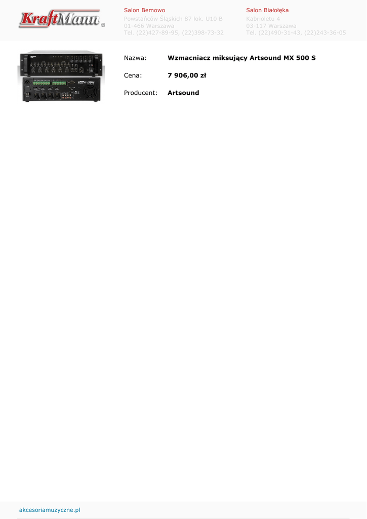 akcesoriamuzyczne.pl Salon Bemowo Salon Białołęka Powstańców Śląskich 87 lok. U10 B 01-466 Warszawa Tel. (22)427-89-95, (22)398-73-32 Kabrioletu 4 03-117 Warszawa Tel. (22)490-31-43, (22)243-36-05 Nazwa: Wzmacniacz miksujący Artsound MX 500 S Cena: 7 906,00 zł Producent: Artsound