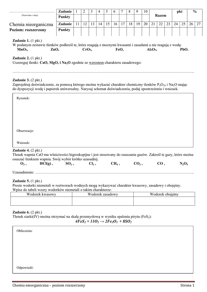 ………………………………… (Nazwisko i imię) Zadanie 1 Punkty 2 3 4 5 6 7 8 9 10 pkt % Razem Chemia nieorganiczna Zadanie 11 12 13 14 15 16 17 18 19 20 21 22 23 24 25 26 27 Poziom: rozszerzony Punkty Zadanie 1. (1 pkt.) W podanym zestawie tlenków podkreśl te, które reagują z mocnymi kwasami i zasadami a nie reagują z wodą: MnO2, ZnO, CrO3, FeO, Al2O3, PbO. Zadanie 2. (1 pkt.) Uszereguj tlenki: CaO, MgO, i Na2O zgodnie ze wzrostem charakteru zasadowego: …………………………………………………………………………………………………………………………….. Zadanie 3. (2 pkt.) Zaprojektuj doświadczenie, za pomocą którego można wykazać charakter chemiczny tlenków P4O10 i Na2O mając do dyspozycji wodę i papierek uniwersalny. Narysuj schemat doświadczenia, podaj spostrzeżenia i wniosek. Rysunek: Obserwacje: Wniosek: Zadanie 4. (2 pkt.) Tlenek wapnia CaO ma właściwości higroskopijne i jest stosowany do osuszania gazów. Zakreśl te gazy, które można osuszać tlenkiem wapnia. Swój wybór krótko uzasadnij. O2 , HCl(g) , SO2 , Cl2 , CH4 , CO2 , CO , N2O5 Uzasadnienie: …………………………………………………………………………………………………………….. Zadanie 5. (1 pkt.) Proste wodorki niemetali w roztworach wodnych mogą wykazywać charakter kwasowy, zasadowy i obojętny. Wpisz do tabeli wzory wodorków niemetali o takim charakterze: Wodorek kwasowy Wodorek zasadowy Wodorek obojętny Zadanie 6. (2 pkt.) Tlenek siarki(IV) można otrzymać na skalę przemysłową w wyniku spalenia pirytu (FeS2): 4FeS2 + 11O2 → 2Fe2O3 + 8SO2 oblicz, jaka objętość tlenku siarki(IV), zmierzona w warunkach normalnych, powstanie w wyniku spalania 30 g pirytu Obliczenia: Odpowiedź: Chemia nieorganiczna – poziom rozszerzony Strona 1 Zadanie 7. (3 pkt.) Podaj dwa wodorotlenki, które mogą tworzyć hydroksosole a następnie zapisz reakcje każdego z nich kwasem siarkowym (VI). ………………………….. …………………………….. reakcja 1: …………………………………………………………………...........…………………….. reakcja 2: …………………………………………………………………………...........…………….. Zadanie 8. (3 pkt.) Uczeń miał otrzymać chlorek miedzi (II) dowolnymi metodami. Zaplanował osiągnąć to metodami: 1) metal + kwas 2) tlenek metalu + kwas 3) tlenek metalu + tlenek niemetalu 4) wodorotlenek metalu + kwas 5) sól + sól Którymi z w/w metod udało mu się otrzymać tę sól? Zapisz te reakcje. .............................................................................................................................................................................................. .............................................................................................................................................................................................. .............................................................................................................................................................................................. Zadanie 9. (2 pkt.) Na szalkach wagi zrównoważono dwie odkryte zlewki z roztworami: NaOH i NaCl. Po pewnym czasie jedna z szalek obniżyła się. Wyjaśnij, która i dlaczego. Wyjaśnienie potwierdź odpowiednią reakcją chemiczną. .............................................................................................................................................................................................. .............................................................................................................................................................................................. Zadanie 10. (3 pkt.) Wykaż za pomocą odpowiedniego doświadczenia amfoteryczny charakter wodorotlenku glinu. Narysuj schematyczny rysunek doświadczenia, spostrzeżenia i zachodzące reakcje (dla reakcji z zasadą zapisz tylko jedną, dowolną formę). Równania reakcji: Rysunek: Obserwacje: Wniosek: Zadanie 11. (3 pkt.) Płytki aluminiowe umieszczono do pięciu zlewek napełnionych roztworami: AgNO3 CuSO4 Al Al Kwas solny Al NaOH Al NaCl Al Zapisz te reakcje, które zaszły. ............................................................................................................................................................................................ ............................................................................................................................................................................................ ............................................................................................................................................................................................ . .......................................................................................................................................................................................... Chemia nieorganiczna – poziom rozszerzony Strona 2 Zadanie 12. (3 pkt.) Mając do dyspozycji wyłącznie: H2SO4 , K, CuO i H2O otrzymaj, pisząc wszystkie odpowiednie reakcje Cu(OH)2. Zadanie 13. (1 pkt.) Czterech uczniów miało za zadanie przygotować 200 g 10% roztworu glukozy, mając do dyspozycji: glukozę, wodę destylowaną, wagę laboratoryjną techniczną z kompletem odważników; cylinder miarowy; szkiełko zegarkowe i zlewkę ( gęstość wody d = 1 g/cm3) Polecenie wykonali następująco: Uczeń I II III IV Kolejne czynności wykonane przez uczniów Odważył glukozę na szkiełku zegarkowym, odważkę wsypał do cylindra miarowego, wlewał wodę destylowaną aż objętość roztwory osiągnęła 200 cm3 i wymieszał. Odważył glukozę na szkiełku zegarkowym, odważkę wsypał do zlewki, dodał 200 g wody destylowanej i wymieszał Obliczył potrzebną masę glukozy i masę wody; odważył obliczoną masę gl