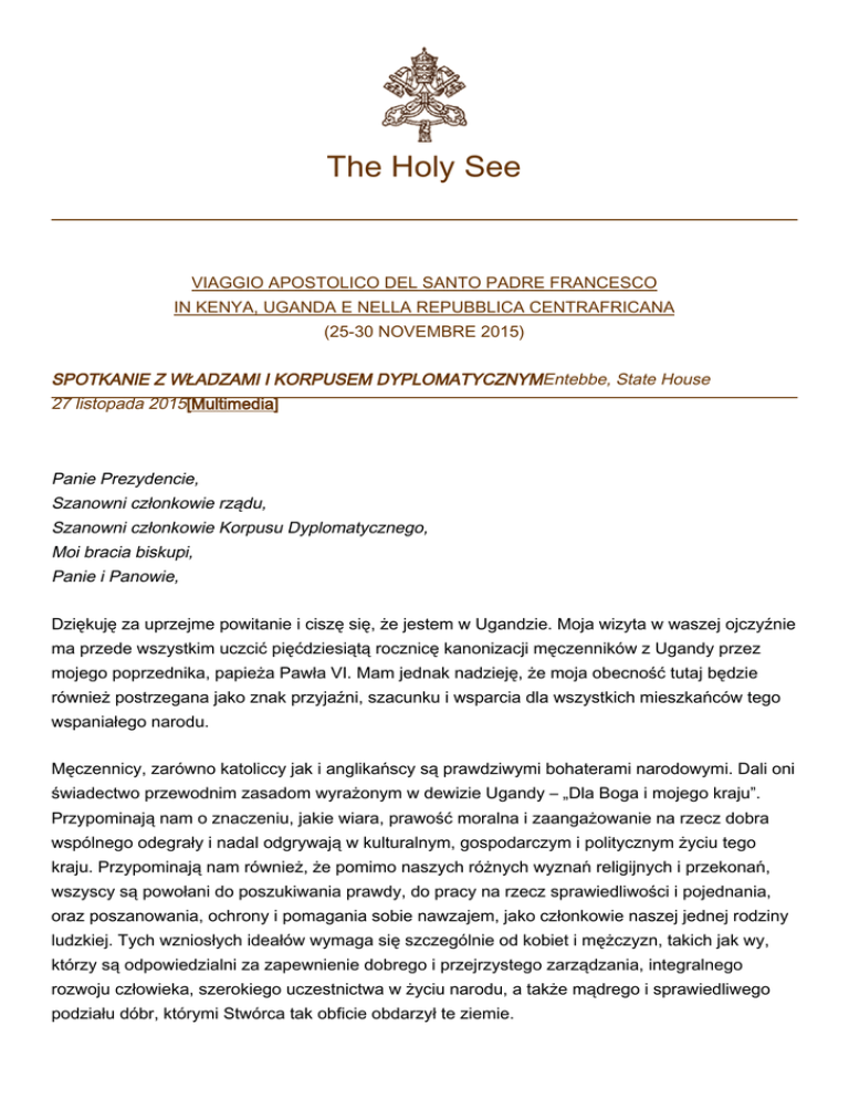 The Holy See VIAGGIO APOSTOLICO DEL SANTO PADRE FRANCESCO IN KENYA, UGANDA E NELLA REPUBBLICA CENTRAFRICANA (25-30 NOVEMBRE 2015) SPOTKANIE Z WŁADZAMI I KORPUSEM DYPLOMATYCZNYMEntebbe, State House 27 listopada 2015[Multimedia] Panie Prezydencie, Szanowni członkowie rządu, Szanowni członkowie Korpusu Dyplomatycznego, Moi bracia biskupi, Panie i Panowie, Dziękuję za uprzejme powitanie i ciszę się, że jestem w Ugandzie. Moja wizyta w waszej ojczyźnie ma przede wszystkim uczcić pięćdziesiątą rocznicę kanonizacji męczenników z Ugandy przez mojego poprzednika, papieża Pawła VI. Mam jednak nadzieję, że moja obecność tutaj będzie również postrzegana jako znak przyjaźni, szacunku i wsparcia dla wszystkich mieszkańców tego wspaniałego narodu. Męczennicy, zarówno katoliccy jak i anglikańscy są prawdziwymi bohaterami narodowymi. Dali oni świadectwo przewodnim zasadom wyrażonym w dewizie Ugandy – „Dla Boga i mojego kraju”. Przypominają nam o znaczeniu, jakie wiara, prawość moralna i zaangażowanie na rzecz dobra wspólnego odegrały i nadal odgrywają w kulturalnym, gospodarczym i politycznym życiu tego kraju. Przypominają nam również, że pomimo naszych różnych wyznań religijnych i przekonań, wszyscy są powołani do poszukiwania prawdy, do pracy na rzecz sprawiedliwości i pojednania, oraz poszanowania, ochrony i pomagania sobie nawzajem, jako członkowie naszej jednej rodziny ludzkiej. Tych wzniosłych ideałów wymaga się szczególnie od kobiet i mężczyzn, takich jak wy, którzy są odpowiedzialni za zapewnienie dobrego i przejrzystego zarządzania, integralnego rozwoju człowieka, szerokiego uczestnictwa w życiu narodu, a także mądrego i sprawiedliwego podziału dóbr, którymi Stwórca tak obficie obdarzył te ziemie. 2 Moja wizyta ma także na celu zwrócenie uwagi na Afrykę jako całość, na związane z nią obietnice, nadzieje, jej zmagania i jej osiągnięcia. Świat patrzy na Afrykę, jako na kontynent nadziei. Uganda rzeczywiście została obdarzona przez Boga obfitymi zasobami naturalnymi, a wyzwaniem stojącym przed wami jest administrowanie nimi jako odpowiedzialni rządcy. Ale przede wszystkim, naród został pobłogosławiony swym ludem: silnymi rodzinami, swą młodzieżą i osobami starszymi. Z góry cieszę się na jutrzejsze spotkanie z młodzieżą, do której skieruję słowa zachęty i wyzwania. Jakże to ważne, aby ludzie młodzi otrzymali nadzieję, szanse kształcenia i pracy zarobkowej, a przede wszystkim szansę pełnego uczestnictwa w życiu społecznym. Ale pragnę również wspomnieć o błogosławieństwie jakim są dla was osoby w podeszłym wieku. Są one żywą pamięcią każdego narodu. Ich mądrość i doświadczenie zawsze powinny być doceniane jako kompas, który może umożliwić społeczeństwu odnalezienie właściwego kierunku, stawiając czoło uczciwie, mądrze i z wizją wyzwaniom współczesności. Tu, w Afryce Wschodniej, Uganda okazała wyjątkową troskę o przyjmowanie uchodźców, umożliwiając im odbudowanie swojego życia w bezpieczeństwie i poczuciu godności, pochodzącym z zarabiania na życie dzięki uczciwej pracy. Nasz świat, uwikłany w wojny, przemoc i różne formy niesprawiedliwości jest świadkiem bezprecedensowego przepływu ludów. Sposób w jaki je traktujemy jest sprawdzianem naszego człowieczeństwa, naszego poszanowania godności osoby ludzkiej, a przede wszystkim solidarności z naszymi potrzebującymi braćmi i siostrami. Mimo, że moja wizyta jest krótka, mam nadzieję, że będzie ona wsparciem dla wielu cichych wysiłków podejmowanych, by zatroszczyć się o ubogich, chorych i przeżywających wszelkiego rodzaju trudności. To właśnie w tych małych znakach widzimy prawdziwą duszę narodu. Nasz świat na wiele sposobów staje się coraz bliższy. Jednocześnie widzimy z niepokojem globalizację „kultury odrzucenia”, która sprawia, że jesteśmy ślepi na wartości duchowe, nasze serca ulegają znieczuleniu na potrzeby ubogich a młodzi są ograbiani z nadziei. Z góry ciesząc się na spotkanie z wami i przeżywanie tego czasu z wami, modlę się, abyście wy i cały ukochany naród ugandyjski zawsze okazywali się godni wartości, jakie ukształtowały duszę waszego narodu. Modlę się o obfite Boże błogosławieństwo dla was wszystkich. Mungu awabariki! (Niech Bóg was błogosławi!) © Copyright - Libreria Editrice Vaticana