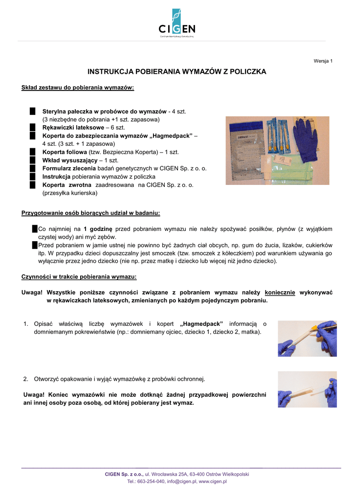 Wersja 1 INSTRUKCJA POBIERANIA WYMAZÓW Z POLICZKA Skład zestawu do pobierania wymazów: Sterylna pałeczka w probówce do wymazów - 4 szt. (3 niezbędne do pobrania +1 szt. zapasowa) Rękawiczki lateksowe – 6 szt. Koperta do zabezpieczania wymazów „Hagmedpack” – 4 szt. (3 szt. + 1 zapasowa) Koperta foliowa (tzw. Bezpieczna Koperta) – 1 szt. Wkład wysuszający – 1 szt. Formularz zlecenia badań genetycznych w CIGEN Sp. z o. o. Instrukcja pobierania wymazów z policzka Koperta zwrotna zaadresowana na CIGEN Sp. z o. o. (przesyłka kurierska) Przygotowanie osób biorących udział w badaniu: Co najmniej na 1 godzinę przed pobraniem wymazu nie należy spożywać posiłków, płynów (z wyjątkiem czystej wody) ani myć zębów. Przed pobraniem w jamie ustnej nie powinno być żadnych ciał obcych, np. gum do żucia, lizaków, cukierków itp. W przypadku dzieci dopuszczalny jest smoczek (tzw. smoczek z kółeczkiem) pod warunkiem używania go wyłącznie przez jedno dziecko (nie np. przez matkę i dziecko lub więcej niż jedno dziecko). Czynności w trakcie pobierania wymazu: Uwaga! Wszystkie poniższe czynności związane z pobraniem wymazu należy koniecznie wykonywać w rękawiczkach lateksowych, zmienianych po każdym pojedynczym pobraniu. 1. Opisać właściwą liczbę wymazówek i kopert „Hagmedpack” informacją o domniemanym pokrewieństwie (np.: domniemany ojciec, dziecko 1, dziecko 2, matka). 2. Otworzyć opakowanie i wyjąć wymazówkę z probówki ochronnej. Uwaga! Koniec wymazówki nie może dotknąć żadnej przypadkowej powierzchni ani innej osoby poza osobą, od której pobierany jest wymaz. ________________________________ ________________________________ _______________________ CIGEN Sp. z o.o., ul. Wrocławska 25A, 63-400 Ostrów Wielkopolski Tel.: 663-254-040, [email protected], www.cigen.pl 3. Wymaz pobrać poprzez płynne pocieranie końcem wymazówki wewnętrznej strony obu policzków. Dokonać pobrania wymazu kolejno od wszystkich osób uczestniczących w badaniu. 4. Po pobraniu wymazu należy niezwłocznie umieścić wymazówkę w opisanej probówce ochronnej 5. Zabezpieczoną wymazówkę „Hagmedpack”. 6. Umieścić wszystkie kopertki „Hagmedpack” z pobranymi uprzednio wymazami w opisanej wcześniej zbiorczej Kopercie Bezpiecznej. 7. Umieścić w kopercie bezpiecznej wkład wysuszający 8. Opisać Kopertę Bezpieczną czytelnie wypełniając poszczególne pola (nadawca, odbiorca, data nadania i podpis nadawcy), a następnie oderwać jeden odcinek kontrolny koperty i zachować go. 9. Opisaną Kopertę Bezpieczną, zawierającą odpowiednio zabezpieczone i opisane wymazówki oraz wypełniony i podpisany przez zleceniodawcę „Formularz zlecenia badań genetycznych” (opatrzony podpisem osoby zlecającej badanie) należy umieścić w zaadresowanej zwrotnie kopercie zbiorczej. należy następnie umieścić w opisanej kopercie Dopuszcza się przechowywanie pobranego w ten sposób materiału w temperaturze pokojowej do 48 godzin przed wysłaniem. Uwaga! Podpis osoby zlecającej (pacjenta) jest niezbędny do przyjęcia zlecenia na wykonanie badań. ________________________________ ________________________________ _______________________ CIGEN Sp. z o.o., ul. Wrocławska 25A, 63-400 Ostrów Wielkopolski Tel.: 663-254-040, [email protected], www.cigen.pl