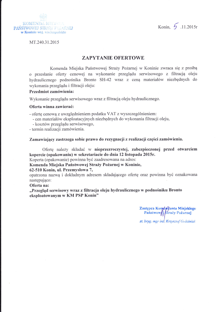 "'r: ;:,3l;'rlł$i"ntti,,';1i.: ;li!','1,' w Konimie \ątri, r. ;r_,1}:ijir :' - Konin, ; il,:]:i]l:] f .rr.zor5r MT.240.31.2015 ZAPYTANIE OFERTOWE Komenda Miejska Państwowej Straży PoŻarnej w Koninie zwTaca się z prośbą o przesłanie oferty cenowej na wykonanie przeglądu serwisowego z filtracją oleju hydraulicznego podnośnika Bronto SH-42 wtaz Z ceną materiałów niezbędnych do wykonania przeglądu i filtracji oleju: Przedmiot zamówienia: Wykonanie przeg!ądu serwisowego wraz z fitracją oleju hydraulicznego' Oferta winna zawieraćz - oferlę cenową z uwzględnieniem podatku Y AT z Wszczęgolnienięm: - cen materiałow eksploatacyjnych niezbędnych do wykonania filtracji oleju, - kosztów przeglądu serwisowego, - termin realizacji zamówienia. Zamawiający zastrzega sobie prawo do rezygnacjizrea|izacji częścizamówienia. ofertę naleŻy składać \V nieprzezroczystej, zabezpieczonej przed otwarciem kopercie (opakowaniu) w sekretariacie do dnia 12 listopada 2015r. Koperta (opakowanie) powinnabyc zaadresowana na adres: Komenda Miejska Państwowej StraĘ Pożarnej w Koninie, 62-510 Konin, ul. Przemysłowa 7, opatrzona nazwą i dokładnym adresem składającego ofer1ę oraz powinna być, oznakowana następująco: Oferta na: ,,Przegląd serwisorvy wraz z filtracja oleju hydraulicznego w podnośniku Bronto eksploatowanym w KM PSP Konin" Zastępca Kłl16ć7$anta lVt icj sklegn Panstwowfi iraźv Poźarncj f st. bryg. mgr I in:żI Kny.łzułJ'Gl,ścinial