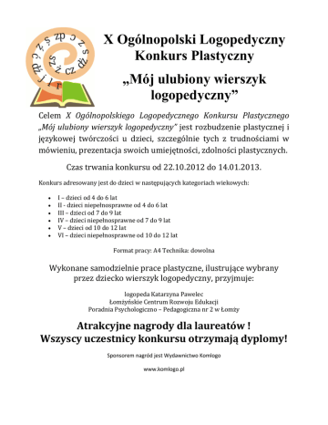 X Ogólnopolski Logopedyczny Konkurs Plastyczny „Mój ulubiony wierszyk logopedyczny” Celem X Ogólnopolskiego Logopedycznego Konkursu Plastycznego „Mój ulubiony wierszyk logopedyczny” jest rozbudzenie plastycznej i językowej twórczości u dzieci, szczególnie tych z trudnościami w mówieniu, prezentacja swoich umiejętności, zdolności plastycznych. Czas trwania konkursu od 22.10.2012 do 14.01.2013. Konkurs adresowany jest do dzieci w następujących kategoriach wiekowych: I – dzieci od 4 do 6 lat II - dzieci niepełnosprawne od 4 do 6 lat III – dzieci od 7 do 9 lat IV – dzieci niepełnosprawne od 7 do 9 lat V – dzieci od 10 do 12 lat VI – dzieci niepełnosprawne od 10 do 12 lat Format pracy: A4 Technika: dowolna Wykonane samodzielnie prace plastyczne, ilustrujące wybrany przez dziecko wierszyk logopedyczny, przyjmuje: logopeda Katarzyna Pawelec Łomżyńskie Centrum Rozwoju Edukacji Poradnia Psychologiczno – Pedagogiczna nr 2 w Łomży Atrakcyjne nagrody dla laureatów ! Wszyscy uczestnicy konkursu otrzymają dyplomy! Sponsorem nagród jest Wydawnictwo Komlogo www.komlogo.pl