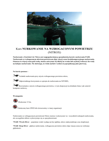 Kurs NURKOWANIE NA WZBOGACONYM POWIETRZU (NITROX) Nurkowanie z Enriched Air Nitrox jest najpopularniejszą specjalnością kursów nurkowania PADI. Nurkowanie ze wzbogaconym nitroxem powietrzem daje więcej czasu bezdekompresyjnego nurkowania. Oznacza to więcej czasu pod wodą, można zatrzymać się dłużej na wraku lub szybciej wskoczyć do wody na kolejne nurkowanie. Nic dziwnego, że wielu nurków wybiera tą specjalizację jako pierwszą. Na kursie poznasz : Techniki nurkowania przy użyciu wzbogaconego powietrza nitrox, Odpowiedniego korzystania ze sprzętu do nurkowania na NITORX, Rozważania o użyciu wzbogaconego powietrza, w tym ekspozycji na działanie tlenu i jak ustawić komputer nurkowy. Wymagania: Ukończone 12 lat, Ukończony kurs OWD lub równoważny w innej organizacji. Nurkowanie ze wzbogaconym powietrzem Nitrox możesz wykorzystać we wszystkich rodzajach nurkowania, ale szczególnie dobrze wykorzystuje się ze specjalnościami: *PADI Wreck Diver – popularne wraki wydają się być głębiej, nitrox maksymalizuje czas eksploracji. *PADI Deep Diver - głębsze nurkowania, wzbogacone powietrze nitrox daje więcej czasu na wybranej głębokości.