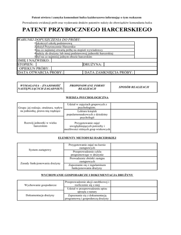 Patent otwiera i zamyka komendant hufca każdorazowo informując o tym rozkazem Prowadzenie ewidencji prób oraz wydawanie druków patentów należy do obowiązków komendanta hufca PATENT PRZYBOCZNEGO HARCERSKIEGO WARUNKI DOPUSZCZENIA DO PRÓBY: 1 ukończył szkołę podstawową 2 złożył Przyrzeczenie Harcerskie 3 ma co najmniej otwartą próbę na stopień wywiadowcy 4 należy do drużyny lub innej podstawowej jednostki harcerskiej 5 był na co najmniej jednym obozie harcerskim IMIĘ I NAZWISKO: STOPIEŃ: OPIEKUN PRÓBY: DATA OTWARCIA PRÓBY: WYMAGANIA – ZNAJOMOŚĆ NASTĘPUJĄCYCH ZAGADNIEŃ: DRUŻYNA: DATA ZAMKNIĘCIA PRÓBY: PROPONOWANE FORMY REALIZACJI SPOSÓB REALIZACJI WIEDZA PSYCHOLOGICZNA Grupa: jej rodzaje, struktura, wpływ na jednostkę, prawa nią rządzące Rozwój jednostki w wieku harcerskim Udział w zajęciach grupowych z psychologiem. Lektura książek popularnonaukowych z dziedziny psychologii Przygotowanie zajęć uwzględniających potrzeby i możliwości różnych grup wiekowych ELEMENTY METODYKI HARCERSKIEJ System zastępowy Zasady funkcjonowania drużyny Przygotowanie zajęć na kursie zastępowych Przeprowadzenie cyklu programowego w drużynie Prowadzenie zbiórki zastępu zastępowych Zapoznanie się z regulaminem funkcjonowania drużyny WYCHOWANIE GOSPODARCZE I DOKUMENTACJA DRUŻYNY Wychowanie gospodarcze Dokumentacja drużyny Przeprowadzenie akcji zarobkowej i rozliczenie się z niej Udział w przeprowadzeniu spisu sprzętu z natury Zapoznanie się z dokumentacją programową i gospodarczą drużyny ETYKA INSTRUKTORSKA, PRAWA I OBOWIĄZKI INSTRUKTORA Etyka instruktorska, prawa obowiązki instruktora Zapoznanie się z obowiązkami i prawami przybocznego Udział w Radzie Hufca BODŹCE SAMOWYCHOWAWCZE Prawo i Przyrzeczenie Harcerskie System stopni i sprawności Struktura SH Przeprowadzenie zadania na temat Prawa i Przyrzeczenia w drużynie Opieka nad stopniem młodszego harcerza Przygotowanie i przeprowadzenie zajęć na temat drużyny z zuchami trzeciej gwiazdki Zapoznanie się z komentarzem metodycznym do zdobywania stopni i sprawności RYWALIZACJA I WSPÓŁZAWODNICTWO Rywalizacja i współzawodnictwo Prowadzenie współzawodnictwa śródrocznego lub obozowego Przeprowadzenie gier porównawczych (jednej z silnym akcentem współzawodnictwa, drugiej bez) PLANOWANIE PRACY Zaplanowanie jednego cyklu pracy drużyny Dobranie form pracy do celów i tematu cyklu określonych w planie pracy drużyny Formy pracy i cele ich stosowania Przygotowanie zbiórki drużyny lub zastępu zastępowych; samoocena pod kątem zasad dobrej zbiórki Zasady dobrej zbiórki Przygotowanie od strony organizacyjnej biwaku lub rajdu Przed zbiórką wyjazdową zapoznanie Zasady bezpieczeństwa na imprezach jej uczestników z zasadami harcerskich bezpieczeństwa Planowanie pracy UMIEJĘTNOŚCI ORGANIZACYJNE Prowadzenie musztry dużego i małego zespołu Organizacja służby instruktorskiej Zasady utrzymania czystości porządku Pełnienie funkcji oboźnego na obozie Kontrola przestrzegania regulaminu mundurowego w drużynie Zaplanowanie i pokierowanie rozstawieniem namiotu