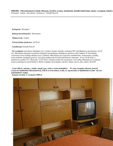 PRIORI - Nieruchomości Lubań, Olszyna, Gryfów, Leśna, miezkania, działki budowlane, domy, wynajem, lokale u Wynajem - Lubań - mieszkanie 3 pokojowe - Osiedle Piast II Kategoria: Wynajem Rodzaj nieruchomości: Mieszkanie Miejscowość: Lubań Powierzchnia użytkowa: 62,50 m2 Lokalizacja: Osiedle Piast II Do wynajęcia mieszkanie składające się z 3 pokoi, kuchni, łazienki, osobnego WC, przedpokoju o łącznej pow. 62,50 m2. Mieszkanie położone na parterze budynku mieszkalnego. Dodatkowo piwnica i duży balkon. W mieszkaniu wstawiono nową stolarkę okienną wraz z roletami. Mieszkanie jest częściowo umeblowane, wyposażone w pralkę, nową lodówkę, kuchenkę gazową. Jest także podłączenie do telewizji Komsat i internetu - koszt: 24,40 zł/m-c i podstawowy pakiet TV z Komsatu: 13,50 zł/m-c. Istnieje możliwość rezygnacji z tych usług. Budynek jest ocieplony, miejsca parkingowe przed blokiem. Blisko znajduje się kompleks szkolny, sklepy, poczta, plac zabaw, Kościół. Cena: 850 zł / miesiąc + media (prąd i gaz, woda w razie niedopłaty). W cenę wynajmu wliczony jest już czynsz do Spółdzielni Mieszkaniowej: 530 zł (wywóz śmieci, woda, co. ogrzewanie ze Spółdzielni ryczałt - nie ma podzielników ciepła). Kaucja zwrotna w wysokości 1000 zł. strona 1 / 5 PRIORI - Nieruchomości Lubań, Olszyna, Gryfów, Leśna, miezkania, działki budowlane, domy, wynajem, lokale u Wynajem - Lubań - mieszkanie 3 pokojowe - Osiedle Piast II strona 2 / 5 PRIORI - Nieruchomości Lubań, Olszyna, Gryfów, Leśna, miezkania, działki budowlane, domy, wynajem, lokale u Wynajem - Lubań - mieszkanie 3 pokojowe - Osiedle Piast II strona 3 / 5 PRIORI - Nieruchomości Lubań, Olszyna, Gryfów, Leśna, miezkania, działki budowlane, domy, wynajem, lokale u Wynajem - Lubań - mieszkanie 3 pokojowe - Osiedle Piast II strona 4 / 5 PRIORI - Nieruchomości Lubań, Olszyna, Gryfów, Leśna, miezkania, działki budowlane, domy, wynajem, lokale u Wynajem - Lubań - mieszkanie 3 pokojowe - Osiedle Piast II strona 5 / 5