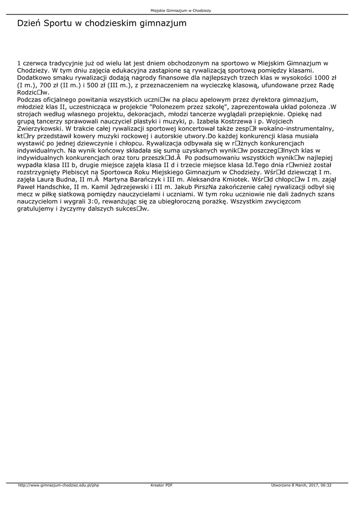 Miejskie Gimnazjum w Chodzieży Dzień Sportu w chodzieskim gimnazjum 1 czerwca tradycyjnie już od wielu lat jest dniem obchodzonym na sportowo w Miejskim Gimnazjum w Chodzieży. W tym dniu zajęcia edukacyjna zastąpione są rywalizacją sportową pomiędzy klasami. Dodatkowo smaku rywalizacji dodają nagrody finansowe dla najlepszych trzech klas w wysokości 1000 zł (I m.), 700 zł (II m.) i 500 zł (III m.), z przeznaczeniem na wycieczkę klasową, ufundowane przez Radę RodzicÃłw. Podczas oficjalnego powitania wszystkich uczniÃłw na placu apelowym przez dyrektora gimnazjum, młodzież klas II, uczestnicząca w projekcie "Polonezem przez szkołę", zaprezentowała układ poloneza .W strojach według własnego projektu, dekoracjach, młodzi tancerze wyglądali przepięknie. Opiekę nad grupą tancerzy sprawowali nauczyciel plastyki i muzyki, p. Izabela Kostrzewa i p. Wojciech Zwierzykowski. W trakcie całej rywalizacji sportowej koncertował także zespÃłł wokalno-instrumentalny, ktÃłry przedstawił kowery muzyki rockowej i autorskie utwory.Do każdej konkurencji klasa musiała wystawić po jednej dziewczynie i chłopcu. Rywalizacja odbywała się w rÃłżnych konkurencjach indywidualnych. Na wynik końcowy składała się suma uzyskanych wynikÃłw poszczegÃłlnych klas w indywidualnych konkurencjach oraz toru przeszkÃłd. Po podsumowaniu wszystkich wynikÃłw najlepiej wypadła klasa III b, drugie miejsce zajęła klasa II d i trzecie miejsce klasa Id.Tego dnia rÃłwnież został rozstrzygnięty Plebiscyt na Sportowca Roku Miejskiego Gimnazjum w Chodzieży. WśrÃłd dziewcząt I m. zajęła Laura Budna, II m. Martyna Barańczyk i III m. Aleksandra Kmiotek. WśrÃłd chłopcÃłw I m. zajął Paweł Handschke, II m. Kamil Jędrzejewski i III m. Jakub PirszNa zakończenie całej rywalizacji odbył się mecz w piłkę siatkową pomiędzy nauczycielami i uczniami. W tym roku uczniowie nie dali żadnych szans nauczycielom i wygrali 3:0, rewanżując się za ubiegłoroczną porażkę. Wszystkim zwycięzcom gratulujemy i życzymy dalszych sukcesÃłw. http://www.gimnazjum-chodziez.edu.pl/php Kreator PDF Utworzono 8 March, 2017, 06:32