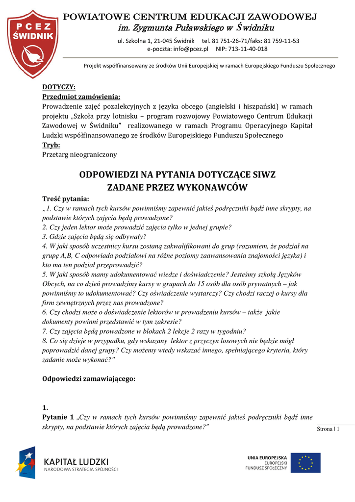 POWIATOWE POWIATOWE CENTRUM EDUKACJI ZAWODOWEJ im. Zygmunta Puławskiego w Świdniku ul. Szkolna 1, 21-045 Świdnik tel. 81 751-26-71/faks: 81 759-11-53 e-poczta: [email protected] NIP: 713-11-40-018 Projekt współfinansowany ze środków Unii Europejskiej w ramach Europejskiego Funduszu Społecznego DOTYCZY: Przedmiot zamówienia: Prowadzenie zajęć pozalekcyjnych z języka obcego (angielski i hiszpański) w ramach projektu „Szkoła przy lotnisku – program rozwojowy Powiatowego Centrum Edukacji Zawodowej w Świdniku” realizowanego w ramach Programu Operacyjnego Kapitał Ludzki współfinansowanego ze środków Europejskiego Funduszu Społecznego Tryb: Przetarg nieograniczony ODPOWIEDZI NA PYTANIA DOTYCZĄCE SIWZ ZADANE PRZEZ WYKONAWCÓW Treść pytania: „1. Czy w ramach tych kursów powinniśmy zapewnić jakieś podręczniki bądź inne skrypty, na podstawie których zajęcia będą prowadzone? 2. Czy jeden lektor może prowadzić zajęcia tylko w jednej grupie? 3. Gdzie zajęcia będą się odbywały? 4. W jaki sposób uczestnicy kursu zostaną zakwalifikowani do grup (rozumiem, że podział na grupę A,B, C odpowiada podziałowi na różne poziomy zaawansowania znajomości języka) i kto ma ten podział przeprowadzić? 5. W jaki sposób mamy udokumentować wiedze i doświadczenie? Jesteśmy szkołą Języków Obcych, na co dzień prowadzimy kursy w grupach do 15 osób dla osób prywatnych – jak powinniśmy to udokumentować? Czy oświadczenie wystarczy? Czy chodzi raczej o kursy dla firm zewnętrznych przez nas prowadzone? 6. Czy chodzi może o doświadczenie lektorów w prowadzeniu kursów – także jakie dokumenty powinni przedstawić w tym zakresie? 7. Czy zajęcia będą prowadzone w blokach 2 lekcje 2 razy w tygodniu? 8. Co się dzieje w przypadku, gdy wskazany lektor z przyczyn losowych nie będzie mógł poprowadzić danej grupy? Czy możemy wtedy wskazać innego, spełniającego kryteria, który zadanie może wykonać?” Odpowiedzi zamawiającego: 1. Pytanie 1 „Czy w ramach tych kursów powinniśmy zapewnić jakieś podręczniki bądź inne skrypty, na podstawie których zajęcia będą prowadzone?” Strona | 1 POWIATOWE POWIATOWE CENTRUM EDUKACJI ZAWODOWEJ im. Zygmunta Puławskiego w Świdniku ul. Szkolna 1, 21-045 Świdnik tel. 81 751-26-71/faks: 81 759-11-53 e-poczta: [email protected] NIP: 713-11-40-018 Projekt współfinansowany ze środków Unii Europejskiej w ramach Europejskiego Funduszu Społecznego Odpowiedź: Nie ma takiego obowiązku. Zamawiający zapewnia słuchaczom podręczniki. 2. Pytanie 2 „Czy jeden lektor może prowadzić zajęcia tylko w jednej grupie?” Odpowiedź: Tak, jeden lektor może prowadzić zajęcia tylko w jednej grupie (zgodnie z pkt. 5 b SIWZ) 3. Pytanie 3 „Gdzie zajęcia będą się odbywały?” Odpowiedź: Zajęcia realizowane będą w Świdniku, przy ul. Szkolnej 1, w budynku Powiatowego Centrum Edukacji Zawodowej im. Z. Puławskiego w Świdniku (zgodnie z par. 2 pkt. 17 wzoru umowy, który stanowi załącznik nr 6 do SIWZ). 4. Pytanie 4 „W jaki sposób uczestnicy kursu zostaną zakwalifikowani do grup (rozumiem, że podział na grupę A, B, C odpowiada podziałowi na różne poziomy zaawansowania znajomości języka) i kto ma ten podział przeprowadzić?” Odpowiedź: Uczestnicy zostaną przydzieleni do grup na podstawie poziomu zaawansowania znajomości języka. Podziału na grupy dokona Zamawiający. 5. Pytanie 5 „W jaki sposób mamy udokumentować wiedze i doświadczenie? Jesteśmy szkołą Języków Obcych, na co dzień prowadzimy kursy w grupach do 15 osób dla osób prywatnych – jak powinniśmy to udokumentować? Czy oświadczenie wystarczy? Czy chodzi raczej o kursy dla firm zewnętrznych przez nas prowadzone?” Odpowiedź: Zgodnie z pkt. 7 b SIWZ wykonawca na potwierdzenie posiadania wiedzy i doświadczenia koniecznego do wykonywania przedmiotu zamówienia przedkłada oświadczenie w tym zakresie (wzór oświadczenia zawiera załącznik nr 2 do SIWZ - część b oświadczenia). Strona | 2 POWIATOWE POWIATOWE CENTRUM EDUKACJI ZAWODOWEJ im. Zygmunta Puławskiego w Świdniku ul. Szkolna 1, 21-045 Świdnik tel. 81 751-26-71/faks: 81 759-11-53 e-poczta: [email protected] NIP: 713-11-40-018 Projekt współfinansowany ze środków Unii Europejskiej w ramach Europejskiego Funduszu Społecznego Ponadto wykonawca przedkłada wykaz wykonanych, a w przypadku świadczeń okresowych lub ciągłych również wykonywanych usług w zakresie prowadzenia zajęć językowych (zgodnie z częścią zamówienia, której wykonawca oferuje wykonanie – język angielski/hiszpański) świadczonych przez wykonawcę w okresie ostatnich trzech lat przed upływem terminu składania ofert, a jeżeli okres prowadzenia działalności jest krótszy — w tym okresie. Wykaz powinien zawierać daty wykonania oraz odbiorców usługi prowadzenia zajęć. Warunek uważa się za spełniony przez wykonawcę, jeżeli zostało wykazane doświadczenie w wymiarze co najmniej 190 godz. Wzór wykazu stanowi załącznik nr 4 do SIWZ, a wykaz w istocie stanowi oświadczenie wykonawcy o prawdziwości danych w nim zawartych i nie ma konieczności załączania dodatkowych dokumentów potwierdzających doświadczenie wykonawcy. W kwestii wykazania odbiorcy usługi prowadzenia zajęć nie dokonano ograniczenia podmiotowego w tym zakresie. Zatem może nim być zarówno osoba prawna (firma zewnętrzna), jak też osoby fizyczne, tj. klienci indywidualni. W takim przypadku, z uwagi na ewentualne przepisy o ochronie danych osobowych dopuszczalne jest wpisanie w kolumnie „Odbiorca usługi prowadzenia zajęć (nazwa, adres)” informacji ograniczającej się do stwierdzenia np. „osoby prywatne – klienci indywidualni” 6. Pytanie 6 „Czy chodzi może o doświadczenie lektorów w prowadzeniu kursów – także jakie dokumenty powinni przedstawić w tym zakresie?” Odpowiedź: Lektorów, którzy prowadzić będą zajęcia dotyczy jedynie pkt. 7 d SIWZ i na